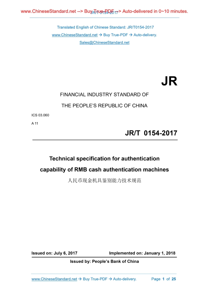 JR/T 0154-2017: Technical specification for authentication capability of RMB cash authentication machines Delivery: 9 seconds. True-PDF full-copy in English & invoice will be downloaded + auto-delivered via email. See step-by-step procedure Status: Valid