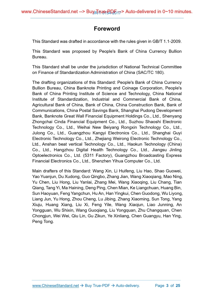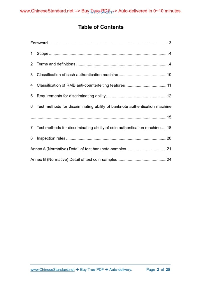 Similar standardsJR/T 0154-2017: Technical specification for authentication capability of RMB cash authentication machines---This is an excerpt. Full copy of true-PDF in English version (including equations, symbols, images, flow-chart, tables, and figures etc.), auto-downloaded/delivered in 9 seconds, can be purchased online: https://www.ChineseStandard.net/PDF.aspx/JRT0154-2017 JR FINANCIAL INDUSTRY STANDARD OF THE PEOPLE’S REPUBLIC OF CHINA ICS 03.060 A 11 Technical specification for authentication capability of RMB cash authentication machines Issued on: JULY 6, 2017 Implemented on: JANUARY 1, 2018 Issued by. People’s Bank of China Table of ContentsForeword ... 3 1 Scope ... 4 2 Terms and definitions ... 4 3 Classification of cash authentication machine ... 10 4 Classification of RMB anti-counterfeiting features ... 11 5 Requirements for discriminating ability ... 12 6 Test methods for discriminating ability of banknote authentication machine ... 15 7 Test methods for discriminating ability of coin authentication machine ... 18 8 Inspection rules ... 20 Annex A (Normative) Detail of test banknote-samples ... 21 Annex B (Normative) Detail of test coin-samples ... 24ForewordThis Standard was drafted in accordance with the rules given in GB/T 1.1-2009. This Standard was proposed by People's Bank of China Currency Bullion Bureau. This Standard shall be under the jurisdiction of National Technical Committee on Finance of Standardization Administration of China (SAC/TC 180). The drafting organizations of this Standard. People's Bank of China Currency Bullion Bureau, China Banknote Printing and Coinage Corporation, People's Bank of China Printing Institute of Science and Technology, China National Institute of Standardization, Industrial and Commercial Bank of China, Agricultural Bank of China, Bank of China, China Construction Bank, Bank of Communications, China Postal Savings Bank, Shanghai Pudong Development Bank, Banknote Great Wall Financial Equipment Holdings Co., Ltd., Shenyang Zhongchai Cinda Financial Equipment Co., Ltd., Suzhou Shaoshi Electronic Technology Co., Ltd., Weihai New Beiyang Rongxin Technology Co., Ltd., Julong Co., Ltd., Guangzhou Kangyi Electronics Co., Ltd., Shanghai Guyi Electronic Technology Co., Ltd., Zhejiang Weirong Electronic Technology Co., Ltd., Anshan beat vertical Technology Co., Ltd., Haokun Technology (China) Co., Ltd., Hangzhou Digital Health Technology Co., Ltd., Jiangsu Jinling Optoelectronics Co., Ltd. (5311 Factory), Guangzhou Broadcasting Express Financial Electronics Co., Ltd., Shenzhen Yihua Computer Co., Ltd. Main drafters of this Standard. Wang Xin, Li Huifeng, Liu Hao, Shao Guowei, Yao Yuanjun, Du Xudong, Guo Qingbo, Zhang Jian, Wang Xiaoqiang, Mao Ning, Yu Chen, Liu Hong, Liu Yanlai, Zhang Mei, Wang Xiaoqing, Liu Chang, Tian Qiang, Tang Yi, Ma Haining, Deng Ping, Chen Mian, Ke Liangchuan, Huang Bin, Sun Haoyuan, Feng Yangchun, Hu An, Han Yingkui, Chen Guodong, Wu Liyong, Liang Jun, Yu Hong, Zhou Cheng, Lu Jibing, Zhang Xiaoming, Sun Tong, Yang Xiuju, Huang Xiang, Liu Xi, Feng Yile, Wang Xiaojun, Liao Junning, An Yongguan, Wu Shixin, Wang Guoqiang, Liu Yongquan, Zhu Changquan, Chen Chongjun, Wei Wei, Qiu Lin, Gu Zikun, Ye Xinliang, Chen Guangyu, Han Ying, Peng Tong. Technical specification for authentication capability of RMB cash authentication machines1 ScopeThis Standard specifies the technical requirements, test methods and inspection rules for authentication capability of RMB cash authentication machines. This Standard is applicable to cash authentication machines with RMB authentication capability, including banknote authentication machine and coin authentication machine.2 Terms and definitionsFor the purposes of this document, the following terms and definitions apply. 2.1 banknote printed, circulating currency issued by the People's Bank of China and printed on the basis of specific substrates 2.2 coin circulating currency issued by the People's Bank of China on the basis of metal or other synthetic materials 2.3 forged currency counterfeit, altered currency 2.4 cash authentication machine cash-based processing equipment with true and false authentication functions, including banknote identification machines and coin identification machines 2.5 banknote authentication machine a cash machine for processing banknotes, including authentication machine processing batches of banknotes and authentication device processing single banknote 2.6 authentication machine processing batches of banknotes 2.23 coin sample for specific test a coin sample for one or more machine read anti-counterfeiting feature design, designed and produced by the People’s Bank of China, used for the identification ability test of coin authentication machine 2.24 test coin counterfeit a test forged coin collected, appraised and organized by the People's Bank of China, used for the identification ability test of coin authentication machine 2.25 coin sample for discriminating test a set of test coins selected from samples for specific test and test counterfeit, used for tests of unread discrimination rate and misread discrimination rate of coin authentication machine 2.26 discriminating speed the working speed of the cash machine when all authentication functions are turned on 2.27 unread discrimination rate the ratio of the number that the device continues operating within a specified time, checks a specified number of banknote samples or coin samples, identifies the test banknote or the test coin as genius TO the actual inventory number of differential test samples or the number of coin samples for discriminating test 2.28 misread discrimination rate the ratio of the number that the device continues operating within a specified time, checks a specified number of samples or coin samples, identifies true currency as forged currency TO the number of actual count of true currency 2.29 reject rate that ratio of the number of banknote sample or coin sample that the devi