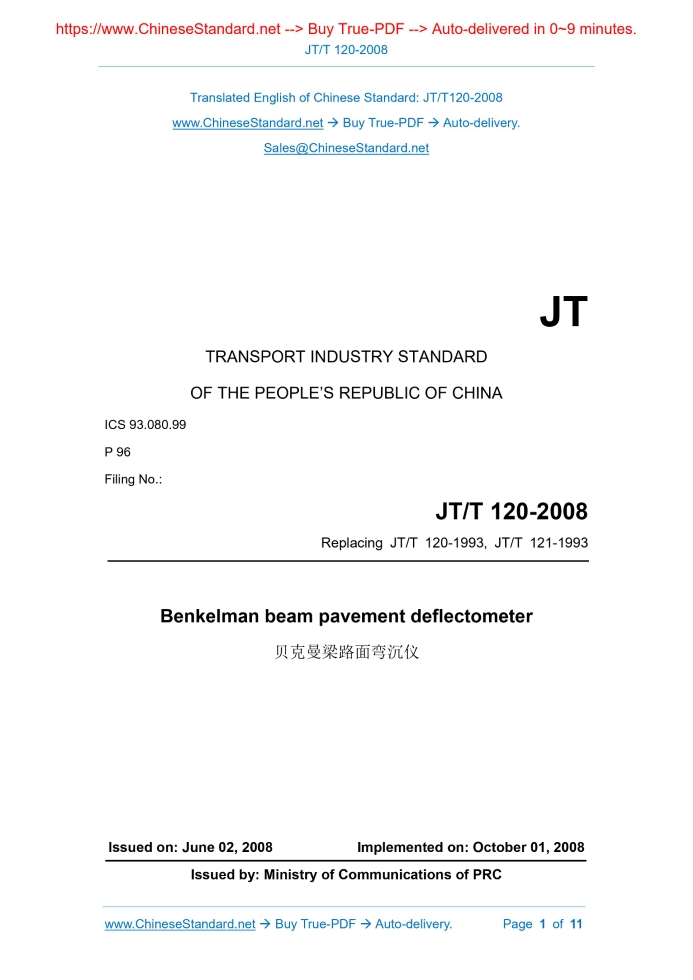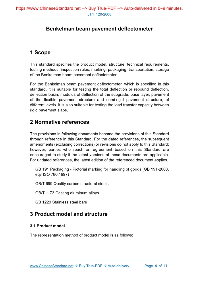 JT/T 120-2008: Benkelman beam pavement deflectometer---This is an excerpt. Full copy of true-PDF in English version (including equations, symbols, images, flow-chart, tables, and figures etc.), auto-downloaded/delivered in 9 seconds, can be purchased online: https://www.ChineseStandard.net/PDF.aspx/JTT120-2008JT TRANSPORT INDUSTRY STANDARD OF THE PEOPLE’S REPUBLIC OF CHINA ICS 93.080.99 P 96 Filing No.: Replacing JT/T 120-1993, JT/T 121-1993 Benkelman beam pavement deflectometer ISSUED ON: JUNE 02, 2008 IMPLEMENTED ON: OCTOBER 01, 2008 Issued by: Ministry of Communications of PRC Table of ContentsForeword ... 3 1 Scope ... 4 2 Normative references ... 4 3 Product model and structure ... 4 4 Technical requirements ... 5 5 Test method ... 7 6 Inspection rules ... 10 7 Marking, packaging, transportation, storage ... 10 Benkelman beam pavement deflectometer1 ScopeThis standard specifies the product model, structure, technical requirements, testing methods, inspection rules, marking, packaging, transportation, storage of the Benkelman beam pavement deflectometer. For the Benkelman beam pavement deflectometer, which is specified in this standard, it is suitable for testing the total deflection or rebound deflection, deflection basin, modulus of deflection of the subgrade, base layer, pavement of the flexible pavement structure and semi-rigid pavement structure, of different levels. It is also suitable for testing the load transfer capacity between rigid pavement slabs.2 Normative referencesThe provisions in following documents become the provisions of this Standard through reference in this Standard. For the dated references, the subsequent amendments (excluding corrections) or revisions do not apply to this Standard; however, parties who reach an agreement based on this Standard are encouraged to study if the latest versions of these documents are applicable. For undated references, the latest edition of the referenced document applies. GB 191 Packaging - Pictorial marking for handling of goods (GB 191-2000, eqv ISO 780:1997) GB/T 699 Quality carbon structural steels GB/T 1173 Casting aluminum alloys GB 1220 Stainless steel bars3 Product model and structure3.1 Product model The representation method of product model is as follows: According to the effective length of the measuring lever, the Benkelman beam pavement deflectometer is divided into two models: WC-3600 and WC-5400. 3.2 Structure The Benkelman beam pavement deflectometer consists of the following parts, as shown in Figure 1. a) Probe structure; b) Probe beam; c) Beam support; d) End structure; e) Dial indicator holder.4 Technical requirements4.1 Appearance 4.1.1 The color of the instrument shall be silver-gray. The painted surface shall be smooth AND uniform in color. The paint layer shall not have holiday, blisters, scratches, or falling off. The support axis's adjustment screws and the dial indicator frame base's height adjustment bolts shall not be corroded. 4.1.2 The connection of the front and rear beams shall be smooth and firm. There shall be no looseness. The base of the dial indicator frame shall be firmly connected with the screw, AND be perpendicular to the base plane of the dial indicator frame. The leveling bubble shall not be broken; the bubble shall move sensitively. 4.1.3 The accuracy level of the dial indicator, which is used in the Benkelman beam pavement deflectometer, is level 1. It shall be accompanied with the product qualification certificate and verification certificate. Effective length of the measurement lever, in millimetres Product code, W - bend, C - sink 4.3.1 The material of the detection beam shall be selected in accordance with GB/T 1173; its flatness tolerance level is 11. 4.3.2 The material of the support's center shaft shall be selected according to GB/T 699. 4.3.3 The dial indicator's adjusting bolts and dial indicator frame for the probe AND end structure shall be selected according to GB 1220. 4.3.4 The surface roughness (Ra) of the connecting surface of the front and rear beams shall be 1.6 µm. 4.3.5 The matching diameter BETWEEN the center shaft hole of the rear beam support AND the outer ring of the bearing is Φ22 mm. The matching diameter BETWEEN the center shaft of the rear beam support AND the inner ring of the bearing is Φ8 mm. The tolerance matching level is H7.5 Test method5.1 Testing instruments and appliances It includes the following instruments and appliances: a) Dial indicator: Level 0, range 0 ~ 3 mm; b) Gauge block: Level 4, one for 5 mm and one for 10 mm; c) Vernier caliper: Graduation value 0.02 mm; range 0 ~ 200 mm; d) Steel ruler: Range 0 ~ 10 m; e) Weight: 2 N ± 0.01 N; f) Lifting support platform: It can ensure that the platform rises or falls evenly, when it is manually operated. 5.2 Appearance inspection Use visual inspection and manual methods, to check the appearance of the Benkelman beam pavement deflectometer. It shall meet the requirements of 4.1. 5.3 Testing of maximum allowable error The testing steps are as follows: a) Place the instrument as shown in Figure 2. Adjust the support, to center the bubble. Adjust the dial gauges at both ends to zero; Table 1. 5.6 Testing of instrument length Use a steel ruler to measure the horizontal distance, BETWEEN the front end of the probe AND the center of the shaft hole of the support, as well as the horizontal distance, BETWEEN the center of the measuring rod's hole of the indicator AND the center of the shaft hole of the support. The results shall meet the requirements of Table 1. 5.7 Testing of vertical deflection The testing steps are as follows: a) Front lever: Put the beam in the measuring state. Place the dial indicator at 1/2 of the length of the front lever. Set the indicator to zero. Then hang a 2N weight there. Record the reading of the dial indicator. For the 3.6 m beam, its value shall not be greater than 0.05 mm. For the 5.4 m beam, its value shall not be greater than 0.1 mm. b) Rear lever: Put the beam i
