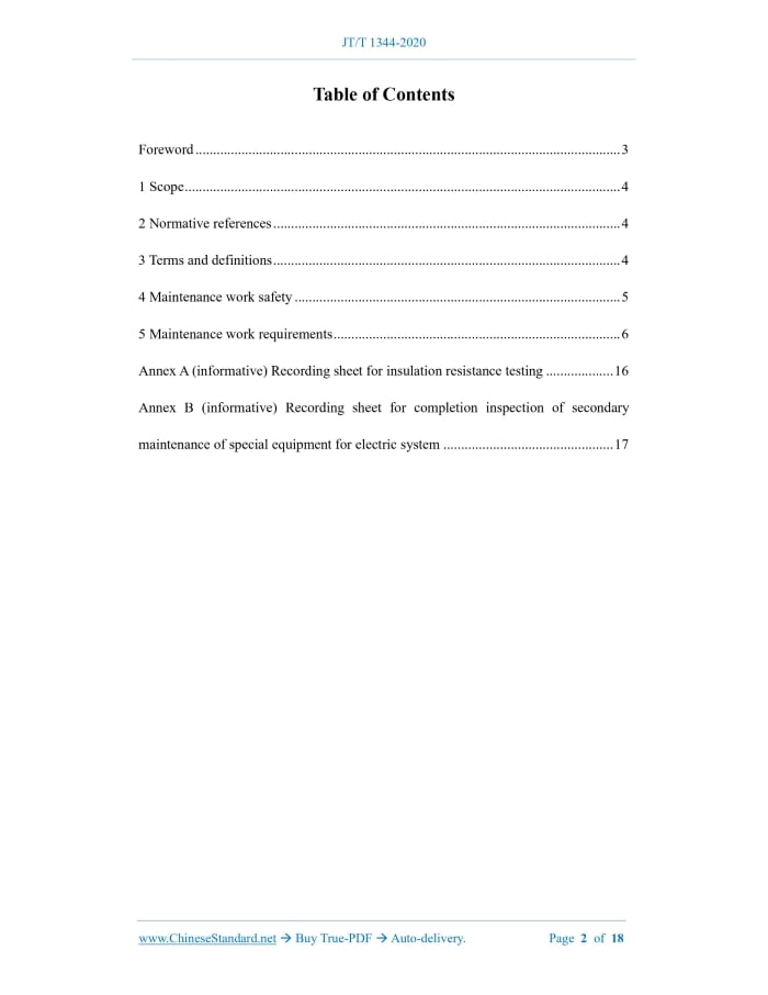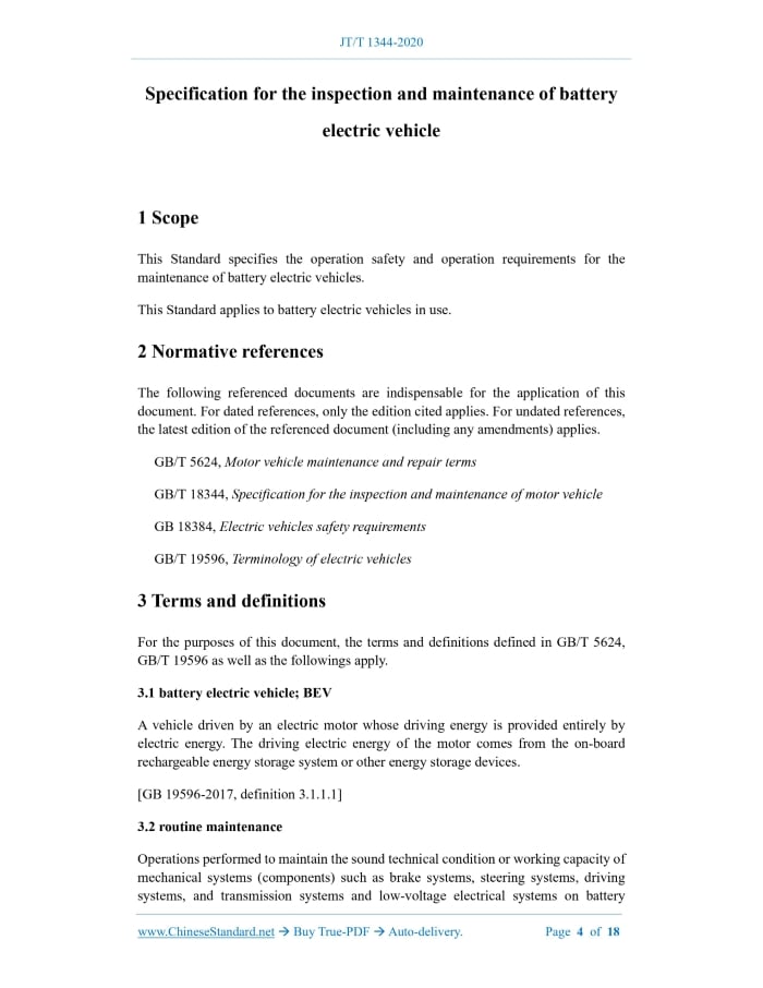Similar standardsJT/T 1344-2020: Specification for the inspection and maintenance of battery electric vehicle---This is an excerpt. Full copy of true-PDF in English version (including equations, symbols, images, flow-chart, tables, and figures etc.), auto-downloaded/delivered in 9 seconds, can be purchased online: https://www.ChineseStandard.net/PDF.aspx/JTT1344-2020JT TRANSPORTATION INDUSTRY STANDARD OF THE PEOPLE’S REPUBLIC OF CHINA ICS 43.180 R 16 Specification for the inspection and maintenance of battery electric vehicle ISSUED ON: OCTOBER 30, 2020 IMPLEMENTED ON: FEBRUARY 01, 2021 Issued by: Ministry of Transport of the People's Republic of China Table of ContentsForeword ... 3 1 Scope ... 4 2 Normative references ... 4 3 Terms and definitions ... 4 4 Maintenance work safety ... 5 5 Maintenance work requirements ... 6 Annex A (informative) Recording sheet for insulation resistance testing ... 16 Annex B (informative) Recording sheet for completion inspection of secondary maintenance of special equipment for electric system ... 17 Specification for the inspection and maintenance of battery electric vehicle1 ScopeThis Standard specifies the operation safety and operation requirements for the maintenance of battery electric vehicles. This Standard applies to battery electric vehicles in use.2 Normative referencesThe following referenced documents are indispensable for the application of this document. For dated references, only the edition cited applies. For undated references, the latest edition of the referenced document (including any amendments) applies. GB/T 5624, Motor vehicle maintenance and repair terms GB/T 18344, Specification for the inspection and maintenance of motor vehicle GB 18384, Electric vehicles safety requirements GB/T 19596, Terminology of electric vehicles3 Terms and definitionsFor the purposes of this document, the terms and definitions defined in GB/T 5624, GB/T 19596 as well as the followings apply. 3.1 battery electric vehicle; BEV A vehicle driven by an electric motor whose driving energy is provided entirely by electric energy. The driving electric energy of the motor comes from the on-board rechargeable energy storage system or other energy storage devices. [GB 19596-2017, definition 3.1.1.1] 3.2 routine maintenance Operations performed to maintain the sound technical condition or working capacity of mechanical systems (components) such as brake systems, steering systems, driving systems, and transmission systems and low-voltage electrical systems on battery electric vehicles. 3.3 maintenance of special equipment for electric system Operations performed to maintain the sound technical condition or working capacity of the high-voltage system and its related accessories on battery electric vehicles.4 Maintenance work safety4.1 The maintenance work site shall be dry. Set up warning isolation areas and warning signs. 4.2 The maintenance work area shall be equipped with fire-fighting and high-pressure protection emergency equipment, including but not limited to fire shears, fire sand, fire shovels, fire extinguishers, gas masks and insulating rods, etc. 4.3 The maintenance operators for the high-voltage system of battery electric vehicle (hereinafter referred to as "high-voltage system") shall obtain an electrician special operation certificate and take up their posts after passing professional training. 4.4 When maintaining the high-voltage system, no less than 2 people shall cooperate to operate it. Maintenance operators shall abide by electrical safety operating regulations. 4.5 High-voltage system maintenance operators shall wear safety protective equipment and use working tools with insulation protection. It is forbidden to wear metal jewelry for work. Safety protection equipment shall include, but not limited to, insulating gloves (with a withstand voltage rating above 1000 V), insulating shoes, eye protectors, safety helmets, etc. Protective equipment and work tools shall be undamaged and insulated effectively. 4.6 Before maintenance work on the high-voltage system, the vehicle shall be powered off in the order of turning off the main control switch of the vehicle power supply, disconnecting the positive and negative poles of the auxiliary battery or closing the switch handle of the auxiliary battery, and turning off the high-voltage maintenance switch (or in accordance with the order specified in the vehicle maintenance manual). After confirming that the positive and negative pole voltages of the high-voltage output line system of the traction battery are lower than 36 V, and the insulation resistance meets the requirements of the vehicle maintenance manual, the maintenance work can be carried out. After the maintenance work is completed, the vehicle shall be powered on and reset according to the reverse sequence of vehicle power off (or the sequence specified in the vehicle maintenance manual). 4.7 If there are other special requirements for operation safety and failure protection stipulated in the vehicle maintenance manual, the relevant regulations shall also be followed.5 Maintenance work requirements5.1 General requirements 5.1.1 The maintenance of battery electric vehicles is divided into daily maintenance, primary maintenance and secondary maintenance. Daily maintenance is performed by the driver before leaving the vehicle, during driving and after receiving the vehicle. Primary maintenance and secondary maintenance are performed by professionals. 5.1.2 The primary maintenance and secondary maintenance intervals shall be determined in accordance with the vehicle maintenance manual, instruction manual and GB/T 18344, combined with the vehicle category, vehicle operating status, mileage, road conditions and service life. 5.1.3 The maintenance of battery electric vehicles is divided into routine maintenance and maintenance of special equipment for electric systems. Routine maintenance shall be carried out in accordance with the provisions of GB/T
