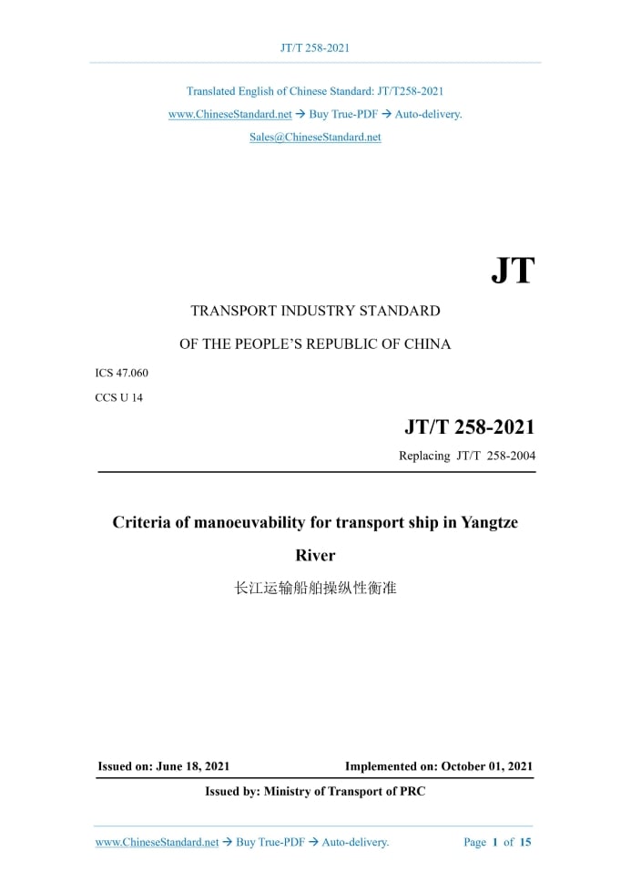 JT/T 258-2021: Criteria of manoeuvability for transport ship in Yangtze River Delivery: 9 seconds. True-PDF full-copy in English & invoice will be downloaded + auto-delivered via email. See step-by-step procedure Status: Valid JT/T 258: Historical versions