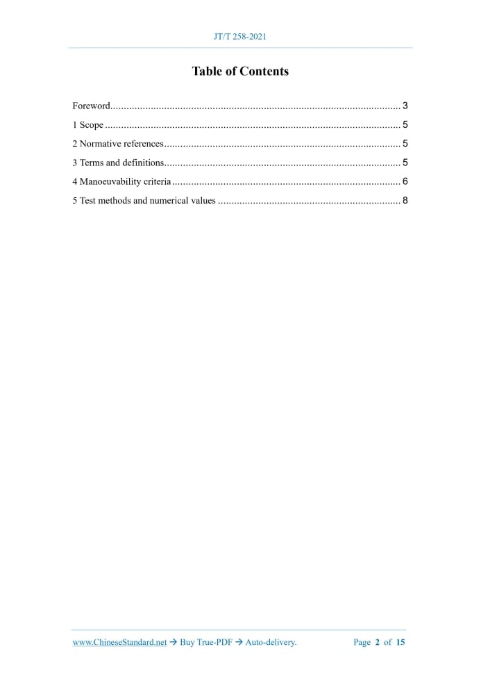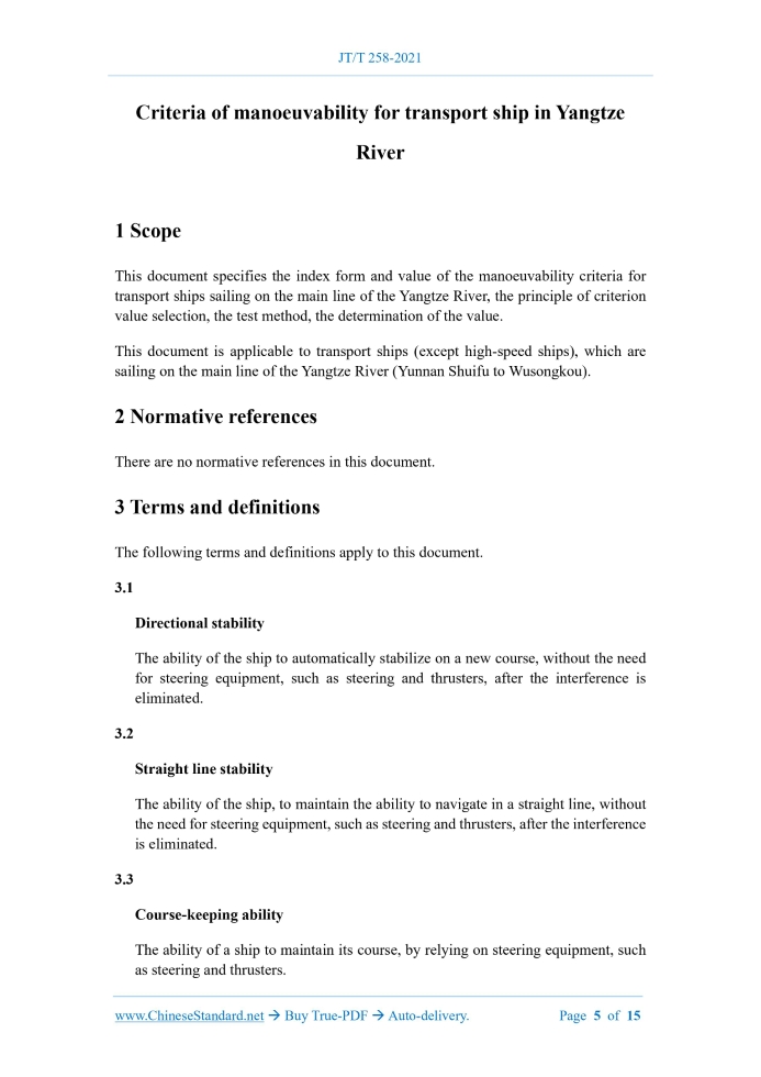 Similar standardsJT/T 258-2021: Criteria of manoeuvability for transport ship in Yangtze River---This is an excerpt. Full copy of true-PDF in English version (including equations, symbols, images, flow-chart, tables, and figures etc.), auto-downloaded/delivered in 9 seconds, can be purchased online: https://www.ChineseStandard.net/PDF.aspx/JTT258-2021TRANSPORT INDUSTRY STANDARD OF THE PEOPLE’S REPUBLIC OF CHINA ICS 47.060 CCS U 14 Replacing JT/T 258-2004 Criteria of manoeuvability for transport ship in Yangtze River ISSUED ON: JUNE 18, 2021 IMPLEMENTED ON: OCTOBER 01, 2021 Issued by: Ministry of Transport of PRC Table of ContentsForeword ... 3 1 Scope ... 5 2 Normative references ... 5 3 Terms and definitions... 5 4 Manoeuvability criteria ... 6 5 Test methods and numerical values ... 8 Criteria of manoeuvability for transport ship in Yangtze River1 ScopeThis document specifies the index form and value of the manoeuvability criteria for transport ships sailing on the main line of the Yangtze River, the principle of criterion value selection, the test method, the determination of the value. This document is applicable to transport ships (except high-speed ships), which are sailing on the main line of the Yangtze River (Yunnan Shuifu to Wusongkou).2 Normative referencesThere are no normative references in this document.3 Terms and definitionsThe following terms and definitions apply to this document. 3.1 Directional stability The ability of the ship to automatically stabilize on a new course, without the need for steering equipment, such as steering and thrusters, after the interference is eliminated. 3.2 Straight line stability The ability of the ship, to maintain the ability to navigate in a straight line, without the need for steering equipment, such as steering and thrusters, after the interference is eliminated. 3.3 Course-keeping ability The ability of a ship to maintain its course, by relying on steering equipment, such as steering and thrusters. 4.1.1.1 The form of the manoeuvability criteria for a motorized single ship includes four performances: directional stability, course-changing ability, steady-turning ability, astern stopping ability. 4.1.1.2 The form of the manoeuvability criteria of the fleet includes five performances: directional stability, course-changing ability, steady-turning ability, astern stopping ability, astern stability. 4.1.2 The form of directional stability index In the initial state of constant ship speed AND the heading direction is basically consistent with the water flow direction, use the course-changing amount (ΔC0) of sailing for 3 minutes in the state of zero rudder angle OR the average steering angle (δ0) of maintaining the course for 5 minutes, as the criterion index. 4.1.3 The form of course-changing ability index In the initial state of constant ship speed and stable heading, the single motor ship shall be subject to the Z-shaped test, according to the specified rudder angle; use the yawing index (P') as the criterion index. In the initial state of constant speed and stable heading, the fleet steers according to the specified rudder angle AND changes direction by 15°; take the average direction change angular velocity ( ), from the first move to the direction change of 15°, as the criterion index. 4.1.4 The form of steady-turning ability index When the ship is in the state of constant driving, steady speed, full rudder, steady- turning, in wide and slow-flowing waters, use the ratio ( ) -- of the diameter (D0) of the arc motion trajectory at the ship's center of gravity TO the length (L) of the ship, -- as the criterion index. 4.1.5 The form of astern stopping ability index The ship is in a wide, slow-flowing water area, from the state of constant driving at a steady speed to the state of reversing at 70% of the rated speed of the main engine; take the ratio -- of the stroke (Ah) to the ship's length ( ), -- from the start of the command to reverse to the stop of the ship's forward movement, as the criterion index. 4.1.6 The form of astern stability index When the ship sails downstream, in the initial state of parking at a low speed and the heading is stable, it drives back and steer the ship in a steady direction for 3 minutes; 5.1.2 Linear stability test or steering stability test 5.1.2.1 Test principle The ship sails at 0° rudder angle for 3 minutes, to continuously measure the change of the heading direction. OR keep the heading direction for 5 min, to continuously measure the change of the steering angle, as relative to time. 5.1.2.2 Test requirements 5.1.2.2.1 The ship test is carried out, in a straight channel, which has smooth water flow and stable flow velocity. During the test, the forward and reverse wind force shall be less than Beaufort level 3; the cross wind force shall be less than Beaufort level 2. 5.1.2.2.2 Generally, driving against the current shall prevail. If necessary, two to three repeated tests can be carried out. 5.1.2.2.3 Before starting the test, the ship is to maintain a constant speed, a stable course, AND be parallel to the direction of the water flow. 5.1.2.2.4 The difference in rotational speed of each propeller in ships, which have two or more propellers, is to be less than 1% of the rated rotational speed. 5.1.3 Course-changing ability test 5.1.3.1 Test principle The motorized single ship and the fleet respectively conduct Z-shaped tests, according to the specified rudder angle, to completely measure the time-varying curve of the rudder angle and heading angle, including the overtaking angle, the delay time of turning, the position of the characteristic point. 5.1.3.2 Test requirements 5.1.3.2.1 The ship test is to be carried out in a wide and straight channel, which has smooth water flow and stable flow velocity. The wind force during the test shall be less than Beaufort level 3. 5.1.3.2.2 The test is generally based on reverse current driving. When conditions permit, it can be tested under two driving 