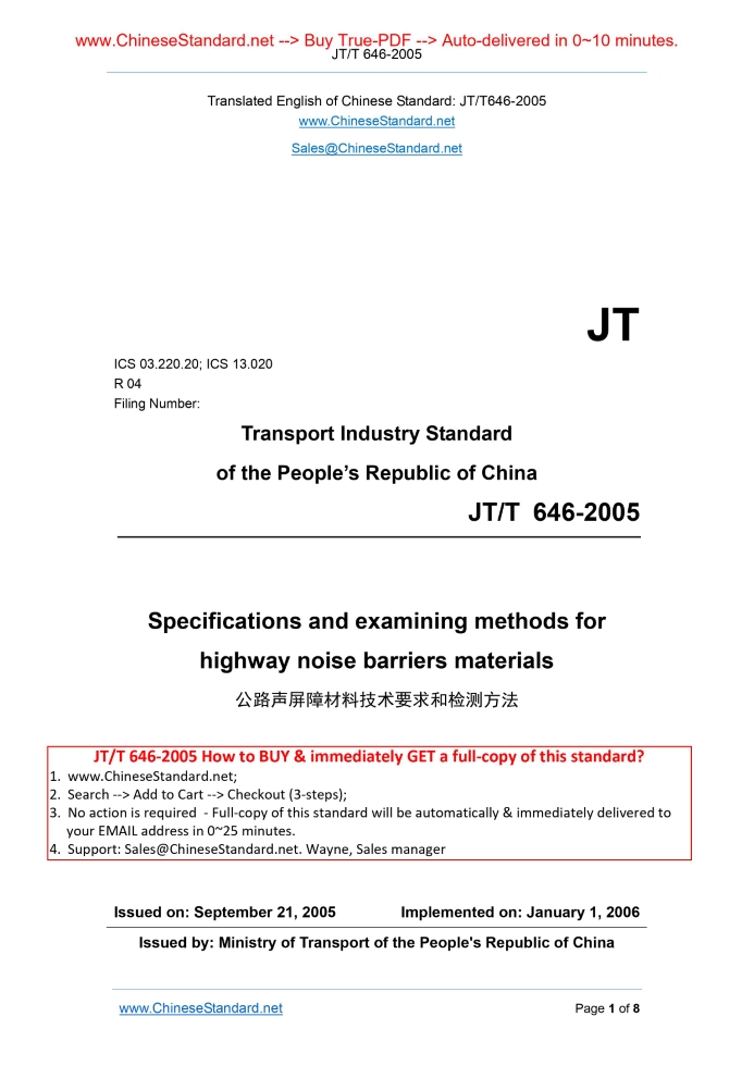 JT/T 646-2005: Specifications and examining methods for highway noise barriers materials Delivery: 9 seconds. True-PDF full-copy in English & invoice will be downloaded + auto-delivered via email. See step-by-step procedure Status: Obsolete JT/T 646: Historical versions