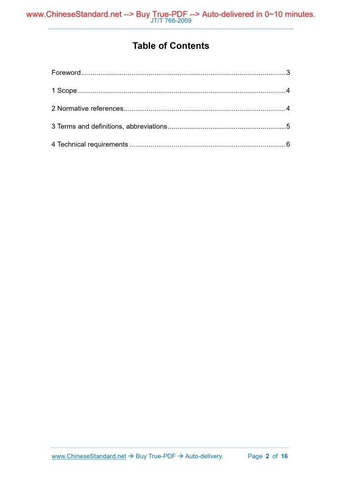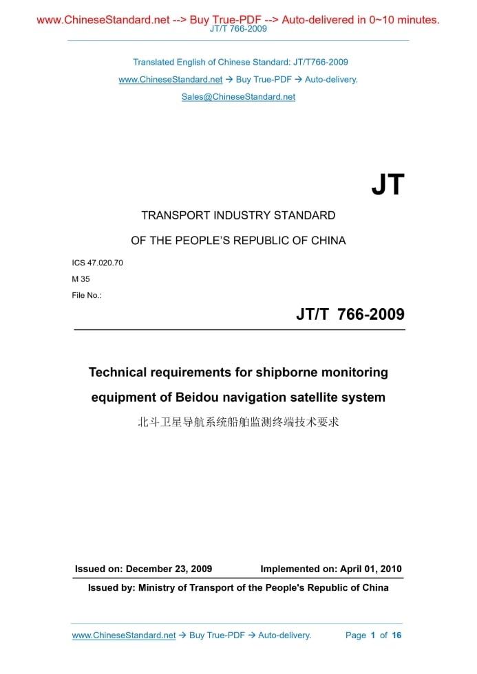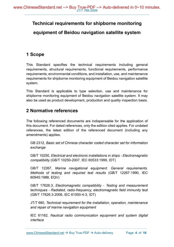 JT/T 766-2009: Technical requirements for shipborne monitoring equipment of Beidou navigation satellite system---This is an excerpt. Full copy of true-PDF in English version (including equations, symbols, images, flow-chart, tables, and figures etc.), auto-downloaded/delivered in 9 seconds, can be purchased online: https://www.ChineseStandard.net/PDF.aspx/JTT766-2009 JT TRANSPORT INDUSTRY STANDARD ICS 47.020.70 M 35 File No.. Technical requirements for shipborne monitoring equipment of Beidou navigation satellite system Issued on: DECEMBER 23, 2009 Implemented on: APRIL 01, 2010 Issued by. Ministry of Transport of the People's Republic of China Table of ContentsForeword... 3 1 Scope... 4 2 Normative references... 4 3 Terms and definitions, abbreviations... 5 4 Technical requirements... 6 Technical requirements for shipborne monitoring equipment of Beidou navigation satellite system1 ScopeThis Standard specifies the technical requirements including general requirements, structural requirements, functional requirements, performance requirements, environmental conditions, and installation, use, and maintenance requirements for shipborne monitoring equipment of Beidou navigation satellite system. This Standard is applicable to type selection, use and maintenance for shipborne monitoring equipment of Beidou navigation satellite system. It may also be used as product development, production and quality inspection basis.2 Normative referencesThe following referenced documents are indispensable for the application of this document. For dated references, only the edition cited applies. For undated references, the latest edition of the referenced document (including any amendments) applies. GB 2312, Basic set of Chinese character coded character set for information exchange GB/T 10250, Electrical and electronic installations in ships - Electromagnetic compatibility (GB/T 10250-2007, IEC 60533.1999, IDT) GB/T 12267, Marine navigational equipment. General requirements. Methods of testing and required test results (GB/T 12267-1990, IEC 60945.1988, EQV) GB/T 17626.3, Electromagnetic compatibility - Testing and measurement techniques - Radiated, radio-frequency, electromagnetic field immunity test (GB/T 17626.3-2006, IEC 61000-4-3, IDT) JT/T 680, Technical requirement for the installation, operation, maintenance and repair of marine navigation equipment IEC 61162, Nautical radio communication equipment and system digital interface GSM - Global System for Mobile Communications; MTBF - Mean Time Between Failures; MTBR - Mean Time Between Repairs; PDOP - Positional Dilution of Precision; PPS - Pulse Per Second; TTFF - Time to First Fix; UTC - Universal Time Coordinated; VHF - Very High Frequency; WGS-84 - World Geodetic System, 1984.4 Technical requirements4.1 General requirements 4.1.1 The receiver shall work reliably and be easy to operate and maintain. 4.1.2 The receiver shall have self-test function. 4.2 Structural requirements 4.2.1 Monitoring terminal antenna and host are in split design. There is cable connection between the antenna and the host. The receiving and transmitting antennas shall be structurally integrated. 4.2.2 The operation display screen shall be able to adjust the brightness until it is off. 4.2.3 There shall be no obvious depressions, scratches, cracks, deformations, etc. on the surface. The surface coating shall not blister, crack and fall off. Metal parts shall not be corroded or mechanically damaged. 4.3 Functional requirements 4.3.1 Self-test and data retention 4.3.1.1 The monitoring terminal has power-on self-test and working condition inspection as well as initialization and condition setting functions. In case of failure, the fault alarm and fault type shall be given in real time, and the prompt shall be given through visual and audio or data interface output. The monitoring terminal shall be able to complete the following location polling function. a) After receiving the position polling command issued by the authorized user, the monitoring terminal automatically calculates the shipborne position, speed and heading according to the requirements in the command and sends it to the authorized user through the communication module. Automatic stop position transmission when receiving a stop position polling command from an authorized user; b) When the monitoring terminal successfully sends the positioning information, it shall be able to give visual or audible prompts according to the settings. 4.3.6.4 Without positioning prompts When the monitoring terminal is unable to locate, it shall be able to give visual or audible prompts according to the settings. 4.3.6.5 Positioning storage According to the first-in-first-out principle, it has the function of dynamically storing recent historical location information. 4.3.6.6 Waypoint function The monitoring terminal shall be able to set and store the waypoints and calculate the distance, bearing, waiting time and estimated arrival time of the arriving waypoints. 4.3.7 Alarm function The alarm functions of the monitoring terminal are as follows. a) All monitoring terminals shall be set with distress alert button. In case of emergency or distress, the monitoring terminal shall send a distress alert message to the Beidou satellite navigation system and the management terminal under the trigger of the alarm activation signal. The distress message shall include at least the positioning time, shipborne position and ship identification; b) The monitoring terminal shall be able to initiate continuous transmission of position information to the Beidou satellite navigation system and the management terminal under the trigger of the alarm activation signal. Sending frequency is 5s. Stop receiving positioning information after receiving the Beidou satellite navigation system or management terminal command. Performance requirements for receive antenna. a) Beam width. 5°~90° in the pitch direction and 0°~360° in the horizontal direction; b) Pol