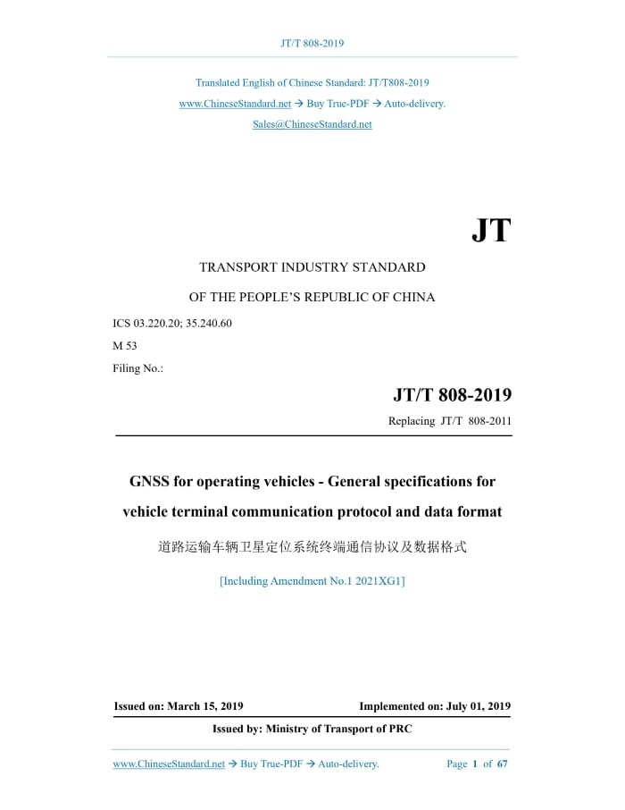 JT/T 808-2019: [Including 2021XG] GNSS for operating vehicles - General specifications for vehicle terminal communication protocol and data format Delivery: 9 seconds. True-PDF full-copy in English & invoice will be downloaded + auto-delivered via email. See step-by-step procedure Status: Valid JT/T 808: Historical versions