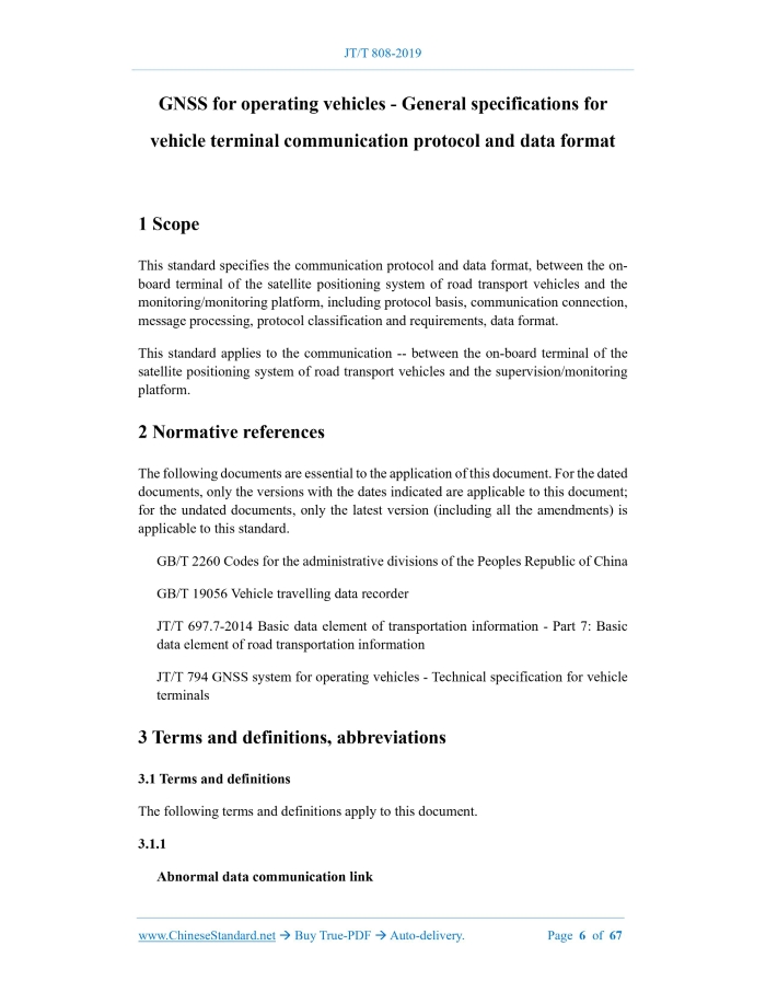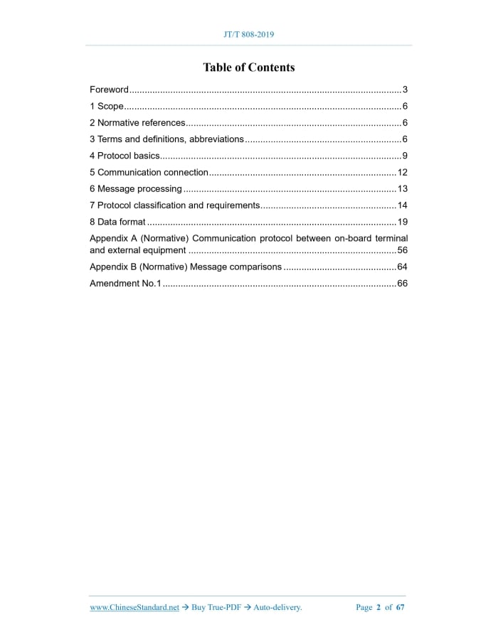Similar standardsJT/T 808-2019: [Including 2021XG] GNSS for operating vehicles - General specifications for vehicle terminal communication protocol and data format---This is an excerpt. Full copy of true-PDF in English version (including equations, symbols, images, flow-chart, tables, and figures etc.), auto-downloaded/delivered in 9 seconds, can be purchased online: https://www.ChineseStandard.net/PDF.aspx/JTT808-2019 JT TRANSPORT INDUSTRY STANDARD ICS 03.220.20; 35.240.60 M 53 Filing No.. Replacing JT/T 808-2011 GNSS for operating vehicles - General specifications for vehicle terminal communication protocol and data format [Including Amendment No.1 2021XG1] Issued on. MARCH 15, 2019 Implemented on. JULY 01, 2019 Issued by. Ministry of Transport of PRC Table of ContentsForeword... 3 1 Scope... 6 2 Normative references... 6 3 Terms and definitions, abbreviations... 6 4 Protocol basics... 9 5 Communication connection... 12 6 Message processing... 13 7 Protocol classification and requirements... 14 8 Data format... 19 Appendix A (Normative) Communication protocol between on-board terminal and external equipment... 56 Appendix B (Normative) Message comparisons... 64 Amendment No.1... 661 ScopeThis standard specifies the communication protocol and data format, between the on- board terminal of the satellite positioning system of road transport vehicles and the monitoring/monitoring platform, including protocol basis, communication connection, message processing, protocol classification and requirements, data format. This standard applies to the communication -- between the on-board terminal of the satellite positioning system of road transport vehicles and the supervision/monitoring platform.2 Normative referencesThe following documents are essential to the application of this document. For the dated documents, only the versions with the dates indicated are applicable to this document; for the undated documents, only the latest version (including all the amendments) is applicable to this standard. GB/T 2260 Codes for the administrative divisions of the Peoples Republic of China GB/T 19056 Vehicle travelling data recorder JT/T 697.7-2014 Basic data element of transportation information - Part 7.Basic data element of road transportation information JT/T 794 GNSS system for operating vehicles - Technical specification for vehicle terminals3 Terms and definitions, abbreviations3.1 Terms and definitions The following terms and definitions apply to this document. 3.1.1 Abnormal data communication link The state in which the wireless communication link is disconnected, or temporarily suspended (such as during a call). 3.1.2 Register An operation that the terminal sends a message to the platform, informing that it is installed on a certain vehicle. 3.1.3 Unregister An operation that the terminal sends a message to the platform to inform the removal from the installed vehicle. 3.1.4 Authentication When the terminal is connected to the platform, it sends a message to the platform to verify its identity, at the same time reports the version of the protocol currently used to communicate with the platform. 3.1.5 Location reporting strategy Rules for timed, distanced reporting or a combination of both. 3.1.6 Location reporting program The rules for determining the location reporting interval, according to the location reporting strategy.4 Protocol basics4.1 Communication method The communication method, which is adopted by the protocol, shall comply with the relevant requirements in JT/T 794.The communication protocol shall adopt TCP or UDP, the supervision/monitoring platform (hereinafter referred to as the "platform") shall serve as the server end, whilst the on-board terminal of the road transport's vehicle satellite positioning system (hereinafter referred to as "the terminal") serves as the client. When the data communication link is abnormal, the terminal can use SMS messages to communicate. 4.2 Data types The data types, which are used in protocol messages, are as shown in Table l. 4.3 Transmission rules The protocol shall communicate words and doublewords in big-endian network byte order. The transmission rules are agreed as follows. 4.4 Composition of messages 4.4.1 Message structure Each message is composed of identification bit, message header, message body, check code. The message structure is as shown in Figure 1. Identification bit Message header Message body Check code Identification bit 4.4.2 Identification bit The identification bit shall be represented by 0x7e. If 0x7e and 0x7d appear in the check code, message header, message body, escape processing is required. The escaping rules are defined as follows. 4.4.3 Message header 4.4.3.1 See Table 2 for the content of the message header. 4.4.3.2 The message body's attribute format structure is as shown in Figure 2. 4.4.4 Message body The format and content of each different command message body is determined by each command, see Chapter 7 for specific requirements. 4.4.5 Check code The calculation rule of the check code shall start from the first byte of the message header, XOR operation with the next byte, until the end of the last byte of the message body; the length of the check code is one byte.5 Communication connection5.1 Connection establishment The daily data connection -- between the terminal and the platform -- can use TCP or UDP. After the terminal is reset, it shall establish a connection with the platform. After the connection is established, it will immediately send a terminal authentication message to the platform, for authentication. 5.2 Maintenance of connection After the connection is established and the terminal authentication is successful, the terminal shall periodically send a terminal heartbeat message to the platform; the platform will send a platform general response message to the terminal, after receiving it; the sending period is specified by the terminal parameters. 5.3 Disconnection of connection Both the platfo