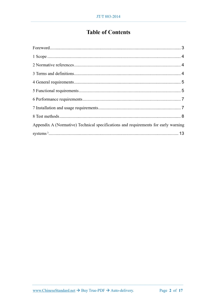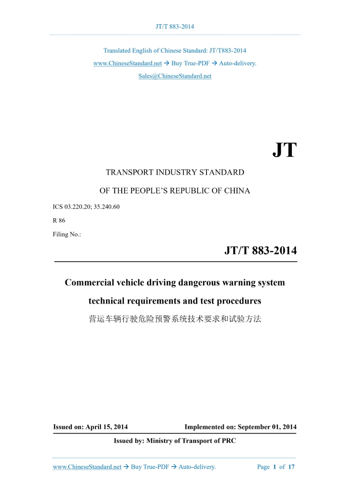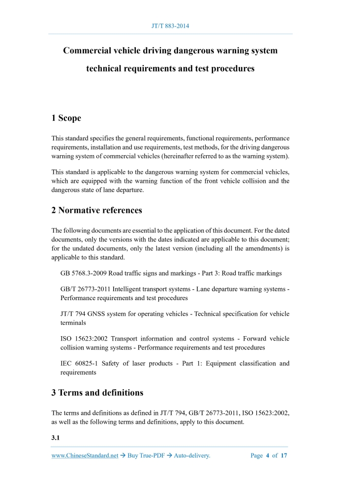 Similar standardsJT/T 883-2014: Commercial vehicle driving dangerous warning system technical requirements and test procedures---This is an excerpt. Full copy of true-PDF in English version (including equations, symbols, images, flow-chart, tables, and figures etc.), auto-downloaded/delivered in 9 seconds, can be purchased online: https://www.ChineseStandard.net/PDF.aspx/JTT883-2014 TRANSPORT INDUSTRY STANDARD ICS 03.220.20; 35.240.60 R 86 Filing No.. Commercial vehicle driving dangerous warning system technical requirements and test procedures Issued on. APRIL 15, 2014 Implemented on. SEPTEMBER 01, 2014 Issued by. Ministry of Transport of PRC Table of ContentsForeword... 3 1 Scope... 4 2 Normative references... 4 3 Terms and definitions... 4 4 General requirements... 5 5 Functional requirements... 5 6 Performance requirements... 7 7 Installation and usage requirements... 7 8 Test methods... 8 Appendix A (Normative) Technical specifications and requirements for early warning systems)... 13ForewordThis standard was drafted in accordance with the rules given in GB/T 1.1-2009. This standard was proposed by AND shall be under the jurisdiction of the National Road Transport Standardization Technical Committee (SAC/TC 521). Drafting organization of this standard. Highway Research Institute of Ministry of Transport. Participating drafting organizations of this standard. Tsinghua University State Key Laboratory of Automobile Safety and Energy Conservation, Technology Center of China FAW Co., Ltd., Dongguan Meibaoyu Automotive Intelligent Technology Co., Ltd. The main drafters of this standard. Liu Yingji, Cai Fengtian, Zhou Zhai, Yao Yu, Zhang Xueli, Liu Li, Li Keqiang, Li Hongjian, Guo Wenyi, Wang Jianqiang, Liu Bin, Zhu Ming, Le Ningsheng, Ding Jieyun. Commercial vehicle driving dangerous warning system technical requirements and test procedures1 ScopeThis standard specifies the general requirements, functional requirements, performance requirements, installation and use requirements, test methods, for the driving dangerous warning system of commercial vehicles (hereinafter referred to as the warning system). This standard is applicable to the dangerous warning system for commercial vehicles, which are equipped with the warning function of the front vehicle collision and the dangerous state of lane departure.2 Normative referencesThe following documents are essential to the application of this document. For the dated documents, only the versions with the dates indicated are applicable to this document; for the undated documents, only the latest version (including all the amendments) is applicable to this standard. GB 5768.3-2009 Road traffic signs and markings - Part 3.Road traffic markings GB/T 26773-2011 Intelligent transport systems - Lane departure warning systems - Performance requirements and test procedures JT/T 794 GNSS system for operating vehicles - Technical specification for vehicle terminals ISO 15623.2002 Transport information and control systems - Forward vehicle collision warning systems - Performance requirements and test procedures IEC 60825-1 Safety of laser products - Part 1.Equipment classification and requirements3 Terms and definitionsThe terms and definitions as defined in JT/T 794, GB/T 26773-2011, ISO 15623.2002, as well as the following terms and definitions, apply to this document. 3.1 Commercial vehicle driving dangerous warning system A system, which automatically collects the speed, distance from the front vehicle, lane, other vehicle running status information, during the driving process of the commercial vehicle;4 General requirements4.1 Composition of early warning system The early warning system shall include a front vehicle collision warning module, a lane departure warning module, a data communication interface. The front vehicle collision warning module and the lane departure warning module shall transmit no less than the following information, to the on-board terminal of satellite positioning system, through the data communication interface, respectively. 4.2 Others The appearance, nameplate, text, graphics, signs, materials, enclosure protection of each module of the early warning system shall meet the requirements of JT/T 794.5 Functional requirements5.1 Self-check The early warning system shall be started, within 30 s after the vehicle is started; complete the self-check of all the main system sensors and components; clearly indicate the current working status of the early warning system, by signal lights or display screens. 5.2 Automatic calibration For a specific vehicle, the early warning system shall be able to automatically calibrate, to compensate for normal or predictable changes in vehicle load (e.g. empty/full fuel tank, trailer with/without bucket, loaded/unloaded, one or more occupants, etc.). 5.3 Front vehicle collision warning 5.3.1 The early warning system shall meet the requirements of Appendix A. 5.4 Lane departure warning 5.4.1 The function of the early warning system shall meet the requirements of Chapter 4 of GB/T 26773-2011. 5.4.2 The early warning system shall be able to detect the following lane lines, which meet the requirements of GB 5768.3-2009. 5.4.3 When driving under normal road conditions, the early warning system shall be able to detect lane lines, in lighting conditions such as in day, night, dusk, dawn. 5.4.4 When the driver has a tendency to change lanes or turn AND turn on the turn signal in the correct direction, the early warning system shall not issue a lane departure warning. 5.5 Others The early warning system shall provide the driver with a human-machine interface, including indicator lights related to the operating state of the system, alarm information of dangerous states in the form of sound/tactile/visualization, the operating/stop/fault state of the system. Indicator lights shall clearly show status in direct sunlight and at night.6 Performance requirements6.1 Overall performance The early warning system and