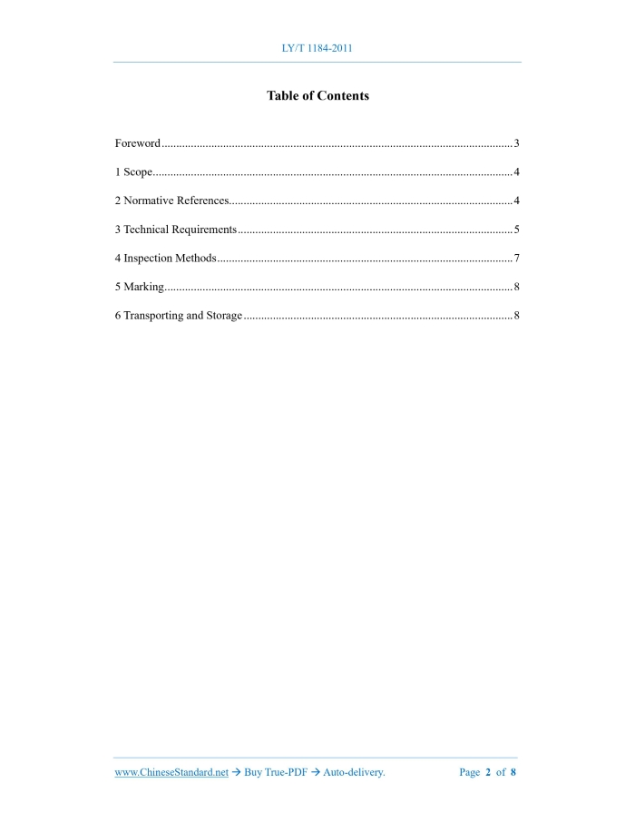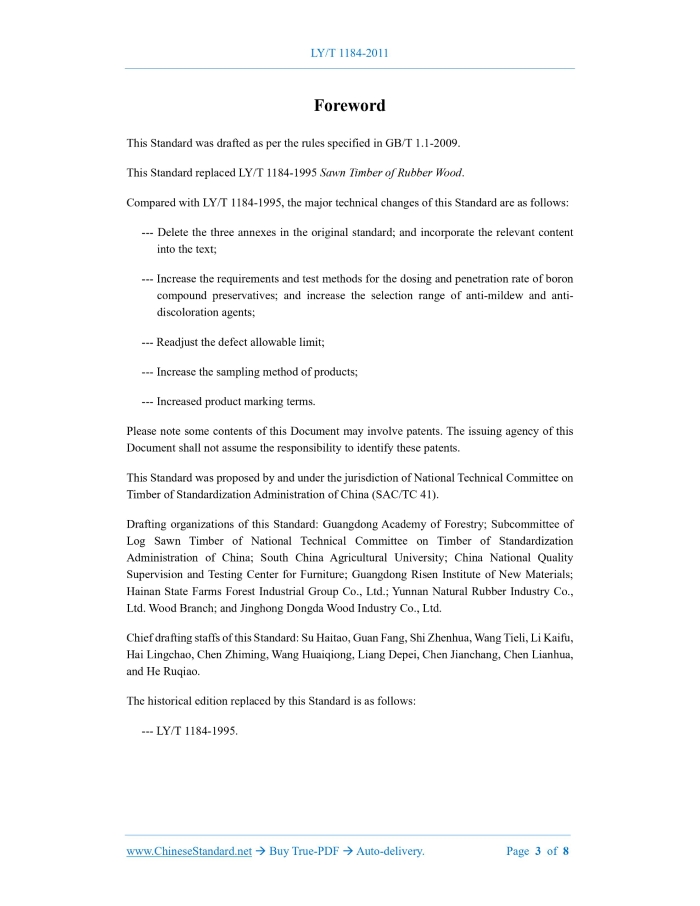 Similar standardsLY/T 1184-2011: Sawn timber of rubber wood---This is an excerpt. Full copy of true-PDF in English version (including equations, symbols, images, flow-chart, tables, and figures etc.), auto-downloaded/delivered in 9 seconds, can be purchased online: https://www.ChineseStandard.net/PDF.aspx/LYT1184-2011LY FORESTRY INDUSTRY STANDARD OF THE PEOPLE’S REPUBLIC OF CHINA ICS 79.040 B 69 Replacing LY/T 1184-1995 Sawn Timber of Rubber Wood 橡胶木锯材 ISSUED ON: JUNE 10, 2011 IMPLEMENTED ON: JULY 01, 2011 Issued by: State Forestry Administration Table of ContentsForeword ... 3 1 Scope ... 4 2 Normative References ... 4 3 Technical Requirements ... 5 4 Inspection Methods ... 7 5 Marking ... 8 6 Transporting and Storage ... 8ForewordThis Standard was drafted as per the rules specified in GB/T 1.1-2009. This Standard replaced LY/T 1184-1995 Sawn Timber of Rubber Wood. Compared with LY/T 1184-1995, the major technical changes of this Standard are as follows: --- Delete the three annexes in the original standard; and incorporate the relevant content into the text; --- Increase the requirements and test methods for the dosing and penetration rate of boron compound preservatives; and increase the selection range of anti-mildew and anti- discoloration agents; --- Readjust the defect allowable limit; --- Increase the sampling method of products; --- Increased product marking terms. Please note some contents of this Document may involve patents. The issuing agency of this Document shall not assume the responsibility to identify these patents. This Standard was proposed by and under the jurisdiction of National Technical Committee on Timber of Standardization Administration of China (SAC/TC 41). Drafting organizations of this Standard: Guangdong Academy of Forestry; Subcommittee of Log Sawn Timber of National Technical Committee on Timber of Standardization Administration of China; South China Agricultural University; China National Quality Supervision and Testing Center for Furniture; Guangdong Risen Institute of New Materials; Hainan State Farms Forest Industrial Group Co., Ltd.; Yunnan Natural Rubber Industry Co., Ltd. Wood Branch; and Jinghong Dongda Wood Industry Co., Ltd. Chief drafting staffs of this Standard: Su Haitao, Guan Fang, Shi Zhenhua, Wang Tieli, Li Kaifu, Hai Lingchao, Chen Zhiming, Wang Huaiqiong, Liang Depei, Chen Jianchang, Chen Lianhua, and He Ruqiao. The historical edition replaced by this Standard is as follows: --- LY/T 1184-1995. Sawn Timber of Rubber Wood1 ScopeThis Standard specifies the technical requirements, inspection methods, marking, transportation and storage for sawn timber of rubber wood. This Standard applies to the production, processing, circulation and use for sawn timber of rubber wood.2 Normative ReferencesThe following documents are essential to the application of this document. For the dated documents, only the versions with the dates indicated are applicable to this document; for the undated documents, only the latest version (including all the amendments) is applicable to this document. GB/T 449 Sawn Timber Volume Table GB/T 4817 Broadleaved Sawn Timber GB/T 4822 Sawn Timber Inspection GB/T 6491 Drying Quality of Sawn Timber GB/T 17659.2 Sampling and Judging Methods for Lot Inspection of Logs and Sawn Timbers -Part 2: Sampling and Judging Methods for Lot Inspection of Sawn Timbers GB/T 23229 Methods for Analysis of Waterborne Wood Preservatives LY/T 1635 Wood Preservatives LY/T 1636 Use Category and Specification for Preservative-Treated Wood SB/T 10383 Mark of Wood and Wood Products in Trading SB/T 10405 Methods for Wet Ashing Procedures for Preparing Wood for Chemical Analysis ......Source: Above contents are excerpted from the full-copy PDF -- translated/reviewed by: www.ChineseStandard.net / Wayne Zheng et al. Tips & Frequently Asked Questions:Question 1: How long will the true-PDF of English version of LY/T 1184-2011 be delivered?Answer: The full copy PDF of English version of LY/T 1184-2011 can be downloaded in 9 seconds, and it will also be emailed to you in 9 seconds (double mechanisms to ensure the delivery reliably), with PDF-invoice.Question 2: Can I share the purchased PDF of LY/T 1184-2011_English with my colleagues?Answer: Yes. The purchased PDF of LY/T 1184-2011_English will be deemed to be sold to your employer/organization who actually paid for it, including your colleagues and your employer's intranet.Question 3: Does the price include tax/VAT?Answer: Yes. Our tax invoice, downloaded/delivered in 9 seconds, includes all tax/VAT and complies with 100+ countries' tax regulations (tax exempted in 100+ countries) -- See Avoidance of Double Taxation Agreements (DTAs): List of DTAs signed between Singapore and 100+ countriesQuestion 4: Do you accept my currency other than USD?Answer: Yes. www.ChineseStandard.us -- LY/T 1184-2011 -- Click this link and select your country/currency to pay, the exact amount in your currency will be printed on the invoice. Full PDF will also be downloaded/emailed in 9 seconds.Question 5: Should I purchase the latest version LY/T 1184-2011?Answer: Yes. Unless special scenarios such as technical constraints or academic study, you should always prioritize to purchase the latest version LY/T 1184-2011 even if the enforcement date is in future. Complying with the latest version means that, by default, it also complies with all the earlier versions, technically.How to buy and download a true PDF of English version of LY/T 1184-2011?A step-by-step guide to download PDF of LY/T 1184-2011_EnglishStep 1: Visit website https://www.ChineseStandard.net (Pay in USD), or https://www.ChineseStandard.us (Pay in any currencies such as Euro, KRW, JPY, AUD).Step 2: Search keyword "LY/T 1184-2011". Step 3: Click "Add to Cart". If multiple PDFs are required, repeat steps 2 and 3 to add up to 12 PDFs to cart. Step 4: Select payment option (Via payment agents Stripe or PayPal). Step 5: Customize Tax Invoice -- Fill up you