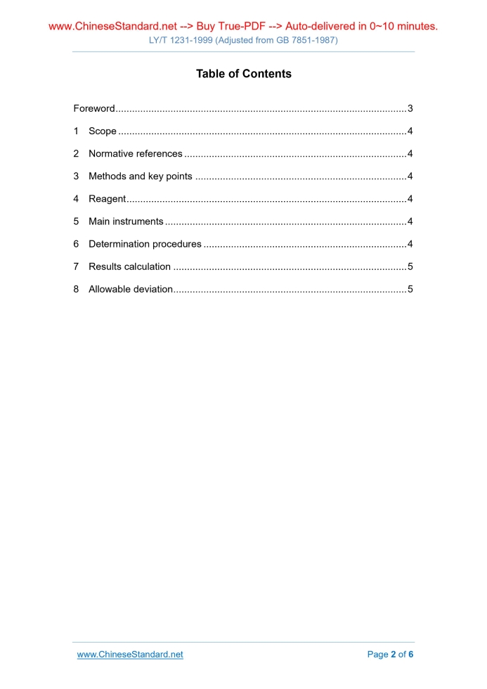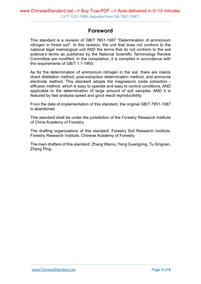 LY/T 1231-1999: Determination of ammonium nitrogen in forest soil---This is an excerpt. Full copy of true-PDF in English version (including equations, symbols, images, flow-chart, tables, and figures etc.), auto-downloaded/delivered in 9 seconds, can be purchased online: https://www.ChineseStandard.net/PDF.aspx/LYT1231-1999GB FORESTRY INDUSTRY STANDARD OF THE PEOPLE’S REPUBLIC OF CHINA (Adjusted from GB 7851-1987) Determination of ammonium nitrogen in forest soil APPROVED ON. JULY 15, 1999 Implemented on: NOVEMBER 1, 1999 Issued by. State Forestry Authority Table of ContentsForeword ... 3 1 Scope ... 4 2 Normative references ... 4 3 Methods and key points ... 4 4 Reagent ... 4 5 Main instruments ... 4 6 Determination procedures ... 4 7 Results calculation ... 5 8 Allowable deviation ... 5ForewordThis standard is a revision of GB/T 7851-1987 “Determination of ammonium nitrogen in forest soil”. In this revision, the unit that does not conform to the national legal metrological unit AND the terms that do not conform to the soil science’s terms as published by the National Scientific Terminology Review Committee are modified; In the compilation, it is compiled in accordance with the requirements of GB/T 1.1-1993. As for the determination of ammonium nitrogen in the soil, there are mainly direct distillation method, post-extraction determination method, and ammonia electrode method. This standard adopts the magnesium oxide extraction - diffusion method, which is easy to operate and easy to control conditions, AND applicable to the determination of large amount of soil samples. AND it is featured by fast analysis speed and good result reproducibility. From the date of implementation of this standard, the original GB/T 7851-1987 is abandoned. This standard shall be under the jurisdiction of the Forestry Research Institute of China Academy of Forestry. The drafting organizations of this standard. Forestry Soil Research Institute, Forestry Research Institute, Chinese Academy of Forestry. The main drafters of this standard. Zhang Wanru, Yang Guangying, Tu Xingnan, Zhang Ping. Determination of ammonium nitrogen in forest soil1 ScopeThis standard specifies the method for the determination of ammonium nitrogen in forest soil by the magnesium oxide extraction - diffusion method. This standard is applicable to the determination of ammonium nitrogen in forest soil.2 Normative referencesThe provisions in following documents become the provisions of this Standard through reference in this Standard. The versions indicated at the time of publication of this standard are valid. All standards are subjected to revision, AND parties who reach an agreement based on this Standard are encouraged to study if the latest versions of these documents are applicable. LY/T 1229-1999 Determination of hydrolyzable nitrogen in forest soil3 Methods and key pointsPLACE the soil samples directly on the outer chamber of the diffusion dish; USE the weak alkaline magnesium oxide aqueous suspension to exchange the ammonium nitrogen attached to the soil colloid; MAINTAIN the temperature at 40 °C for 5 ~ 6 hours to release the ammonium, which is absorbed by the boric acid in the inner chamber. USE the standard diluted acid to titrate it; DETERMINE ammonium nitrogen content.4 Reagent4.1 170 g/L magnesium oxide solution. WEIGH 17.0 g of magnesium oxide which had been burnt at 500 ~ 600 °C; ADD 100 mL of water; SHAKE it uniformly before use. 4.2 The other reagents are the same as those in clause 4.3 of LY/T 1229-1999.5 Main instrumentsDiffusion dish (outer chamber 10 cm), dropper (5 mL).6 Determination procedures6.1 WEIGH 1.00 ~ 2.00 g of dried soil sample which had passed the 2 mm sieve; SPREAD in the outer chamber of the diffusion dish; PIPETTE 3 mL of 20 g/L ......Source: Above contents are excerpted from the full-copy PDF -- translated/reviewed by: www.ChineseStandard.net / Wayne Zheng et al. Tips & Frequently Asked Questions:Question 1: How long will the true-PDF of English version of LY/T 1231-1999 be delivered?Answer: The full copy PDF of English version of LY/T 1231-1999 can be downloaded in 9 seconds, and it will also be emailed to you in 9 seconds (double mechanisms to ensure the delivery reliably), with PDF-invoice.Question 2: Can I share the purchased PDF of LY/T 1231-1999_English with my colleagues?Answer: Yes. The purchased PDF of LY/T 1231-1999_English will be deemed to be sold to your employer/organization who actually paid for it, including your colleagues and your employer's intranet.Question 3: Does the price include tax/VAT?Answer: Yes. Our tax invoice, downloaded/delivered in 9 seconds, includes all tax/VAT and complies with 100+ countries' tax regulations (tax exempted in 100+ countries) -- See Avoidance of Double Taxation Agreements (DTAs): List of DTAs signed between Singapore and 100+ countriesQuestion 4: Do you accept my currency other than USD?Answer: Yes. www.ChineseStandard.us -- LY/T 1231-1999 -- Click this link and select your country/currency to pay, the exact amount in your currency will be printed on the invoice. Full PDF will also be downloaded/emailed in 9 seconds.How to buy and download a true PDF of English version of LY/T 1231-1999?A step-by-step guide to download PDF of LY/T 1231-1999_EnglishStep 1: Visit website https://www.ChineseStandard.net (Pay in USD), or https://www.ChineseStandard.us (Pay in any currencies such as Euro, KRW, JPY, AUD).Step 2: Search keyword "LY/T 1231-1999". Step 3: Click "Add to Cart". If multiple PDFs are required, repeat steps 2 and 3 to add up to 12 PDFs to cart. Step 4: Select payment option (Via payment agents Stripe or PayPal). Step 5: Customize Tax Invoice -- Fill up your email etc. Step 6: Click "Checkout". Step 7: Make payment by credit card, PayPal, Google Pay etc. After the payment is completed and in 9 seconds, you will receive 2 emails attached with the purchased PDFs and PDF-invoice, respectively. Step 8: Optional -- Go to download PDF. Step 9: Op