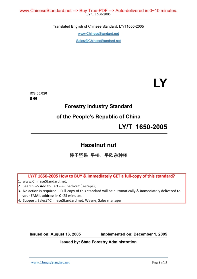 LY/T 1650-2005: Hazelnut nut Delivery: 9 seconds. True-PDF full-copy in English & invoice will be downloaded + auto-delivered via email. See step-by-step procedure Status: Valid