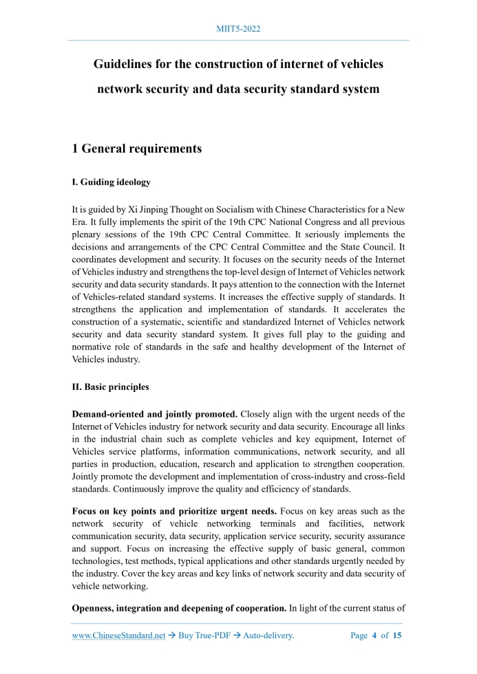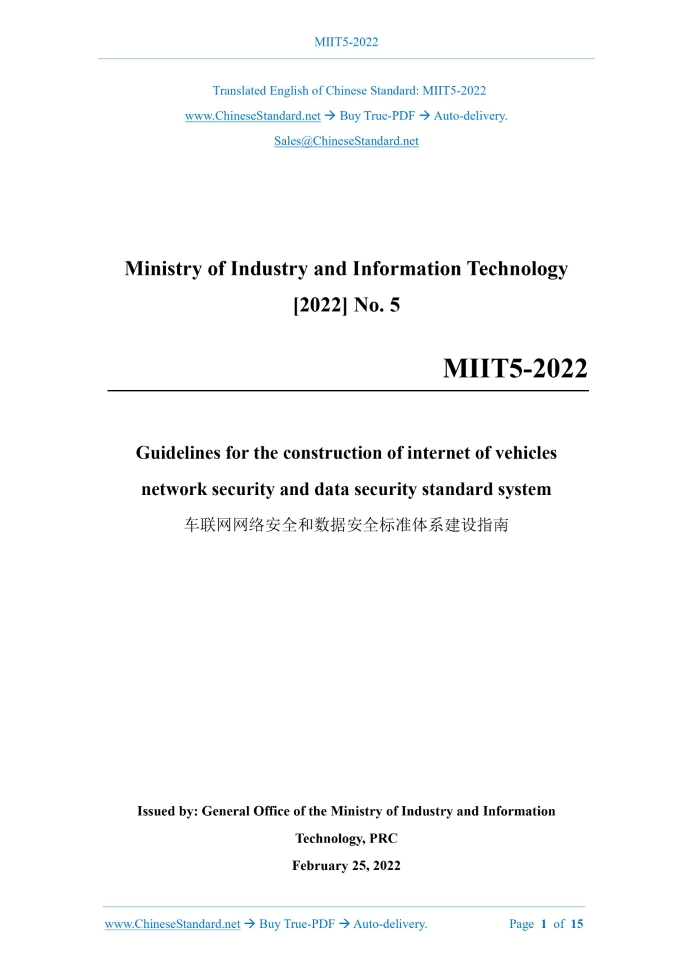 MIIT5-2022: Guidelines for the Construction of the Internet of Vehicles Network and Data Security Standard System Delivery: 9 seconds. True-PDF full-copy in English & invoice will be downloaded + auto-delivered via email. See step-by-step procedure