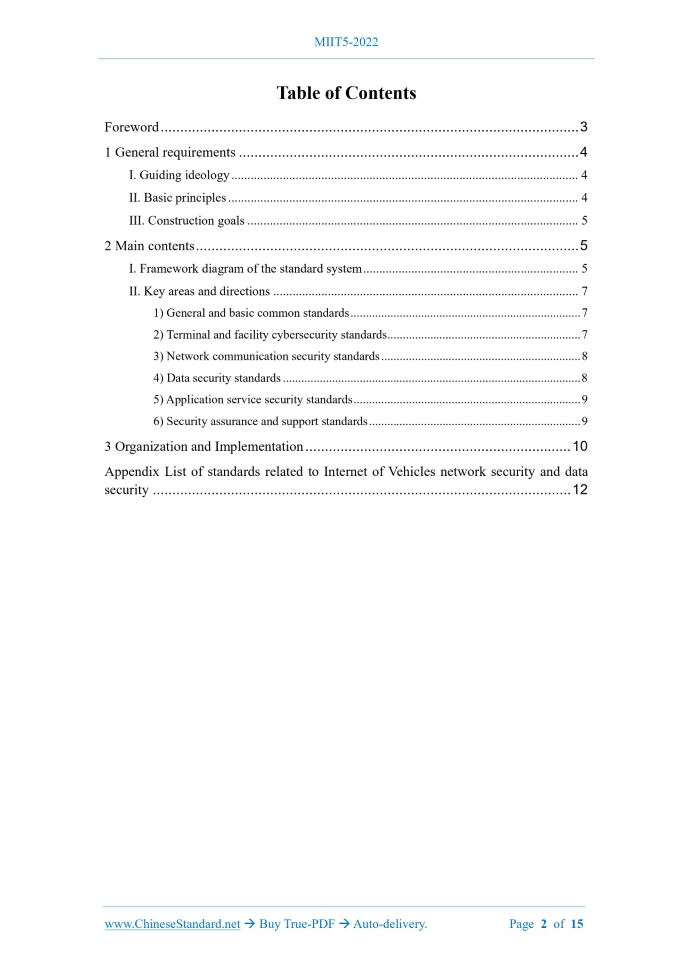 Similar standardsMIIT5-2022: Guidelines for the Construction of the Internet of Vehicles Network and Data Security Standard System---This is an excerpt. Full copy of true-PDF in English version (including equations, symbols, images, flow-chart, tables, and figures etc.), auto-downloaded/delivered in 9 seconds, can be purchased online: https://www.ChineseStandard.net/PDF.aspx/MIIT5-2022 Ministry of Industry and Information Technology [2022] No. 5 Guidelines for the construction of internet of vehicles network security and data security standard system Issued by. General Office of the Ministry of Industry and Information Technology, PRC February 25, 2022 Table of ContentsForeword... 3 1 General requirements... 4 I. Guiding ideology... 4 II. Basic principles... 4 III. Construction goals... 5 2 Main contents... 5 I. Framework diagram of the standard system... 5 II. Key areas and directions... 7 1) General and basic common standards... 7 2) Terminal and facility cybersecurity standards... 7 3) Network communication security standards... 8 4) Data security standards... 8 5) Application service security standards... 9 6) Security assurance and support standards... 9 3 Organization and Implementation... 10 Appendix List of standards related to Internet of Vehicles network security and data security... 12 Guidelines for the construction of internet of vehicles network security and data security standard system1 General requirementsI. Guiding ideology It is guided by Xi Jinping Thought on Socialism with Chinese Characteristics for a New Era. It fully implements the spirit of the 19th CPC National Congress and all previous plenary sessions of the 19th CPC Central Committee. It seriously implements the decisions and arrangements of the CPC Central Committee and the State Council. It coordinates development and security. It focuses on the security needs of the Internet of Vehicles industry and strengthens the top-level design of Internet of Vehicles network security and data security standards. It pays attention to the connection with the Internet of Vehicles-related standard systems. It increases the effective supply of standards. It strengthens the application and implementation of standards. It accelerates the construction of a systematic, scientific and standardized Internet of Vehicles network security and data security standard system. It gives full play to the guiding and normative role of standards in the safe and healthy development of the Internet of Vehicles industry. II. Basic principles Demand-oriented and jointly promoted. Closely align with the urgent needs of the Internet of Vehicles industry for network security and data security. Encourage all links in the industrial chain such as complete vehicles and key equipment, Internet of Vehicles service platforms, information communications, network security, and all parties in production, education, research and application to strengthen cooperation. Jointly promote the development and implementation of cross-industry and cross-field standards. Continuously improve the quality and efficiency of standards. Focus on key points and prioritize urgent needs. Focus on key areas such as the network security of vehicle networking terminals and facilities, network communication security, data security, application service security, security assurance and support. Focus on increasing the effective supply of basic general, common technologies, test methods, typical applications and other standards urgently needed by the industry. Cover the key areas and key links of network security and data security of vehicle networking. Openness, integration and deepening of cooperation. In light of the current status of II. Key areas and directions1) General and basic common standardsThe overall and basic common standards are the overall, general and guiding standards for the network security and data security of the Internet of Vehicles, including three types of standards. terminology and definitions, overall architecture, and cryptographic applications. The terminology and definition standards mainly regulate the main concepts of Internet of Vehicles network security and data security, providing a basis for the terms and definitions in related standards. The overall architecture standard mainly regulates the overall architecture requirements of the Internet of Vehicles network security. It clarifies and defines the protection objects, protection methods, and protection mechanisms. It guides enterprises to carry out network security protection work in a systematic manner. The cryptographic application standard mainly regulates the general requirements for the cryptographic application of the Internet of Vehicles. It clarifies the requirements for digital certificate format, digital certificate application, and device cryptographic application.2) Terminal and facility cybersecurity standardsThe terminal and facility network security standards mainly regulate the network security requirements related to Internet of Vehicles terminals and infrastructure, including four types of standards. network security of on-board equipment, network security of vehicle-side equipment, network security of roadside communication equipment, and network facility and system security. The network security standards for in-vehicle equipment mainly regulate the security protection and detection requirements of key intelligent devices and components of intelligent Internet of Vehicles, including security standards for automotive gateways, electronic control units, automotive safety chips, and in-vehicle computing platforms. The vehicle-side network security standard mainly regulates the safety protection and detection requirements of the vehicle's electronic and electrical architecture, bus architecture, system architecture, etc. The network security standard for roadside communication equipment mainly specifies the security protection and detection requirements for networked roadside eq