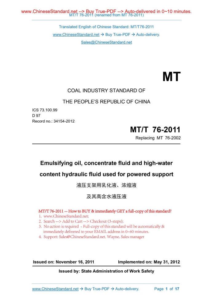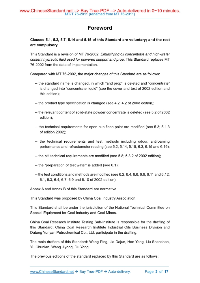 MT 76-2011: [MT/T 76-2011] Emulsifying oil, concentrate fluid and high-water content hydraulic fluid used for powered support Delivery: 9 seconds. True-PDF full-copy in English & invoice will be downloaded + auto-delivered via email. See step-by-step procedure Status: Obsolete MT 76: Historical versions