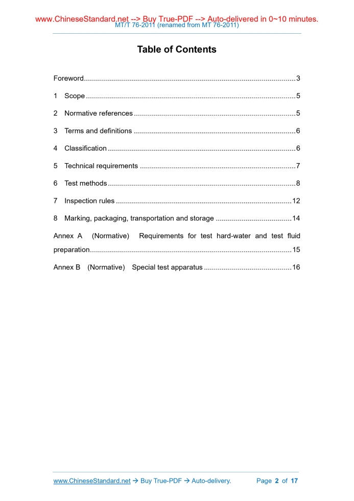 Similar standardsMT 76-2011: [MT/T 76-2011] Emulsifying oil, concentrate fluid and high-water content hydraulic fluid used for powered support---This is an excerpt. Full copy of true-PDF in English version (including equations, symbols, images, flow-chart, tables, and figures etc.), auto-downloaded/delivered in 9 seconds, can be purchased online: https://www.ChineseStandard.net/PDF.aspx/MT76-2011 MT COAL INDUSTRY STANDARD OF THE PEOPLE’S REPUBLIC OF CHINA ICS 73.100.99 D 97 Record no.. 34154-2012 MT/T 76-2011 Replacing MT 76-2002 Emulsifying oil, concentrate fluid and high-water content hydraulic fluid used for powered support 及其高含水液压液 Issued on: NOVEMBER 16, 2011 Implemented on: MAY 31, 2012 Issued by. State Administration of Work Safety Table of ContentsForeword ... 3 1 Scope .. 5 2 Normative references ... 5 3 Terms and definitions ... 6 4 Classification .. 6 5 Technical requirements ... 7 6 Test methods .. 8 7 Inspection rules .. 12 8 Marking, packaging, transportation and storage ... 14 Annex A (Normative) Requirements for test hard-water and test fluid preparation ... 15 Annex B (Normative) Special test apparatus ... 16ForewordClauses 5.1, 5.2, 5.7, 5.14 and 5.15 of this Standard are voluntary; and the rest are compulsory. This Standard is a revision of MT 76-2002, Emulsifying oil concentrate and high-water content hydraulic fluid used for powered support and prop. This Standard replaces MT 76-2002 from the data of implementation. Compared with MT 76-2002, the major changes of this Standard are as follows. -- the standard name is changed, in which “and prop” is deleted and “concentrate” is changed into “concentrate liquid” (see the cover and text of 2002 edition and this edition); -- the product type specification is changed (see 4.2; 4.2 of 200d edition); -- the relevant content of solid-state powder concentrate is deleted (see 5.2 of 2002 edition); -- the technical requirements for open cup flash point are modified (see 5.3; 5.1.3 of edition 2002); -- the technical requirements and test methods including odour, antifoaming performance and refractometer reading (see 5.2, 5.14, 5.15, 6.3, 6.15 and 6.16); -- the pH technical requirements are modified (see 5.8; 5.3.2 of 2002 edition); -- the “preparation of test water” is added (see 6.1); -- the test conditions and methods are modified (see 6.2, 6.4, 6.6, 6.9, 6.11 and 6.12; 6.1, 6.3, 6.4, 6.7, 6.9 and 6.10 of 2002 edition). Annex A and Annex B of this Standard are normative. This Standard was proposed by China Coal Industry Association. This Standard shall be under the jurisdiction of the National Technical Committee on Special Equipment for Coal Industry and Coal Mines. China Coal Research Institute Testing Sub-Institute is responsible for the drafting of this Standard; China Coal Research Institute Industrial Oils Business Division and Datong Yunyan Petrochemical Co., Ltd. participate in the drafting. The main drafters of this Standard. Wang Ping, Jia Dajun, Han Yong, Liu Shanshan, Yu Chunlan, Wang Jiyong, Du Yong. The previous editions of the standard replaced by this Standard are as follows. Emulsifying oil, concentrate fluid and high-water content hydraulic fluid used for powered support1 ScopeThis Standard specifies. the emulsifying type (HFAE) and solution type (HFAS) high- water content hydraulic fluids; and the terms and definitions, product classification, technical requirements, test methods, inspection rules and marking, packaging, transportation and storage of emulsifying oils and concentrate fluids for the preparation of the hydraulic fluid. This Standard applies to the high-water content hydraulic fluids for hydraulic supports, outside-pourable single hydraulic props, etc. and the emulsifying oils and concentrate fluids for the preparation of the hydraulic fluids.2 Normative referencesThe following referenced documents are indispensable for the application of this document. For dated references, only the edition dated applies to this document. For undated references, the latest edition of the referenced documents (including all amendments) applies to This Standard. GB 265-1988, Petroleum products - Determination of kinematic viscosity and calculation of dynamic viscosity GB/T 510-1983, Petroleum products - Determination of solidification point GB/T 3142, Lubricants - Determination of load carrying capacity (four balls method) GB/T 3536-2008, Petroleum products - Determination of flash and fire points - Cleveland open cup method (ISO 2592.2000, MOD) GB/T 4756, Method for manual sampling of petroleum liquids (GB/T 4756-1998, ISO 3170.1988, NEQ) GB/T 5231-2001, Wrought copper and copper alloys - Chemical composition limits and forms of wrought products GB/T 7631.2, Lubricants, industrial oils and related products (class L) - Classification - Part 2. family H (hydraulic systems) GB/T 11143-2008, Standard test method for rust-preventing characteristics of Weigh accurately 2.922 g of sodium chloride (of analytical purity); dissolve in distilled water or deionized water; and use distilled water or deionized water to dilute to 1 L. 6.2 Appearance At 10°C ~ 35°C, inject the emulsifying oil or concentrated fluid to be tested to the 100- ml scale of a 100-ml colorimetric tube of diameter 30 mm; use a stopper to seal; use a 5 W/220 V incandescent light bulb to irradiate the side of the colorimetric tube; and observe the filament through the test sample. if the filament can be seen clearly, it is transparent; if the filament is invisible or blurry, it is non-transparent. Reverse the colorimetric tube; the film formed on the wall of the colorimetric tube shall be uniform. 6.3 Odour Through olfactory test, emulsifying oils or concentrated fluids shall have no pungent smell. 6.4 Open cup flash point The flash point of emulsifying oils and concentrated fluids is tested as specified in GB/T 3536-2008, but the provision of 10.3 is not implemented. The bottom of thermometer bulb is 6 mm from the bottom