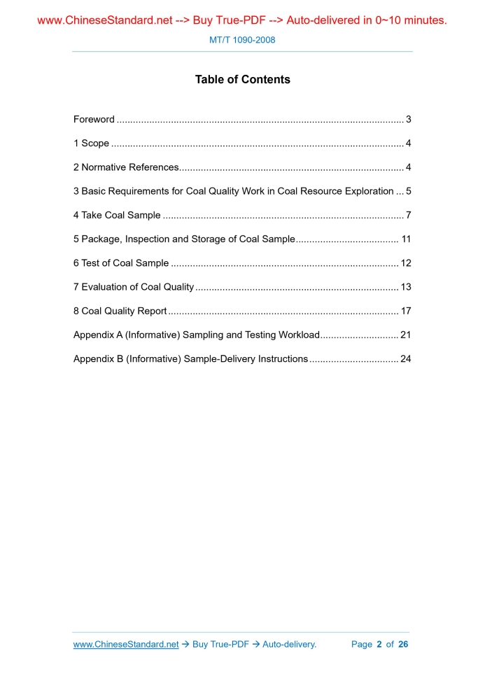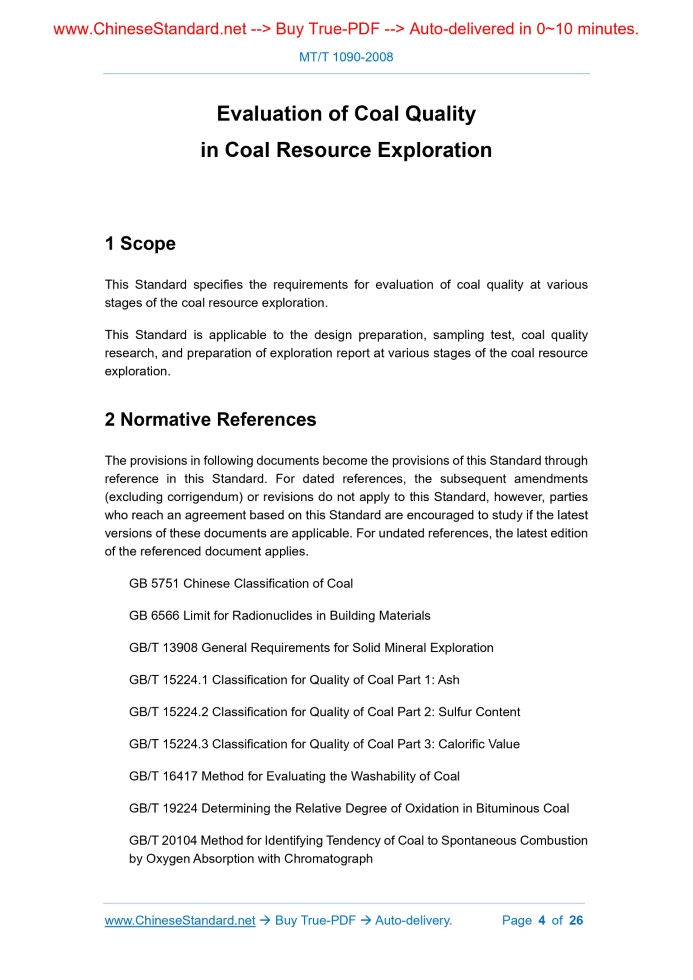 Similar standardsMT/T 1090-2008: Evaluation of Coal Quality in Coal Resource Exploration---This is an excerpt. Full copy of true-PDF in English version (including equations, symbols, images, flow-chart, tables, and figures etc.), auto-downloaded/delivered in 9 seconds, can be purchased online: https://www.ChineseStandard.net/PDF.aspx/MTT1090-2008COAL INDUSTRY STANDARD OF THE PEOPLE’S REPUBLIC OF CHINA ICS 73.020 D 10 Record No.: 26891-2010 Evaluation of Coal Quality in Coal Resource Exploration ISSUED ON: DECEMBER 11, 2009 IMPLEMENTED ON: JULY 01, 2010 Issued by: State Administration of Work Safety Table of ContentsForeword ... 3 1 Scope ... 4 2 Normative References ... 4 3 Basic Requirements for Coal Quality Work in Coal Resource Exploration ... 5 4 Take Coal Sample ... 7 5 Package, Inspection and Storage of Coal Sample ... 11 6 Test of Coal Sample ... 12 7 Evaluation of Coal Quality ... 13 8 Coal Quality Report ... 17 Appendix A (Informative) Sampling and Testing Workload ... 21 Appendix B (Informative) Sample-Delivery Instructions ... 24 Evaluation of Coal Quality in Coal Resource Exploration1 ScopeThis Standard specifies the requirements for evaluation of coal quality at various stages of the coal resource exploration. This Standard is applicable to the design preparation, sampling test, coal quality research, and preparation of exploration report at various stages of the coal resource exploration.2 Normative ReferencesThe provisions in following documents become the provisions of this Standard through reference in this Standard. For dated references, the subsequent amendments (excluding corrigendum) or revisions do not apply to this Standard, however, parties who reach an agreement based on this Standard are encouraged to study if the latest versions of these documents are applicable. For undated references, the latest edition of the referenced document applies. GB 5751 Chinese Classification of Coal GB 6566 Limit for Radionuclides in Building Materials GB/T 13908 General Requirements for Solid Mineral Exploration GB/T 15224.1 Classification for Quality of Coal Part 1: Ash GB/T 15224.2 Classification for Quality of Coal Part 2: Sulfur Content GB/T 15224.3 Classification for Quality of Coal Part 3: Calorific Value GB/T 16417 Method for Evaluating the Washability of Coal GB/T 19224 Determining the Relative Degree of Oxidation in Bituminous Coal GB/T 20104 Method for Identifying Tendency of Coal to Spontaneous Combustion by Oxygen Absorption with Chromatograph researching its process performance; evaluating their industrial use; proposing the coal processing and their utilization direction; so that provide data for the study of coal sedimentary environment, coal seam comparison and environmental protection. At each stage of the coal resource exploration, coal quality data of neighboring production mines shall be fully collected to provide basic data for the further development of coal quality work. 3.2 Coal quality work in the reconnaissance stage Generally-understand the general characteristics of coal types and coal quality; study the original materials of coal, coal rock composition, as well as types of coal formation; study the coal quality characteristics of each major coal seam, its changing law, and the changing rules of major harmful components in coal; preliminarily analyze the coal metamorphic factors. Sampling types, quantities, and test items can refer to Tables A.1 and A.2 in Appendix A. 3.3 Coal quality work in the prospecting stage Roughly-determine the characteristics of coal types and coal quality in the mineable coal seam; study the original materials of coal, coal rock composition, as well as types of coal formation; study the coal quality characteristics of each major coal seam, its changing law, and the changing rules of major harmful components in coal; further analyze the metamorphic factors in each major coal seam. Sampling types, quantities, and test items can refer to Tables A.1 and A.2 in Appendix A. 3.4 Coal quality work in general exploration stage Basically-identify the coal quality characteristics and process performance of the mineable coal seam; determine the coal types of the mineable coal seam; evaluate the industrial utilization direction of coal; preliminarily identify the weathering zone boundary of the major mineable coal seam; evaluate the degree of change of the coal quality of coal seam; comprehensively study the physical and chemical characteristics and changing law of each mineable coal seam; study the coal distribution law; make a preliminary evaluation of the comprehensive utilization direction of coal and its impact on the coal seam mining. The sampling types, quantities and test items can refer to Tables A.1, A.2, and A.3 in Appendix A. 3.5 Coal quality work in detailed exploration stage Find out in detail the characteristics of coal types and coal quality of mineable coal seam, and their changes within the pre-mined area. According to the requirements of development and construction, focus on studying the coal quality characteristics and process performance related to the mining, washing, processing, sales, environmental protection, utilization, etc. of the coal; and make corresponding evaluation. The sampling types, quantities, and test items can refer to Appendix A, and Tables A.1, A.2, and A.3. 4.2.2 The coal sample of coal core is generally taken as full-layer sample based on the independent coal seam. When the coal quality is significantly different and the layer thickness is greater than 0.5m, then take the stratified coal sample. When sampling from the coal seam with complex structures, it shall be taken separately according to the gangue and coal stratification. 4.2.3 The gangue larger than 0.01m to the minimum mineable thickness of coal seam shall be sampled separately. For the gangue greater than the minimum mineable thickness of coal seam, if it belongs to non-carbonaceous mudstones, it shall not be sampled; if it belongs to