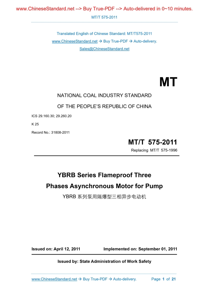 MT/T 575-2011: YBRB Series Flameproof Three Phases Asynchronous Motor for Pump Delivery: 9 seconds. True-PDF full-copy in English & invoice will be downloaded + auto-delivered via email. See step-by-step procedure Status: Valid MT/T 575: Historical versions