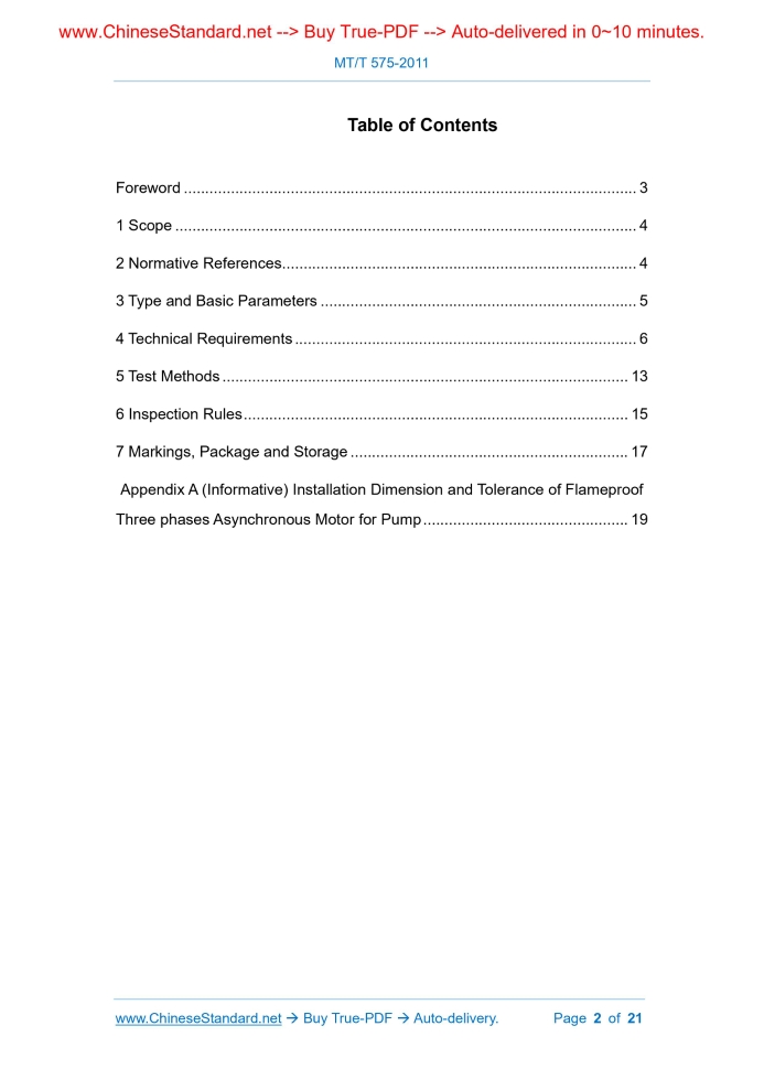 MT/T 575-2011: YBRB Series Flameproof Three Phases Asynchronous Motor for Pump---This is an excerpt. Full copy of true-PDF in English version (including equations, symbols, images, flow-chart, tables, and figures etc.), auto-downloaded/delivered in 9 seconds, can be purchased online: https://www.ChineseStandard.net/PDF.aspx/MTT575-2011NATIONAL COAL INDUSTRY STANDARD OF THE PEOPLE’S REPUBLIC OF CHINA ICS 29.160.30; 29.260.20 K 25 Record No.: 31808-2011 Replacing MT/T 575-1996 YBRB Series Flameproof Three Phases Asynchronous Motor for Pump ISSUED ON: APRIL 12, 2011 IMPLEMENTED ON: SEPTEMBER 01, 2011 Issued by: State Administration of Work Safety Table of ContentsForeword ... 3 1 Scope ... 4 2 Normative References ... 4 3 Type and Basic Parameters ... 5 4 Technical Requirements ... 6 5 Test Methods ... 13 6 Inspection Rules ... 15 7 Markings, Package and Storage ... 17 Appendix A (Informative) Installation Dimension and Tolerance of Flameproof Three phases Asynchronous Motor for Pump ... 19 YBRB Series Flameproof Three Phases Asynchronous Motor for Pump1 ScopeThis Standard specifies the type and basic parameters, technical requirements, test methods, inspection rules, marking, package and storage of YBRB series flameproof three phases asynchronous motor for pump (hereinafter referred to as motor). This Standard is applicable to the emulsion pumping station and spray pump; while the motor used for coal mining machine, heading machine and other similar mining machinery oil pump can use for reference.2 Normative ReferencesThe following documents are essential to the application of this document. For the dated documents, only the versions with the dates indicated are applicable to this document; for the undated documents, only the latest version (including all the amendments) are applicable to this document. GB/T 191-2008 Packaging - Pictorial Marking for Handling of Goods GB 755-2008 Rotating Electrical Machines - Rating and Performance GB/T 997-2008 Rotating Electrical Machines - Classification of Types of Construction, Mounting Arrangements and Terminal Box Position (IM Code) GB/T 1032-2005 Test Procedures for Three-Phase Induction Motors GB/T 1993-1993 Cooling Methods for Rotating Electrical Machines GB/T 2423.4-2008 Environmental Testing for Electric and Electronic Products - Part 2: Test Method - Test Db: Damp Heat, Cyclic (12h+12h Cycle) GB 3836.1-2000 Electrical Apparatus for Explosive Gas Atmospheres - Part 1: General Requirements GB 3836.2-2000 Electrical Apparatus for Explosive Gas Atmospheres - Part 2: Flameproof Enclosure d GB 3836.3-2000 Electrical Apparatus for Explosive Gas Atmospheres - Part 3: Increased Safety e GB/T 4772.1-1999 Dimensions and Output Series for Rotating Electrical Machines -Part 1: Frame Numbers 56 to 400 and Flange Numbers 55 to 1 080 GB/T 4942.1-2006 Degrees of Protection Provided by the Integral Design of Rotating Electrical Machined (IP Code)-Classification GB 10068-2008 Mechanical Vibration of Certain Machines with Shaft Heights 56 Mm and Higher-Measurement Evaluation and Limits of Vibration Severity GB/T 10069.1-2006 Measurement of Airborne Noise Emitted by Rotating Electrical Machines and the Noise Limits Part 1: Method for the Measurement of Airborne Noise Emitted by Rotating Electrical Machines GB/T 10111-2008 Generation of Random Numbers and Procedures Applied to Sampling Inspection for Product Quality AQ 1043-2007 Mining Products Safety Label JB/T 9615.1-2000 Test Methods of the Interturn Insulation on Random Wound Winding for AC Low-Voltage Machines JB/T 9615.2-2000 Test Limits of the Interturn Insulation on Random Wound Winding for AC Low-Voltage Machines JB/T 10098-2000 Impulse Voltage Withstand Levels of Rotating A.C. Machines with Form-Wound Stator Coils3 Type and Basic Parameters3.1 Type 3.1.1 The motor shall be manufactured into flameproof type according to the provisions of GB 3836.2-2000, its anti-explosion mark is Exd I. 3.1.2 The overall structural protection rating of the motor shall conform to the IP55 specified in GB/T 4942.1-2006. 3.1.3 The cooling method of the motor shell water-cooled or air-cooled, which shall conform to the provisions of GB/T 1993-1993; while the cooling method shall be marked as IC3W7 or IC0141. 3.1.4 The structure and installation type of the motor are IMB3, IMB5 as specified in GB/T 997-2008; other suitable installation type can also be available. The base b) The ambient air temperature shall not exceed 40°C; the ambient temperature for water-cooling shall be no less than 0°C; while the ambient temperature for air- cooling shall be no less than -20°C. c) The relative humidity of the air shall be no greater than 95% (at 25°C); d) Coal mining underground working face containing methane and with coal dust explosion hazard; e) The inlet water temperature for cool water shall not exceed 25°C; f) The working pressure of the cooling water channel shall not exceed 3.0MPa; g) The flowrate of the cooling water shall be no less than the provisions of Table 1. NOTE: If the altitude or ambient temperature of the operation site or test site is different from the provisions of 4.2, the temperature-rise limit can be corrected according to the provisions of GB 755-2008. 4.3 Water-cooled motor shall be able to start and operate directly under the conditions of guaranteed cooling water flowrate. 4.4 The motor shall be allowed to start directly within the rated voltage range. 4.5 The deviation between power supply, voltage and the rated values during the operating period of the motor shall conform to the provisions of GB 755-2008. 4.6 The anti-explosion structure of the motor shall meet the requirements of GB 3836.1-2000 and GB 3836.2-2000. 4.7 The motor shall be cable of withstanding the shell pressure test (static pressure test or dynamic pressure test) and internal ignition non-explosion test specified in GB 3836.2-2000. 4.8 The cable entry device of the motor shall be conducted clamping test according to the provisions 