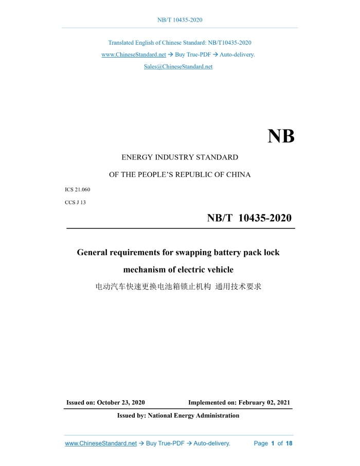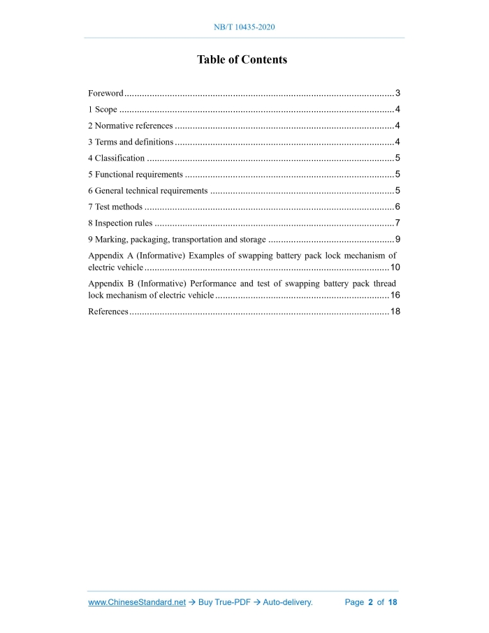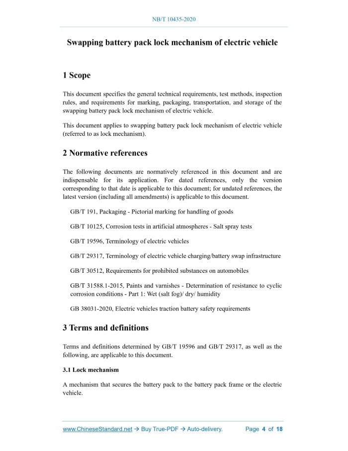 Similar standardsNB/T 10435-2020: General requirements for swapping battery pack lock mechanism of electric vehicle---This is an excerpt. Full copy of true-PDF in English version (including equations, symbols, images, flow-chart, tables, and figures etc.), auto-downloaded/delivered in 9 seconds, can be purchased online: https://www.ChineseStandard.net/PDF.aspx/NBT10435-2020 NB ENERGY INDUSTRY STANDARD OF THE PEOPLE’S REPUBLIC OF CHINA ICS 21.060 CCS J 13 General requirements for swapping battery pack lock mechanism of electric vehicle ISSUED ON: OCTOBER 23, 2020 IMPLEMENTED ON: FEBRUARY 02, 2021 Issued by: National Energy Administration Table of ContentsForeword ... 3 1 Scope ... 4 2 Normative references ... 4 3 Terms and definitions ... 4 4 Classification ... 5 5 Functional requirements ... 5 6 General technical requirements ... 5 7 Test methods ... 6 8 Inspection rules ... 7 9 Marking, packaging, transportation and storage ... 9 Appendix A (Informative) Examples of swapping battery pack lock mechanism of electric vehicle ... 10 Appendix B (Informative) Performance and test of swapping battery pack thread lock mechanism of electric vehicle ... 16 References ... 18 Swapping battery pack lock mechanism of electric vehicle1 ScopeThis document specifies the general technical requirements, test methods, inspection rules, and requirements for marking, packaging, transportation, and storage of the swapping battery pack lock mechanism of electric vehicle. This document applies to swapping battery pack lock mechanism of electric vehicle (referred to as lock mechanism).2 Normative referencesThe following documents are normatively referenced in this document and are indispensable for its application. For dated references, only the version corresponding to that date is applicable to this document; for undated references, the latest version (including all amendments) is applicable to this document. GB/T 191, Packaging - Pictorial marking for handling of goods GB/T 10125, Corrosion tests in artificial atmospheres - Salt spray tests GB/T 19596, Terminology of electric vehicles GB/T 29317, Terminology of electric vehicle charging/battery swap infrastructure GB/T 30512, Requirements for prohibited substances on automobiles GB/T 31588.1-2015, Paints and varnishes - Determination of resistance to cyclic corrosion conditions - Part 1: Wet (salt fog)/ dry/ humidity GB 38031-2020, Electric vehicles traction battery safety requirements3 Terms and definitionsTerms and definitions determined by GB/T 19596 and GB/T 29317, as well as the following, are applicable to this document. 3.1 Lock mechanism A mechanism that secures the battery pack to the battery pack frame or the electric vehicle.4 ClassificationThe battery pack lock mechanism – which can be divided into thread, lock pin, rotation, flip, top-pressure, staggered teeth, plug pin, push-pull, etc. – are used to fix the battery pack and the vehicle body. For examples of lock mechanisms, see Appendix A; for the performance and test of the thread lock mechanism, see Appendix B.5 Functional requirementsBasic function of the lock mechanism include: a) Realize the reliable connection between the electric vehicle battery pack and the vehicle body and meet the needs of swapping battery; at the same time, it shall enable fastening and separation the vehicle body and the battery pack by manual methods. b) The lock mechanism shall be able to securely fix the battery pack on the vehicle body, without generating relative displacement or mechanical noise under the frequent vibration caused by vehicle running.6 General technical requirements6.1 Environmental conditions The operating environment of the lock mechanism shall meet the following requirements: a) Ambient temperature: -40 °C ~ 85 °C. b) Relative humidity: daily average maximum 95%, monthly average maximum 90%. 6.2 Guiding and floating The lock mechanism should have the function of guiding and floating. 6.3 Service life Under normal operation, after 3 000 times of swapping battery pack, the function shall not fail. 6.4 Resistance to temperature shock The lock mechanism shall be such that, after the temperature shock test, the appearance shall not be deformed or cracked. 7.3 Resistance to temperature shock The temperature shock test shall be performed according to 8.2.8 in GB 38031-2020. 7.4 Resistance to damp and hot cycle The damp and hot cycle test shall be performed according to 8.2.5 in GB 38031-2020. 7.5 Vibration The vibration test shall be performed according to 8.2.1 in GB 38031-2020. 7.6 Mechanical shock The mechanical shock test shall be performed according to 8.2.2 in GB 38031-2020. 7.7 Resistance to neutral salt spray The neutral salt spray test shall be performed according to GB/T 10125. 7.8 Resistance to comprehensive cyclic corrosion The test of comprehensive cyclic corrosion conditions shall be carried out according to cycle B in GB/T 31588.1-2015. 7.9 Prohibited substances The test of prohibited substances shall be carried out according to the requirements of GB/T 30512.8 Inspection rules8.1 Testing of products Product testing is divided into type inspection and ex-factory inspection. 8.2 Type inspection In any of the following cases of the lock mechanism, the manufacturer shall carry out a type inspection: a) during the ex-situ production of old products or trial-type identification of new products. b) after the official production, if the structure, material and process are greatly changed, which may affect the performance of the product. items in the re-inspection, judge this batch of products as unqualified. The type inspection shall comply with the technical regulations of the product. If all the items are qualified, judge the products as qualified; if any item is unqualified, judge the product as unqualified.9 Marking, packaging, transportation and storage9.1 Marking The marking shall be clear, conspicuous, firm and reliable. Contents include: a) name and trademark of the manufactur
