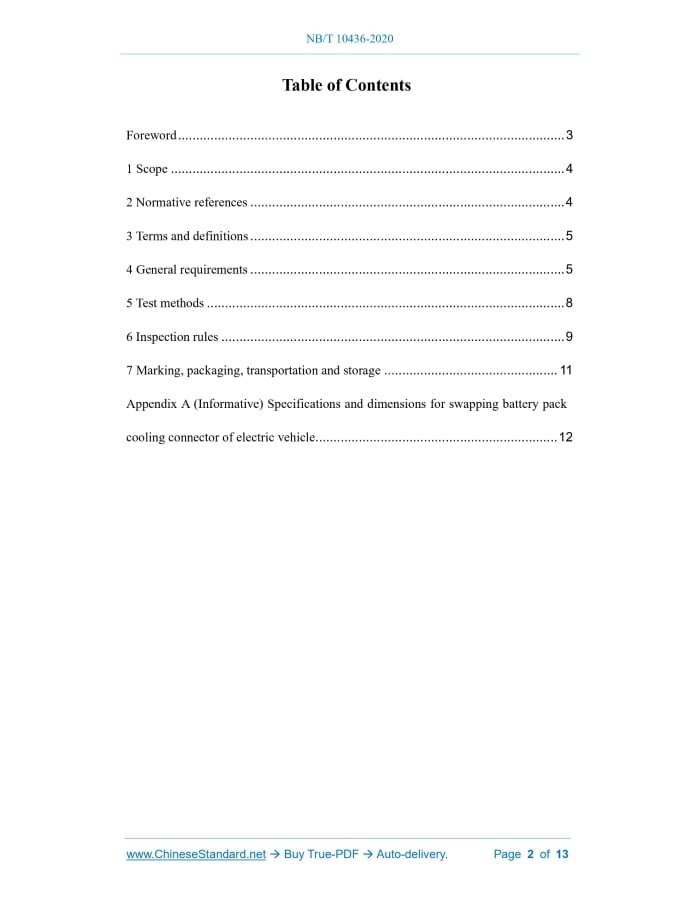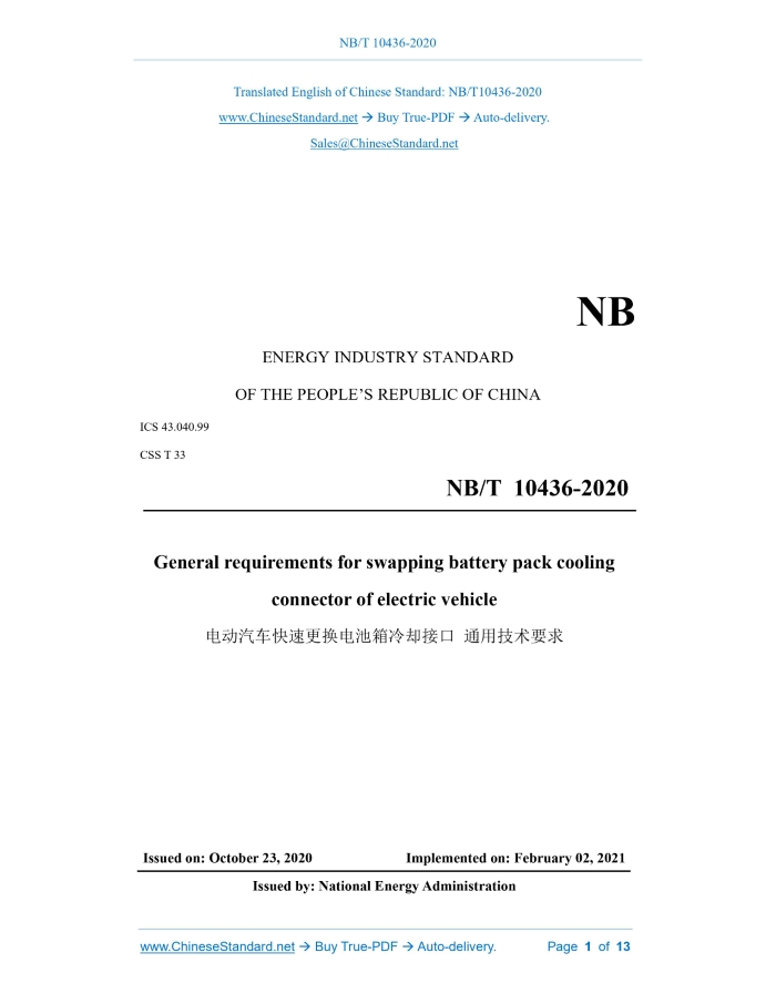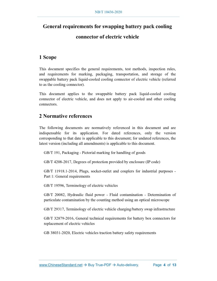 Similar standardsNB/T 10436-2020: General requirements for swapping battery pack cooling connector of electric vehicle---This is an excerpt. Full copy of true-PDF in English version (including equations, symbols, images, flow-chart, tables, and figures etc.), auto-downloaded/delivered in 9 seconds, can be purchased online: https://www.ChineseStandard.net/PDF.aspx/NBT10436-2020 NB ENERGY INDUSTRY STANDARD OF THE PEOPLE’S REPUBLIC OF CHINA ICS 43.040.99 CSS T 33 General requirements for swapping battery pack cooling connector of electric vehicle ISSUED ON: OCTOBER 23, 2020 IMPLEMENTED ON: FEBRUARY 02, 2021 Issued by: National Energy Administration Table of ContentsForeword ... 3 1 Scope ... 4 2 Normative references ... 4 3 Terms and definitions ... 5 4 General requirements ... 5 5 Test methods ... 8 6 Inspection rules ... 9 7 Marking, packaging, transportation and storage ... 11 Appendix A (Informative) Specifications and dimensions for swapping battery pack cooling connector of electric vehicle ... 12 General requirements for swapping battery pack cooling connector of electric vehicle1 ScopeThis document specifies the general requirements, test methods, inspection rules, and requirements for marking, packaging, transportation, and storage of the swappable battery pack liquid-cooled cooling connector of electric vehicle (referred to as the cooling connector). This document applies to the swappable battery pack liquid-cooled cooling connector of electric vehicle, and does not apply to air-cooled and other cooling connectors.2 Normative referencesThe following documents are normatively referenced in this document and are indispensable for its application. For dated references, only the version corresponding to that date is applicable to this document; for undated references, the latest version (including all amendments) is applicable to this document. GB/T 191, Packaging - Pictorial marking for handling of goods GB/T 4208-2017, Degrees of protection provided by enclosure (IP code) GB/T 11918.1-2014, Plugs, socket-outlet and couplers for industrial purposes - Part 1: General requirements GB/T 19596, Terminology of electric vehicles GB/T 20082, Hydraulic fluid power - Fluid contamination - Determination of particulate contamination by the counting method using an optical microscope GB/T 29317, Terminology of electric vehicle charging/battery swap infrastructure GB/T 32879-2016, General technical requirements for battery box connectors for replacement of electric vehicles GB 38031-2020, Electric vehicles traction battery safety requirements3 Terms and definitionsTerms and definitions determined by GB/T 19596, GB/T29317 and GB/T 32879-2016, as well as the following, are applicable to this document. 3.1 Swappable battery pack cooling connector The fluid connector – realizing the conduction of coolant between the battery pack and the electric vehicle, or between the battery pack and the charging rack – which is composed of a cooling coupler plug and a cooling coupler socket-outlet. 3.2 Cooling coupler plug The part – of the swappable battery pack cooling connector – that is connected with the battery pack. 3.3 Cooling coupler socket-outlet The part – of the swappable battery pack cooling connector – that is connected with the electric vehicle or the charging rack. 3.4 Insertion and extraction endurance The insertion-and-extraction coupling times of the cooling coupler plug and the cooling coupler socket-outlet within the specified performance range.4 General requirements4.1 Functional structure requirements The cooling connector shall meet the following functional structure requirements: a) Accessible surfaces of the cooling connector shall be free of burrs, flashes and similar sharp edges. b) The cooling coupler plug and socket-outlet – before being installed and used – shall be provided with a dust cover. c) The cooling coupler plug and socket-outlet shall have a dust-proof function during the coupling process. d) The cooling coupler plug and socket-outlet shall have the function of a stop valve. e) When the cooling coupler plug is connected to the socket-outlet, the fluid shall be connected and there shall be no leakage after coupling. c) After the plug is uncoupled from the socket, the floating mechanism shall be able to reset automatically. d) The mechanical connection shall be free from loosening. Note: The insertion and extraction of the cooling connector shall be counted as one cycle. 4.9 Vibration requirements The cooling connector shall meet the requirements of reliable connection, intact structure, no looseness and no leakage during and after the vibration test. 4.10 Shock requirements The cooling connector shall meet the requirements of reliable connection, intact structure, no looseness and no leakage during and after the shock test. 4.11 Protection level The protection level of the cooling connector shall meet the requirements of IP67 in both coupled and uncoupled states. 4.12 Guiding and floating function The guiding function and floating range of the cooling connector shall meet the following requirements: a) When the cooling coupler plug and socket are coupled, they shall have the function of guiding and floating. When coupling, the position deviation shall be automatically corrected to ensure accurate connection; the guiding mechanism shall be able to correct the position deviation of not less than 5 mm in the vertical coupling direction, and the guiding mechanism shall be able to correct the angular deviation of the coupling direction not less than 1°. b) The floating follower mechanism shall be able to follow a position offset of not less than 5 mm along the coupling direction. c) The floating follower mechanism shall be able to follow a position offset of not less than 5 mm along the vertical coupling direction. d) The floating follower mechanism shall be able to follow an angular offset not less than 1°. e) The floating mechanism shall be able to reset aut