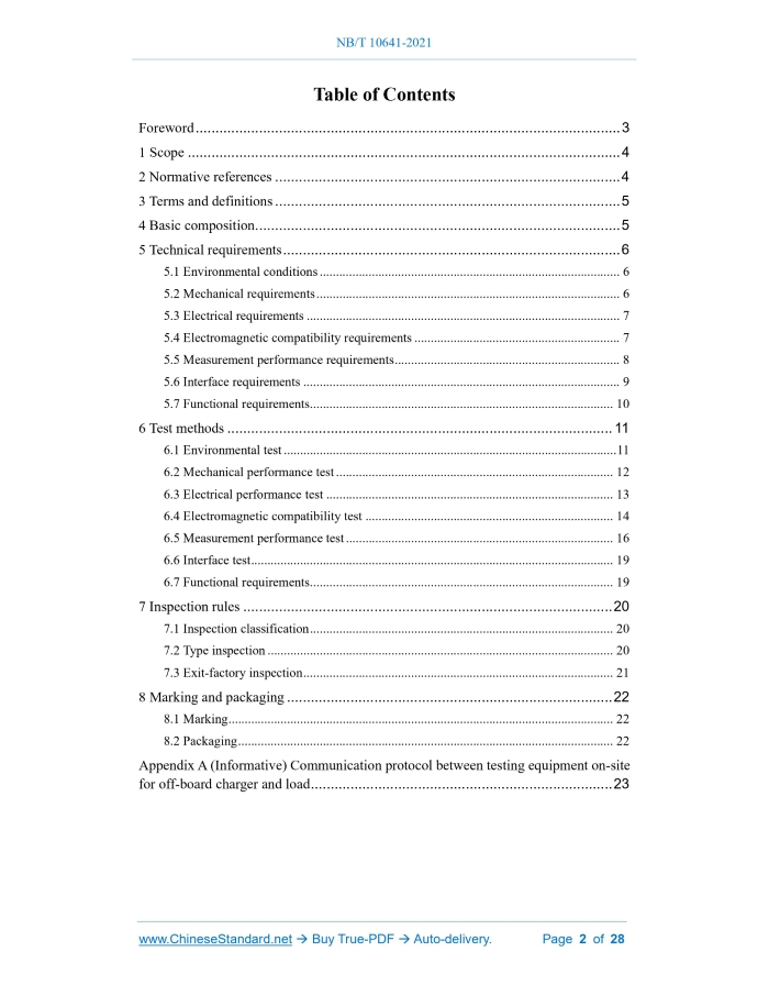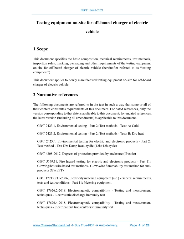 Similar standardsNB/T 10641-2021: Testing equipment on-site for off-board charger of electric vehicle---This is an excerpt. Full copy of true-PDF in English version (including equations, symbols, images, flow-chart, tables, and figures etc.), auto-downloaded/delivered in 9 seconds, can be purchased online: https://www.ChineseStandard.net/PDF.aspx/NBT10641-2021NB ENERGY INDUSTRY STANDARD OF THE PEOPLE’S REPUBLIC OF CHINA ICS 17.220 CCS N 29 Testing equipment on-site for off-board charger of electric vehicle ISSUED ON: APRIL 26, 2021 IMPLEMENTED ON: OCTOBER 26, 2021 Issued by: National Energy Administration Table of ContentsForeword ... 3 1 Scope ... 4 2 Normative references ... 4 3 Terms and definitions ... 5 4 Basic composition ... 5 5 Technical requirements ... 6 5.1 Environmental conditions ... 6 5.2 Mechanical requirements ... 6 5.3 Electrical requirements ... 7 5.4 Electromagnetic compatibility requirements ... 7 5.5 Measurement performance requirements ... 8 5.6 Interface requirements ... 9 5.7 Functional requirements ... 10 6 Test methods ... 11 6.1 Environmental test ... 11 6.2 Mechanical performance test ... 12 6.3 Electrical performance test ... 13 6.4 Electromagnetic compatibility test ... 14 6.5 Measurement performance test ... 16 6.6 Interface test ... 19 6.7 Functional requirements ... 19 7 Inspection rules ... 20 7.1 Inspection classification ... 20 7.2 Type inspection ... 20 7.3 Exit-factory inspection ... 21 8 Marking and packaging ... 22 8.1 Marking ... 22 8.2 Packaging ... 22 Appendix A (Informative) Communication protocol between testing equipment on-site for off-board charger and load ... 23 Testing equipment on-site for off-board charger of electric vehicle1 ScopeThis document specifies the basic composition, technical requirements, test methods, inspection rules, marking, packaging and other requirements of the testing equipment on-site for off-board charger of electric vehicle (hereinafter referred to as “testing equipment”). This document applies to newly manufactured testing equipment on-site for off-board charger of electric vehicle.2 Normative referencesThe following documents are referred to in the text in such a way that some or all of their content constitutes requirements of this document. For dated references, only the version corresponding to that date is applicable to this document; for undated references, the latest version (including all amendments) is applicable to this document. GB/T 2423.1, Environmental testing - Part 2: Test methods - Tests A: Cold GB/T 2423.2, Environmental testing - Part 2: Test methods - Tests B: Dry heat GB/T 2423.4, Environmental testing for electric and electronic products - Part 2: Test method - Test Db: Damp heat, cyclic (12h+12h cycle) GB/T 4208-2017, Degrees of protection provided by enclosure (IP code) GB/T 5169.11, Fire hazard testing for electric and electronic products - Part 11: Glowing/hot-wire based test methods - Glow-wire flammability test method for end- products (GWEPT) GB/T 17215.211-2006, Electricity metering equipment (a.c.) - General requirements, tests and test conditions - Part 11: Metering equipment GB/T 17626.2-2018, Electromagnetic compatibility - Testing and measurement techniques - Electrostatic discharge immunity test GB/T 17626.4-2018, Electromagnetic compatibility - Testing and measurement techniques - Electrical fast transient/burst immunity test GB/T 17626.8-2006, Electromagnetic compatibility (EMC) - Part 8: Testing and measurement techniques - Power frequency magnetic field immunity test GB/T 18487.1-2015, Electric vehicle conductive charging system - Part 1: General requirements GB/T 18487.2, Electric vehicle conductive charging system - Part 2: EMC requirements for off-board electric vehicle supply equipment GB/T 20234.3-2015, Connection set for conductive charging of electric vehicles - Part 3: DC charging coupler GB/T 27930, Communication protocols between off-board conductive charger and battery management system for electric vehicle GB/T 29317, Terminology of electric vehicle charging/battery swap infrastructure GB/T 34657.1, Interoperability test specifications of electric vehicle conductive charging - Part 1: Supply equipment GB/T 34658, Conformance test for communication protocols between off-board conductive charger and battery management system for electric vehicle NB/T 33001, Specification for electric vehicle off-board conductive charger3 Terms and definitionsTerms and definitions determined by GB/T 18487.1-2015, GB/T 18487.2, GB/T 29317 and NB/T 33001, as well as the following, are applicable to this document. 3.1 testing equipment on-site for off-board charger of electric vehicle Device for on-site testing of off-board charger performance.4 Basic compositionThe testing equipment is composed of a vehicle DC charging interface circuit simulator, a DC standard electric energy meter, a power interface, a control unit, a human- computer interaction module, a clock unit, a waveform and protocol analysis module, etc., as shown in Figure 1. 5.2.2 Heat resistance and flame retardancy The testing equipment shall be able to withstand the glow-wire test, and shall not catch fire after being subjected to the test method in GB/T 5169.11. Test severity: The test temperature is 650 °C ± 10 °C, and the action time is 30 s ± 1 s. 5.2.3 Enclosure protection grade The enclosure protection grade of the testing equipment shall not be lower than the requirements of IP30 in GB/T 4208-2017. 5.2.4 Earthing terminal The testing equipment shall have a protective earthing terminal with an obvious earthing mark, and shall have a reliable electrical connection with an accessible metal enclosure. The electric conductor of the terminal shall be made of copper; the surface shall be anti-corrosion treated; the diameter of the thread shall not be less than 5 mm. 5.3 Electrical requirements 5.3.1 Power supply The AC power supply is required as follows: a) rated voltage: single-phase 220 V, allowable devi