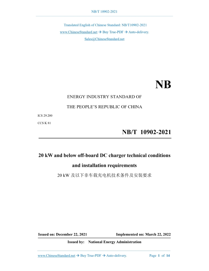 NB/T 10902-2021: 20 kW and below off-board DC charger technical conditions and installation requirements Delivery: 9 seconds. True-PDF full-copy in English & invoice will be downloaded + auto-delivered via email. See step-by-step procedure Status: Valid