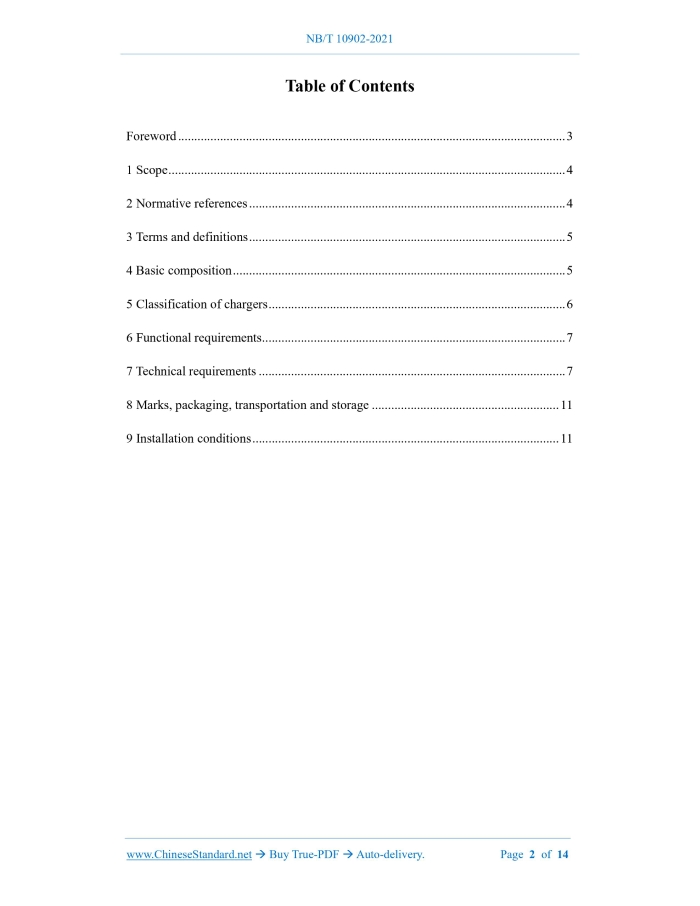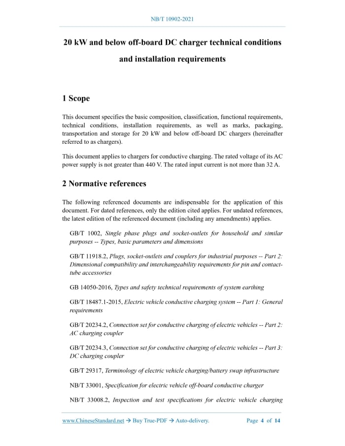 Similar standardsNB/T 10902-2021: 20 kW and below off-board DC charger technical conditions and installation requirements---This is an excerpt. Full copy of true-PDF in English version (including equations, symbols, images, flow-chart, tables, and figures etc.), auto-downloaded/delivered in 9 seconds, can be purchased online: https://www.ChineseStandard.net/PDF.aspx/NBT10902-2021 NB ENERGY INDUSTRY STANDARD OF THE PEOPLE’S REPUBLIC OF CHINA ICS 29.200 CCS K 81 20 kW and below off-board DC charger technical conditions and installation requirements ISSUED ON: DECEMBER 22, 2021 IMPLEMENTED ON: MARCH 22, 2022 Issued by: National Energy Administration Table of ContentsForeword ... 3 1 Scope ... 4 2 Normative references ... 4 3 Terms and definitions ... 5 4 Basic composition ... 5 5 Classification of chargers ... 6 6 Functional requirements ... 7 7 Technical requirements ... 7 8 Marks, packaging, transportation and storage ... 11 9 Installation conditions ... 11 20 kW and below off-board DC charger technical conditions and installation requirements1 ScopeThis document specifies the basic composition, classification, functional requirements, technical conditions, installation requirements, as well as marks, packaging, transportation and storage for 20 kW and below off-board DC chargers (hereinafter referred to as chargers). This document applies to chargers for conductive charging. The rated voltage of its AC power supply is not greater than 440 V. The rated input current is not more than 32 A.2 Normative referencesThe following referenced documents are indispensable for the application of this document. For dated references, only the edition cited applies. For undated references, the latest edition of the referenced document (including any amendments) applies. GB/T 1002, Single phase plugs and socket-outlets for household and similar purposes -- Types, basic parameters and dimensions GB/T 11918.2, Plugs, socket-outlets and couplers for industrial purposes -- Part 2: Dimensional compatibility and interchangeability requirements for pin and contact- tube accessories GB 14050-2016, Types and safety technical requirements of system earthing GB/T 18487.1-2015, Electric vehicle conductive charging system -- Part 1: General requirements GB/T 20234.2, Connection set for conductive charging of electric vehicles -- Part 2: AC charging coupler GB/T 20234.3, Connection set for conductive charging of electric vehicles -- Part 3: DC charging coupler GB/T 29317, Terminology of electric vehicle charging/battery swap infrastructure NB/T 33001, Specification for electric vehicle off-board conductive charger NB/T 33008.2, Inspection and test specifications for electric vehicle charging equipment -- Part 2: A. C. charging spot NB/T 42077, In-Cable Control and Protective Device for mode 2 charging of electric road vehicles (IC-CPD)3 Terms and definitionsFor the purposes of this document, the terms and definitions defined in GB/T 29317, NB/T 33001 as well as the followings apply. 3.1 power access mode Ⅰ When the charger is connected to the AC grid, use a plug and socket that complies with GB/T 1002. The power supply side uses phase wires, neutral wires and grounding protective conductors. The cable assembly with the plug is a part of the charger. 3.2 power access mode II When the charger is connected to the AC power grid, use a plug that meets the requirements of GB/T 11918.2 or a vehicle socket specified in GB/T 20234.2. The power side uses the phase line, neutral line and grounding protective conductor. The cable assembly or vehicle socket with a plug is part of the charger. 3.3 power access mode III When the charger is connected to the AC grid, a cable is used to permanently connect the charging device to the AC grid. Use the phase, neutral and earth protective conductors on the mains side. 3.4 main body of the charger The part of the charger except the cable assembly.4 Basic compositionThe basic composition of the charger shall include power supply input, power conversion unit, output switch unit, charging cable and vehicle plug, as well as control power supply, charging control unit, human-computer interaction unit. It may include functional units such as metering. Public operation scenarios shall include units of measurement. Power access mode I and power access mode II shall include cable assemblies with plugs or vehicle sockets. Refer to Figure 1 for the basic composition of the charger. b) The protection level of the portable charger body shall not be lower than IP57. c) When the vehicle plug is coupled with the vehicle socket, the protection level shall comply with the provisions in 7.2 of GB/T 18487.1-2015. 7.3 Electric shock protection Electric shock protection requirements shall meet: a) The electric shock protection of mobile and fixed motors shall comply with the provisions in Chapter 7 of GB/T 18487.1-2015. b) When the portable charger is connected to the vehicle socket, the charger body, cables and plugs that the human body may come into contact with shall meet the double insulation requirements. 7.4 Output voltage and current The output voltage and current requirements shall meet: a) The DC output voltage level can be divided into 200 V ~ 500 V, 350 V ~ 700 V, 500 V ~ 950 V, 200 V ~ 750 V, 200 V ~ 950 V. b) The preferred value of output current is 2 A, 5 A, 8 A, 10 A, 16 A, 20 A, 60 A, 80 A. 7.5 Low voltage auxiliary power The rated current of the auxiliary power supply shall not be less than 1 A. 7.6 Mechanical strength The mechanical strength of fixed chargers and mobile chargers whose body height is greater than 250 mm shall comply with the provisions of NB/T 33008.2. 7.7 Special technical requirements for portable and mobile chargers 7.7.1 Heat resistance Heat resistance requirements shall meet: a) The temperature test in the heating box can be carried out with reference to NB/T 42077. During the test, there shall not be any changes affecting the normal use of the charger. The sealing comp