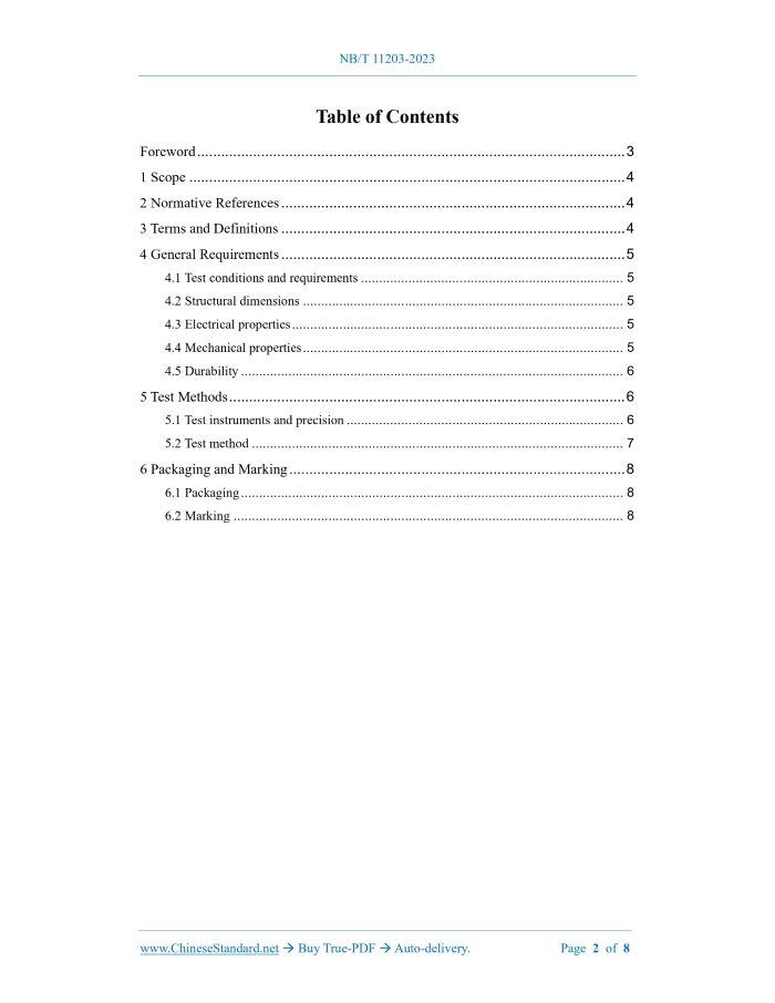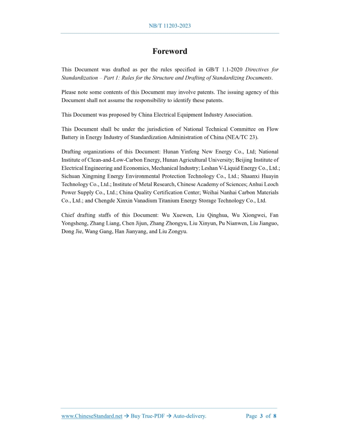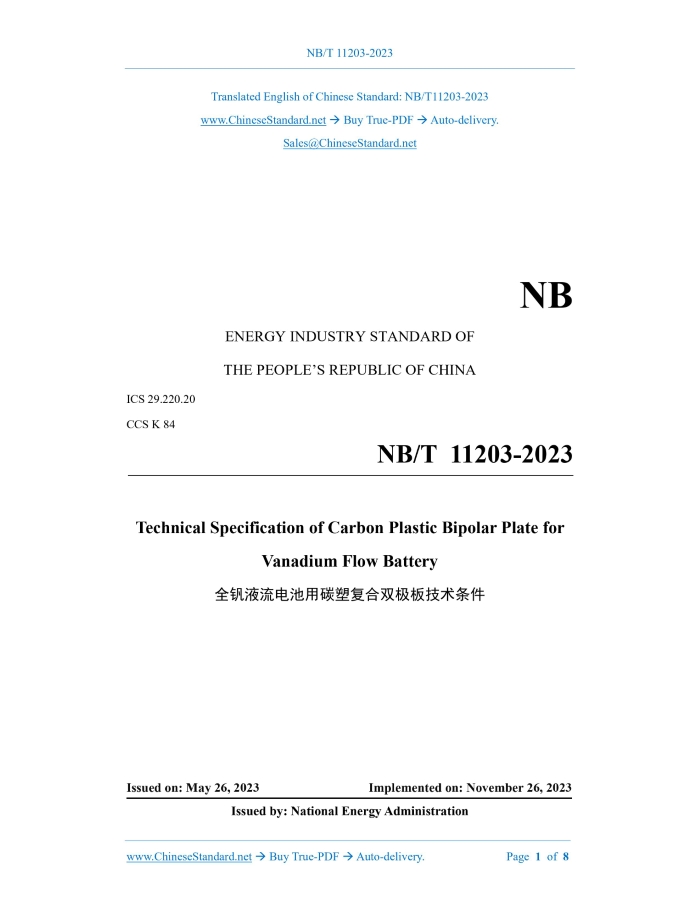 Similar standardsNB/T 11203-2023: Technical specification of carbon plastic bipolar plate for vanadium flow battery---This is an excerpt. Full copy of true-PDF in English version (including equations, symbols, images, flow-chart, tables, and figures etc.), auto-downloaded/delivered in 9 seconds, can be purchased online: https://www.ChineseStandard.net/PDF.aspx/NBT11203-2023 NB ENERGY INDUSTRY STANDARD OF THE PEOPLE’S REPUBLIC OF CHINA ICS 29.220.20 CCS K 84 Technical Specification of Carbon Plastic Bipolar Plate for Vanadium Flow Battery ISSUED ON: MAY 26, 2023 IMPLEMENTED ON: NOVEMBER 26, 2023 Issued by: National Energy Administration Table of ContentsForeword ... 3 1 Scope ... 4 2 Normative References ... 4 3 Terms and Definitions ... 4 4 General Requirements ... 5 4.1 Test conditions and requirements ... 5 4.2 Structural dimensions ... 5 4.3 Electrical properties ... 5 4.4 Mechanical properties ... 5 4.5 Durability ... 6 5 Test Methods ... 6 5.1 Test instruments and precision ... 6 5.2 Test method ... 7 6 Packaging and Marking ... 8 6.1 Packaging ... 8 6.2 Marking ... 8ForewordThis Document was drafted as per the rules specified in GB/T 1.1-2020 Directives for Standardization – Part 1: Rules for the Structure and Drafting of Standardizing Documents. Please note some contents of this Document may involve patents. The issuing agency of this Document shall not assume the responsibility to identify these patents. This Document was proposed by China Electrical Equipment Industry Association. This Document shall be under the jurisdiction of National Technical Committee on Flow Battery in Energy Industry of Standardization Administration of China (NEA/TC 23). Drafting organizations of this Document: Hunan Yinfeng New Energy Co., Ltd; National Institute of Clean-and-Low-Carbon Energy, Hunan Agricultural University; Beijing Institute of Electrical Engineering and Economics, Mechanical Industry; Leshan V-Liquid Energy Co., Ltd.; Sichuan Xingming Energy Environmental Protection Technology Co., Ltd.; Shaanxi Huayin Technology Co., Ltd.; Institute of Metal Research, Chinese Academy of Sciences; Anhui Leoch Power Supply Co., Ltd.; China Quality Certification Center; Weihai Nanhai Carbon Materials Co., Ltd.; and Chengde Xinxin Vanadium Titanium Energy Storage Technology Co., Ltd. Chief drafting staffs of this Document: Wu Xuewen, Liu Qinghua, Wu Xiongwei, Fan Yongsheng, Zhang Liang, Chen Jijun, Zhang Zhongyu, Liu Xinyun, Pu Nianwen, Liu Jianguo, Dong Jie, Wang Gang, Han Jianyang, and Liu Zongyu. Technical Specification of Carbon Plastic Bipolar Plate for Vanadium Flow Battery1 ScopeThis Document specifies the general conditions, test methods, marking and packaging of carbon-plastic composite bipolar plate for vanadium flow battery.2 Normative ReferencesThe provisions in following documents become the essential provisions of this Document through reference in this Document. For the dated documents, only the versions with the dates indicated are applicable to this Document; for the undated documents, only the latest version (including all the amendments) is applicable to this Document. GB/T 191-2008 Packaging - Pictorial Marking for Handling of Goods GB/T 8719-2022 General rule for packing, marking, storage, transport and quality certificates of carbonaceous material and products GB/T 29840-2013 Vanadium flow battery - Terminology JB/T 7758.2-2005 Specifications of flexible graphite sheets NB/T 42007-2013 Bipolar Plate for Vanadium Flow Battery - Test Method NB/T 42080-2016 Ion conductive membrane for Vanadium flow battery - Test method NB/T 42082-2016 Vanadium flow battery - Test method for electrode3 Terms and DefinitionsFor the purposes of this Document, the terms and definitions given in GB/T 29840-2013 and the following apply. 3.1 Carbon-plastic composite bipolar plate A bipolar plate for a vanadium flow battery made of carbon and plastic (polymer or polymer derivative).4 General Requirements4.1 Test conditions and requirements --- Temperature: 25℃±5℃; --- Pressure: 86 kPa~106 kPa; --- Air humidity: 10%~96%. 4.2 Structural dimensions 4.2.1 Thickness uniformity requirements The thickness dimensional deviation shall comply with the following provisions: when the average thickness d≤0.4 mm, the difference between the maximum and minimum thickness values ≤6%d; when 0.4< d≤1.0 mm, the difference between the maximum and minimum thickness values ≤5%d; when d >1.0 mm, the difference between the maximum and minimum thickness values ≤4%d. See 5.2 a) for the test method. 4.2.2 Dimensional deviation Dimensional deviation in length and width shall be ≤ ±1 mm. Measure the length and width of the material with a steel ruler. The specific dimensional requirements of products of different specifications shall be negotiated by the supplier and the purchaser. 4.3 Electrical properties Volume resistivity shall be ≤0.15 Ω·cm, and the surface resistance in the direction perpendicular to the bipolar plate panel shall be ≤0.1 Ω·cm2; the pressure range is 0.5 MPa~0.6 MPa, and the contact resistance with the carbon felt surface shall be ≤0.1 Ω·cm2. See 5.2 b) for the test method. 4.4 Mechanical properties 4.4.1 Bending strength requirements Bending strength shall be ≥20 MPa. See 5.2 c) for the test method. 4.4.2 Tensile strength requirements Tensile strength shall be ≥10 MPa. See 5.2 d) for the test method. 4.4.3 Compressive strength requirements Compressive strength shall be ≥20 MPa. See 5.2 e) for the test method. ......Source: Above contents are excerpted from the full-copy PDF -- translated/reviewed by: www.ChineseStandard.net / Wayne Zheng et al. Tips & Frequently Asked Questions:Question 1: How long will the true-PDF of English version of NB/T 11203-2023 be delivered?Answer: The full copy PDF of English version of NB/T 11203-2023 can be downloaded in 9 seconds, and it will also be emailed to you in 9 seconds (double mechanisms to ensure the delivery reliably), with PDF-invoice