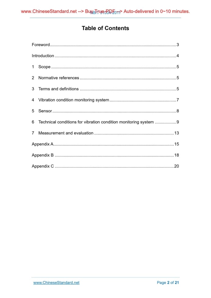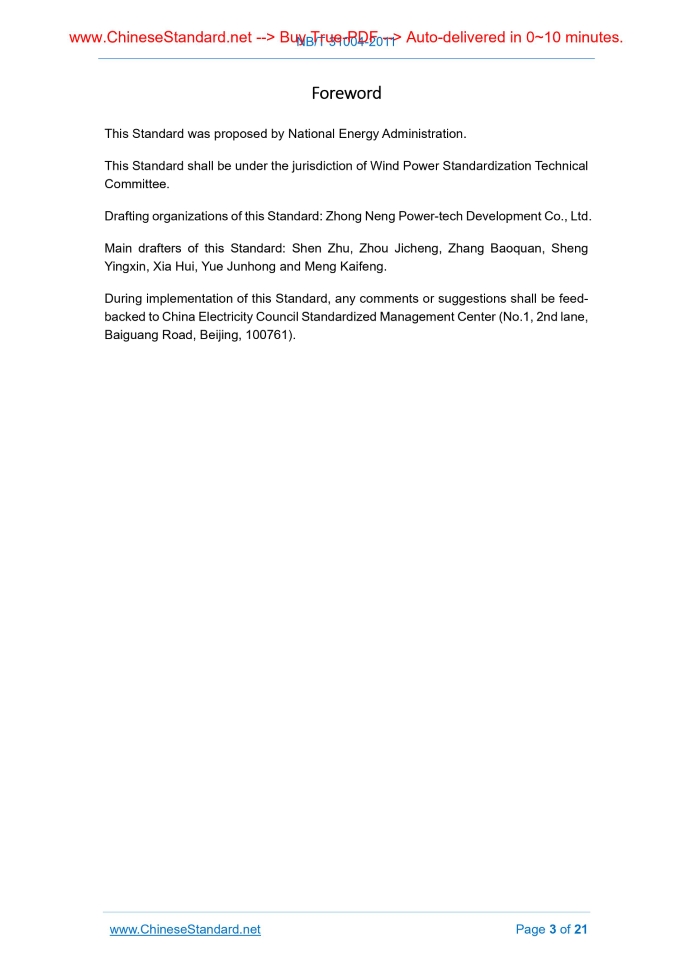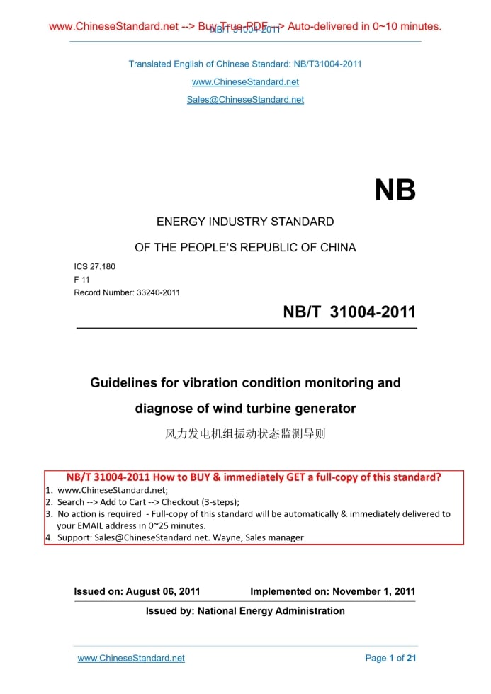 Similar standardsNB/T 31004-2011: Guidelines for vibration condition monitoring and diagnose of wind turbine generator---This is an excerpt. Full copy of true-PDF in English version (including equations, symbols, images, flow-chart, tables, and figures etc.), auto-downloaded/delivered in 9 seconds, can be purchased online: https://www.ChineseStandard.net/PDF.aspx/NBT31004-2011 NB ENERGY INDUSTRY STANDARD ICS 27.180 F 11 Record Number. 33240-2011 Guidelines for vibration condition monitoring and diagnose of wind turbine generator Issued on: AUGUST 06, 2011 Implemented on: NOVEMBER 1, 2011 Issued by. National Energy Administration Table of ContentsForeword... 3 Introduction... 4 1 Scope... 5 2 Normative references... 5 3 Terms and definitions... 5 4 Vibration condition monitoring system... 7 5 Sensor... 8 6 Technical conditions for vibration condition monitoring system... 9 7 Measurement and evaluation... 13 Appendix A... 15 Appendix B... 18 Appendix C... 20ForewordThis Standard was proposed by National Energy Administration. This Standard shall be under the jurisdiction of Wind Power Standardization Technical Committee. Drafting organizations of this Standard. Zhong Neng Power-tech Development Co., Ltd. Main drafters of this Standard. Shen Zhu, Zhou Jicheng, Zhang Baoquan, Sheng Yingxin, Xia Hui, Yue Junhong and Meng Kaifeng. During implementation of this Standard, any comments or suggestions shall be feed- backed to China Electricity Council Standardized Management Center (No.1, 2nd lane, Baiguang Road, Beijing, 100761).IntroductionVibration condition monitoring of wind turbine generator (hereinafter referred to as “wind turbine”) refers to monitoring the variation of wind turbine’s vibration condition, assessing the condition of wind turbine, detecting and tracking equipment failure in early stage by selecting different monitoring position according to the type of wind turbine that shall be monitored. This Standard is used to provide corresponding provisions and guidance for manufacturer, installer, user, certification organization as well as relative technical staff of wind turbine’s vibration condition monitoring. Guidelines for vibration condition monitoring and diagnose of wind turbine generator1 ScopeThis Standard specifies the system type of wind turbine’s vibration condition monitoring, sensor installation principle, measurement type and measured value, technical conditions of vibration condition monitoring system, evaluation of vibration value as well as signal treatment and analysis method. This Standard is applicable to the horizontal axis wind turbine of which the unit capacity is greater than or equals to 1.5 MW. Other wind turbines may reference to this Standard according to their own features.2 Normative referencesThe following referenced documents are indispensable for the application of this document. For dated references, only the edition cited applies. For undated references, the latest edition of the referenced document (including any amendments) applies. GB/T 19873.1-2005 Condition monitoring and diagnostics of machines - Vibration condition monitoring - Part 1.General procedures GB/T 19873.2-2009 Condition monitoring and diagnostics of machines - Vibration condition monitoring - Part 2.Processing analysis and presentation of vibration data IEC 61850-2002 Communication networks and systems in substations3 Terms and definitionsThe following terms and definitions apply to this Standard. 3.1 Breakdown maintenance Maintenance after wind turbine failure. 3.2 Condition-based maintenance Maintenance determined according to wind turbine condition. 3.3 Condition monitoring Detected and gathered information and data that reflect wind turbine condition. 3.4 Diagnostics Symptom and syndrome inspections for determination of nature (type, condition, degree) of the fault or failure. 3.5 Failure The ability of failing to perform certain specified function. 3.6 Fault The condition of parts when a part or a module of wind turbine degrades, or anomalous condition occurs, which may cause wind turbine failure. 3.7 Alarm The operating signal or message designed for informing staff when selected parameter or its logical combination is abnormal. 3.8 Alert The operating signal or message designed for informing staff when selected parameter or its logical combination is abnormal and requires more attention. 3.9 Sign Characteristic parameters of signal that indicate the condition of relative information. 3.10 Vibration signal Measurement of all frequency components that are contained in a system vibration. 3.11 Frequency domain Physical quantity that takes frequency as measurement. 3.12 Time domain Physical quantity that takes time as measurement. 3.13 Cross-channel analysis Using two or more analyzers of input channel to realize functions such as phase, relevance and transfer function calculation. 3.14 Baseline Single or a group of descriptors that provides baseline for wind turbine’s normal condition in various processes. 3.15 Waterfall Three-dimensional multi-spectral display of relative time or speed.4 Vibration condition monitoring system4.1 Types of vibration condition monitoring system Vibration condition monitoring system is divided into fixed installation system, semi- fixed installation system and portable system. 4.1.1 Fixed installation system System sensor and data collection device adopt fixed installation. Data collection shall be continuous or periodic. Fixed installation system usually is used for wind turbine with complex monitoring tasks. 4.1.2 Semi-fixed installation system System sensor adopts fixed installation. Data collection device adopts non-fixed installation; connect only during data collection. Data collection is periodic. 4.1.3 Portable system System sensor and data collection device all adopt non-fixed installation. Data shall be collected by portable data collector. Data collection is periodic. 4.1.4 System selection principle a) Offshore wind turbin
