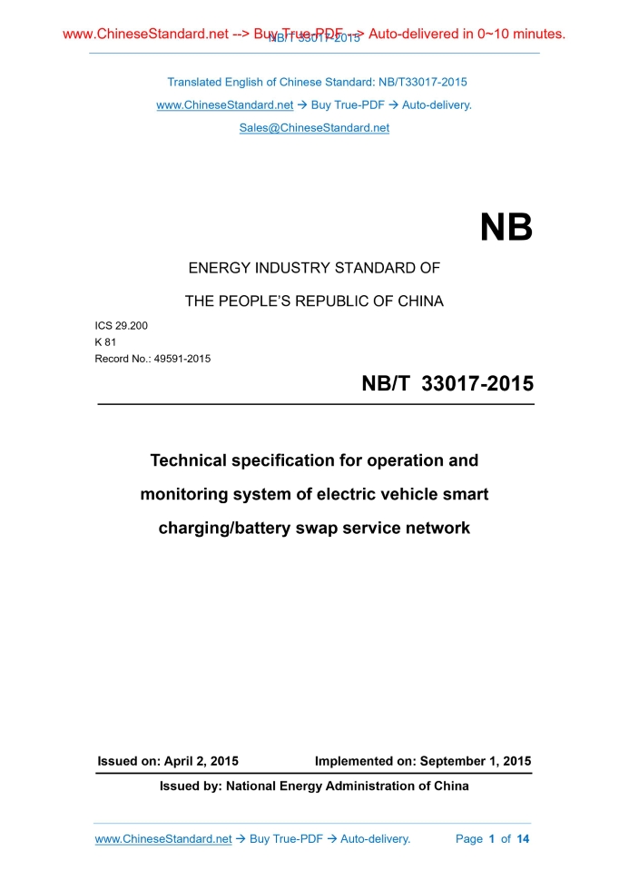 NB/T 33017-2015: Technical specification for operation and monitoring system of electric vehicle smart charging/battery swap service network Delivery: 9 seconds. True-PDF full-copy in English & invoice will be downloaded + auto-delivered via email. See step-by-step procedure Status: Obsolete NB/T 33017: Historical versions
