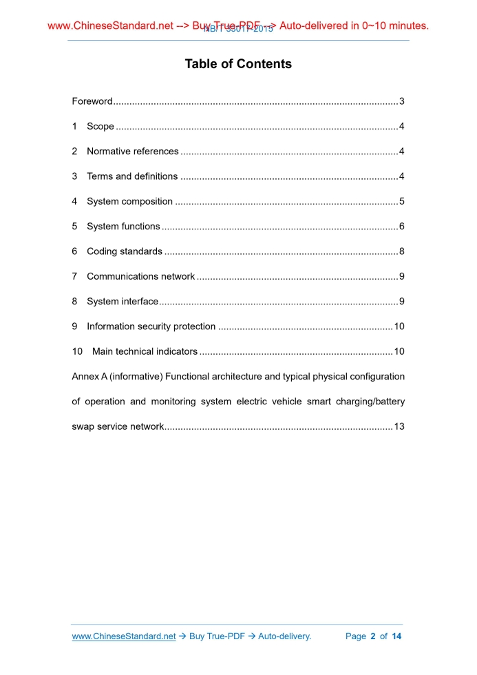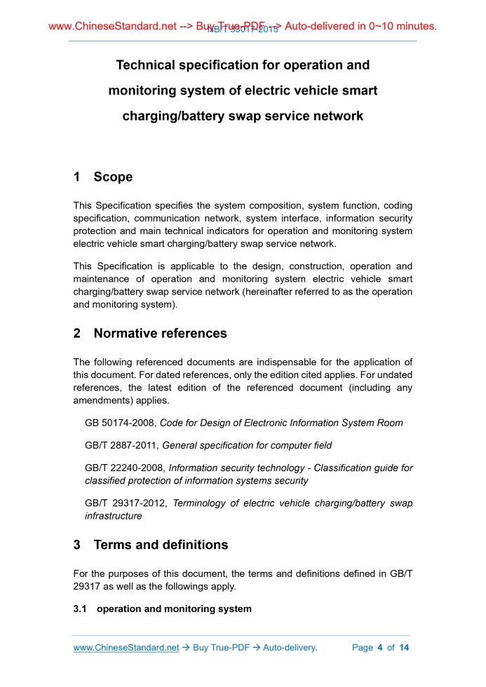 Similar standardsNB/T 33017-2015: Technical specification for operation and monitoring system of electric vehicle smart charging/battery swap service network---This is an excerpt. Full copy of true-PDF in English version (including equations, symbols, images, flow-chart, tables, and figures etc.), auto-downloaded/delivered in 9 seconds, can be purchased online: https://www.ChineseStandard.net/PDF.aspx/NBT33017-2015 NB ENERGY INDUSTRY STANDARD OF THE PEOPLE’S REPUBLIC OF CHINA ICS 29.200 K 81 Record No.. 49591-2015 Technical specification for operation and monitoring system of electric vehicle smart charging/battery swap service network Issued on: APRIL 2, 2015 Implemented on: SEPTEMBER 1, 2015 Issued by. National Energy Administration of China Table of ContentsForeword... 3 1 Scope... 4 2 Normative references... 4 3 Terms and definitions... 4 4 System composition... 5 5 System functions... 6 6 Coding standards... 8 7 Communications network... 9 8 System interface... 9 9 Information security protection... 10 10 Main technical indicators... 10 Annex A (informative) Functional architecture and typical physical configuration of operation and monitoring system electric vehicle smart charging/battery swap service network... 13 Technical specification for operation and monitoring system of electric vehicle smart charging/battery swap service network1 ScopeThis Specification specifies the system composition, system function, coding specification, communication network, system interface, information security protection and main technical indicators for operation and monitoring system electric vehicle smart charging/battery swap service network. This Specification is applicable to the design, construction, operation and maintenance of operation and monitoring system electric vehicle smart charging/battery swap service network (hereinafter referred to as the operation and monitoring system).2 Normative referencesThe following referenced documents are indispensable for the application of this document. For dated references, only the edition cited applies. For undated references, the latest edition of the referenced document (including any amendments) applies. GB 50174-2008, Code for Design of Electronic Information System Room GB/T 2887-2011, General specification for computer field GB/T 22240-2008, Information security technology - Classification guide for classified protection of information systems security GB/T 29317-2012, Terminology of electric vehicle charging/battery swap infrastructure3 Terms and definitionsFor the purposes of this document, the terms and definitions defined in GB/T 29317 as well as the followings apply. 3.1 operation and monitoring system It shall have the function of verifying, classifying, reconciling, statistics and clearing settlement between all relevant organizations. 5.1.5 Asset management It shall have the function of standardizing and managing various business links of battery and equipment status, and realize the management of asset life cycle, including battery management, equipment management, etc. 5.1.6 Distribution management It shall have the functions from the distribution center warehouse, the lower level warehouse, site distribution management, emergency battery distribution service, cross-regional distribution management, including vehicle management, distribution application, distribution plan, delivery execution, distribution transfer and distribution quality management. 5.1.7 Operation management It shall have the functions of on-site inspection, inspection and periodic verification management of facilities, batteries and electric vehicles on a regular basis, and determine the operation status of the equipment, judge the hidden troubles of the equipment and perform corresponding treatment according to the verification results, including periodic inspection, temporary inspection and overhaul management, on-site inspection, commissioning management, equipment maintenance, daily shift change management. 5.1.8 Centralized monitoring It shall have real-time status and video information such as charging stations, battery exchange stations, vehicles, batteries, etc., to achieve remote monitoring functions, including business supervision, operation monitoring, video monitoring, vehicle monitoring and battery monitoring. 5.1.9 Comprehensive statistical analysis It shall have the functions of statistics, query and output of various data of the system through the customization and execution of the report subject, row, column and statistical scheme, including report template maintenance, report statistics and report query. 5.1.10 System management It shall have the functions of configuring organization, personnel, authority, system parameters and business processes. It shall have functions of log management, message service, document management. 5.2 Extensions 8.2 Interface security requirements Special security technology implementation strategies shall be developed to ensure the security of interface data transmission and data processing. Interface security controls include. security assessment, access control, intrusion detection, password authentication, security auditing, anti-malware, encryption, etc.9 Information security protection9.1 Overall objective a) Prevent system crash or vandalism from affecting normal charging and replacing services. b) Resist the internal and external personnel's information attacks on operational monitoring systems and charging/battery swap service facilities. c) Prevent unauthorized operations and damage to unauthorized systems. d) Prevent computer viruses from infecting and invading the system. e) Ensure the safety of the generation, storage, transmission and use of monitoring data. 9.2 Protection requirements The information security protection of the operation and monitoring system refers to the third-level standard in GB/T 22240-2008.According to the degree of infringement of the object and the object infringed when the 