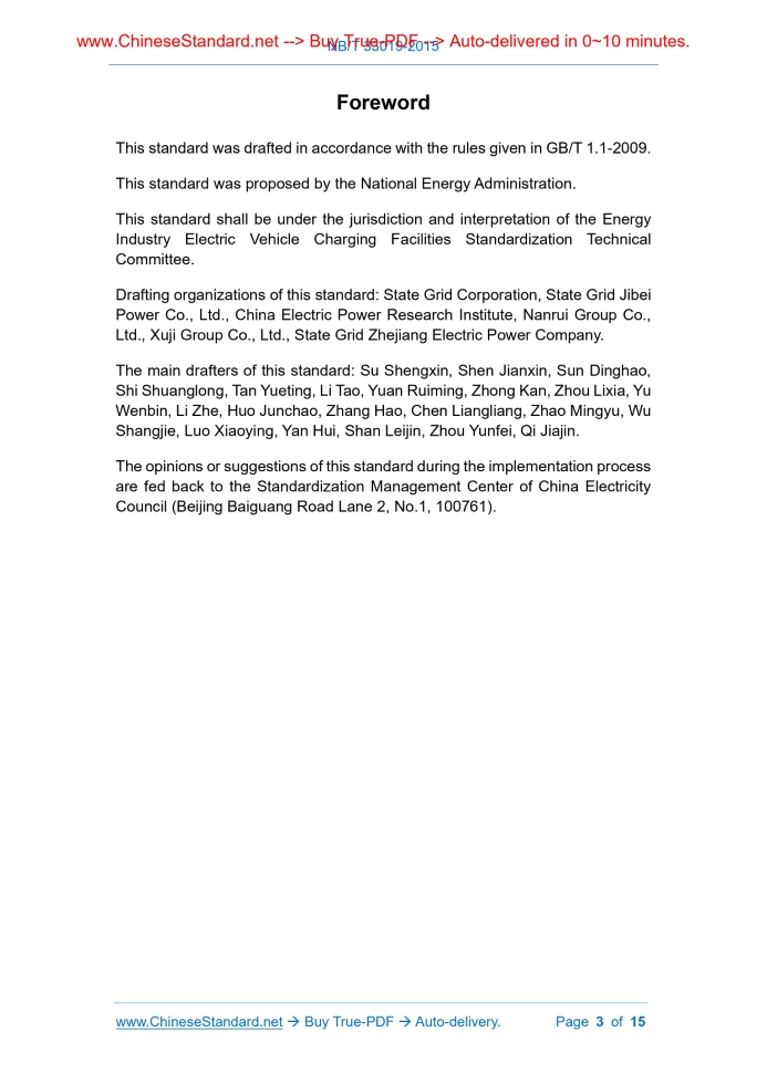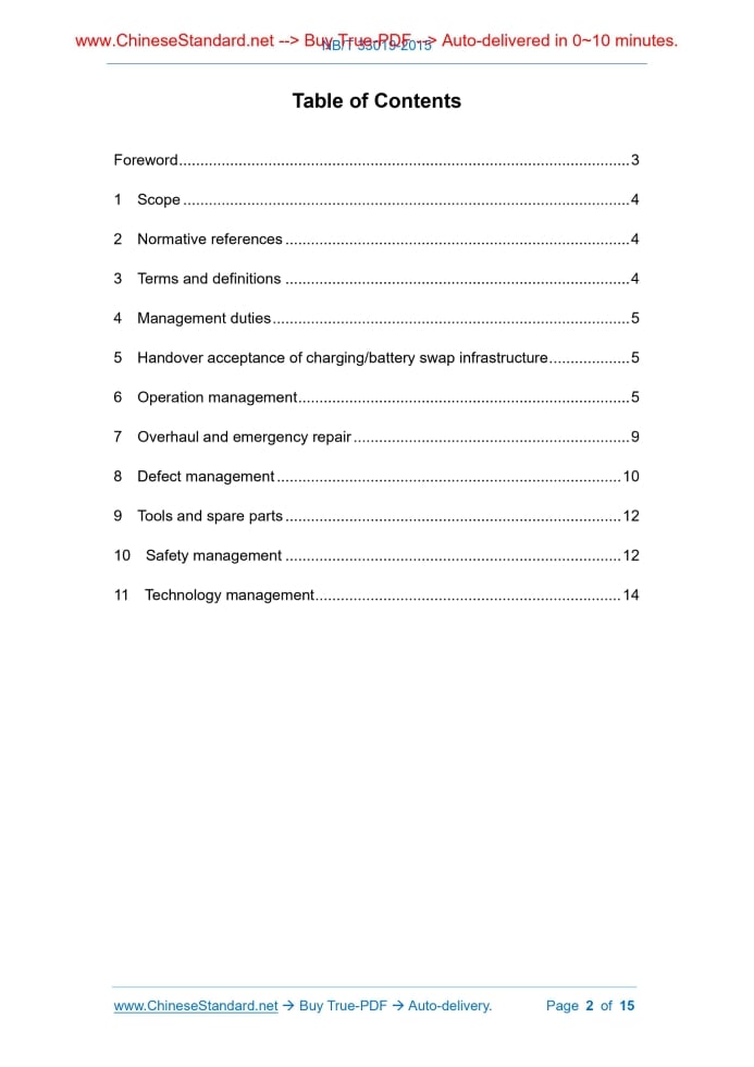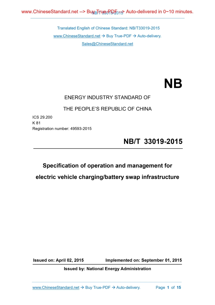 Similar standardsNB/T 33019-2015: Specification of operation and management for electric vehicle charging/battery swap infrastructure---This is an excerpt. Full copy of true-PDF in English version (including equations, symbols, images, flow-chart, tables, and figures etc.), auto-downloaded/delivered in 9 seconds, can be purchased online: https://www.ChineseStandard.net/PDF.aspx/NBT33019-2015 NB ENERGY INDUSTRY STANDARD OF THE PEOPLE’S REPUBLIC OF CHINA ICS 29.200 K 81 Registration number. 49593-2015 Specification of operation and management for electric vehicle charging/battery swap infrastructure Issued on: APRIL 02, 2015 Implemented on: SEPTEMBER 01, 2015 Issued by. National Energy Administration Table of ContentsForeword... 3 1 Scope... 4 2 Normative references... 4 3 Terms and definitions... 4 4 Management duties... 5 5 Handover acceptance of charging/battery swap infrastructure... 5 6 Operation management... 5 7 Overhaul and emergency repair... 9 8 Defect management... 10 9 Tools and spare parts... 12 10 Safety management... 12 11 Technology management... 14ForewordThis standard was drafted in accordance with the rules given in GB/T 1.1-2009. This standard was proposed by the National Energy Administration. This standard shall be under the jurisdiction and interpretation of the Energy Industry Electric Vehicle Charging Facilities Standardization Technical Committee. Drafting organizations of this standard. State Grid Corporation, State Grid Jibei Power Co., Ltd., China Electric Power Research Institute, Nanrui Group Co., Ltd., Xuji Group Co., Ltd., State Grid Zhejiang Electric Power Company. The main drafters of this standard. Su Shengxin, Shen Jianxin, Sun Dinghao, Shi Shuanglong, Tan Yueting, Li Tao, Yuan Ruiming, Zhong Kan, Zhou Lixia, Yu Wenbin, Li Zhe, Huo Junchao, Zhang Hao, Chen Liangliang, Zhao Mingyu, Wu Shangjie, Luo Xiaoying, Yan Hui, Shan Leijin, Zhou Yunfei, Qi Jiajin. The opinions or suggestions of this standard during the implementation process are fed back to the Standardization Management Center of China Electricity Council (Beijing Baiguang Road Lane 2, No.1, 100761). Specification of operation and management for electric vehicle charging/battery swap infrastructure1 ScopeThis standard specifies the operational management duties, management content and related requirements for electric vehicle charging/battery swap infrastructure. This standard is applicable to electric vehicle charging/battery swap infrastructure using conductive charging, including charging stations, battery replacement stations, battery distribution centers, charging spots, etc.2 Normative referencesThe following documents are essential to the application of this document. For the dated documents, only the versions with the dates indicated are applicable to this document; for the undated documents, only the latest version (including all the amendments) are applicable to this standard. GB/T 19596-2004 Terminology of electric vehicles GB/T 29317-2012 Terminology of electric vehicle charging/battery swap infrastructure GB/T 29318-2012 Electric energy metering for electric vehicle off-board charger GB/T 28569-2012 Electric energy metering for electric vehicle AC charging spot GB 50229-2006 Code for design of fire protection for fossil fuel power plants and substations DL/T 448-2000 Technical administrative code of electric energy metering3 Terms and definitionsThe terms and definitions established in GB/T 29317-2012 apply to this standard. b) The cable is in good contact and the connector is not overheated; the charging bracket is in good contact and the contact locking mechanism is in good condition; c) The indication instrument and signal indication are normal; d) The appearance, function and safety protection of the AC charging spot are normal; e) The appearance of the battery box is clean; the casing is free of cracks and liquid leakage; f) The monitoring system display is normal, the computer and other hardware are running normally, the communication channel is normal; g) The charging/battery swap area, battery storage rack and battery detection and maintenance area are well ventilated, the lighting and firefighting equipment are in good condition, the temperature meets the requirements, and there are no flammable or explosive materials; h) Safety and firefighting equipment are placed in accordance with regulations, easy to access, the firefighting channel is free from blockage. 6.3.3 Special patrol inspection Special patrol inspections of charging/battery swap infrastructure shall be carried out. a) When there is special weather such as wind, fog, rain, ice, and hail; b) When the equipment is newly put into operation or put into operation again after being repaired, rebuilt, or long-term outage; c) When suspicious phenomena are found during operation of the equipment. 6.4 Charging/battery swap operation a) The charging/battery swap operation procedures or work instructions shall be formulated to regulate the charging/battery swap operations; b) Safety protective gear such as overalls and insulated shoes shall be worn during operation. During manual charging/battery swap operation, there shall be personnel monitoring; c) It shall confirm that the charging connection is correct before charging; d) During battery swap operation, it shall be carried out in strict accordance with the battery swap process; the development of the accident, isolate the fault point, and remove its threat to personal and equipment safety; c) When handling accidents, comprehensive analysis shall be carried out in accordance with the weather, working conditions, monitoring signals, metering instructions, etc. at that time, and the nature and scope of the accident shall be judged in time; d) After the emergency repair is completed, detailed records shall be made and the on-site accident handling report shall be sorted in time.8 Defect management8.1 Defect classification Charging/battery swap infrastructure can be classif