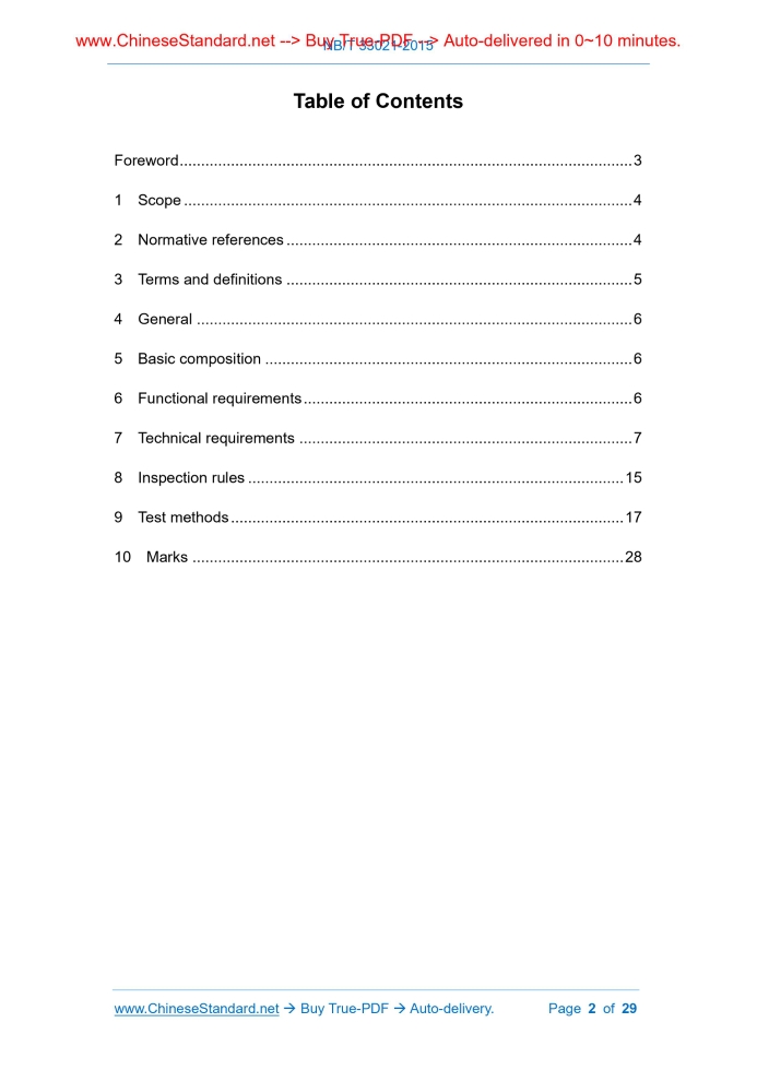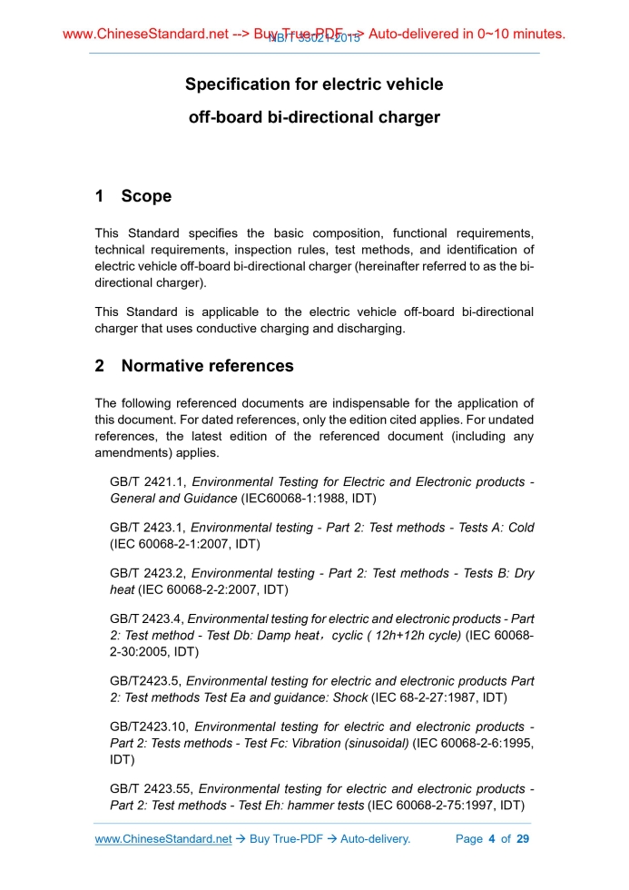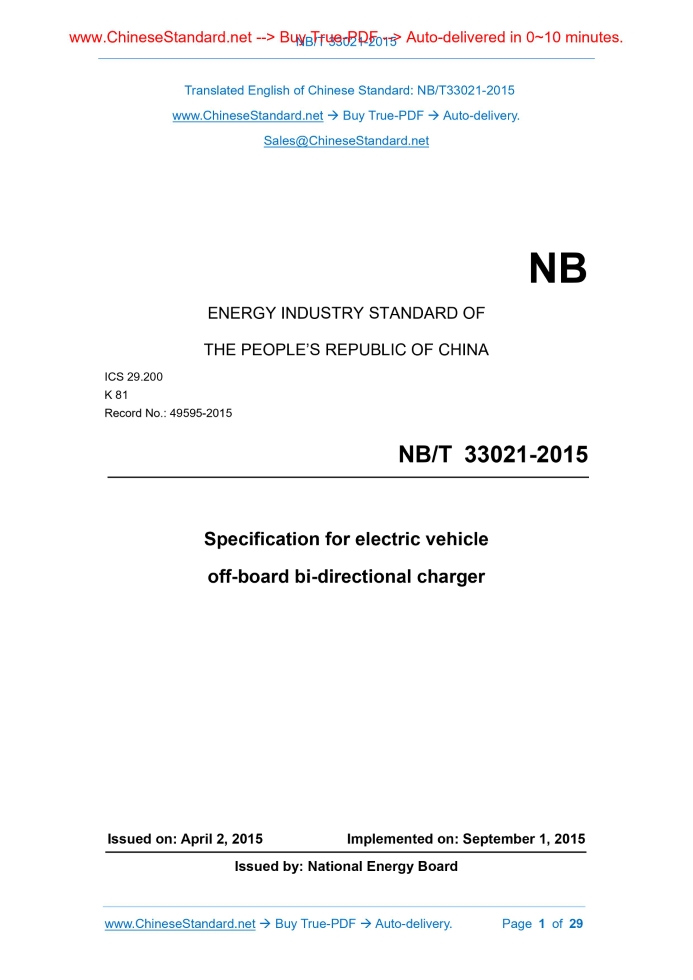 Similar standardsNB/T 33021-2015: Specification for electric vehicle off-board bi-directional charger---This is an excerpt. Full copy of true-PDF in English version (including equations, symbols, images, flow-chart, tables, and figures etc.), auto-downloaded/delivered in 9 seconds, can be purchased online: https://www.ChineseStandard.net/PDF.aspx/NBT33021-2015NB ENERGY INDUSTRY STANDARD OF THE PEOPLE’S REPUBLIC OF CHINA ICS 29.200 K 81 Record No.. 49595-2015 Specification for electric vehicle off-board bi-directional charger Issued on: APRIL 2, 2015 Implemented on: SEPTEMBER 1, 2015 Issued by. National Energy Board Table of ContentsForeword... 3 1 Scope... 4 2 Normative references... 4 3 Terms and definitions... 5 4 General... 6 5 Basic composition... 6 6 Functional requirements... 6 7 Technical requirements... 7 8 Inspection rules... 15 9 Test methods... 17 10 Marks... 28 Specification for electric vehicle off-board bi-directional charger1 ScopeThis Standard specifies the basic composition, functional requirements, technical requirements, inspection rules, test methods, and identification of electric vehicle off-board bi-directional charger (hereinafter referred to as the bi- directional charger). This Standard is applicable to the electric vehicle off-board bi-directional charger that uses conductive charging and discharging.2 Normative referencesThe following referenced documents are indispensable for the application of this document. For dated references, only the edition cited applies. For undated references, the latest edition of the referenced document (including any amendments) applies. GB/T 2421.1, Environmental Testing for Electric and Electronic products - General and Guidance (IEC60068-1.1988, IDT) GB/T 2423.1, Environmental testing - Part 2.Test methods - Tests A. Cold (IEC 60068-2-1.2007, IDT) GB/T 2423.2, Environmental testing - Part 2.Test methods - Tests B. Dry heat (IEC 60068-2-2.2007, IDT) GB/T 2423.4, Environmental testing for electric and electronic products - Part 2.Test method - Test Db. Damp heat, cyclic (12h+12h cycle) (IEC 60068- 2-30.2005, IDT) GB/T2423.5, Environmental testing for electric and electronic products Part 2.Test methods Test Ea and guidance. Shock (IEC 68-2-27.1987, IDT) GB/T2423.10, Environmental testing for electric and electronic products - Part 2.Tests methods - Test Fc. Vibration (sinusoidal) (IEC 60068-2-6.1995, IDT) GB/T 2423.55, Environmental testing for electric and electronic products - Part 2.Test methods - Test Eh. hammer tests (IEC 60068-2-75.1997, IDT) GB/T 3859.1, Semiconductor converters - General requirements and line commutated converters - Part 1-1.Specification of basic requirements (IEC 60146-1-1.2009, MOD) GB 4208, Degrees of Protection Provided By Enclosure (IP Code) (IEC 60529.2001, IDT) GB 9254, Information technology equipment - Radio disturbance characteristics - Limits and methods of measurement (IEC/CISPR 22.2006, IDT) GB/T 17626.2, Electromagnetic compatibility - Testing and measurement techniques - Electrostatic discharge immunity test (IEC 61000-4-2.2001, IDT) GB/T 17626.3, Electromagnetic compatibility - Testing and measurement techniques - Radiated, radio-frequency, electromagnetic field immunity test (IEC 61000-4-3.2002, IDT) GB/T 17626.4, Electromagnetic compatibility - Testing and measurement techniques - Electrical fast transient/burst immunity test (IEC 61000-4-4. 2004, IDT) GB/T 17626.5, Electromagnetic compatibility - Testing and measurement techniques - Surge immunity test (IEC 61000-4-5.2005, IDT) GB/T 18487.1, Electric vehicle conductive charging system - Part 1.General requirements GB/T 19826 2005, General specification and safety requirement for DC power supply equipment of power projects GB/T 29317, Terminology of electric vehicle charging/battery swap infrastructure3 Terms and definitionsFor the purposes of this document, the terms and definitions defined in GB/T 18487.1 and GB/T 29317 as well as the followings apply. bi-directional charger a device for realizing bidirectional electric energy conversion between an electric vehicle battery system and a power grid 7.1.1 Working environment temperature. 20°C ~ +50°C. 7.1.2 Relative humidity. 5% ~ 95% (according to no-condensation design). 7.1.3 Altitude. no more than 2000m. 7.1.4 In special circumstances, the use of the bi-directional charger shall be negotiated between the manufacturer and the user. 7.1.5 The place of use must not have explosive medium, and there are no harmful gases and conductive media surrounding corrosive and damaging insulation. 7.2 Normal electrical conditions 7.2.1 Frequency variation range. 50Hz ± 1Hz. 7.2.2 AC power supply voltage fluctuation range. 380V power grid is 323V ~ 437V, 220V power grid is 187V ~ 253V. 7.2.3 AC power supply voltage asymmetry does not exceed 5%. 7.2.4 Non-sinusoidal content of AC power supply voltage waveform is not more than 10%. 7.3 Environmental resistance 7.3.1 Protection level The casing protection level of the bi-directional charger shall not be lower than IP30 (indoor) or IP54 (outdoor) in GB 4208. 7.3.2 Three anti-proof (anti-moist, anti-mildew, anti-salt spray) protection Circuits such as printed circuit boards and connectors in the bi-directional charger shall be protected against moisture, mildew and salt spray. 7.3.3 Rust prevention (antioxidation prevention) The iron casing of the bi-directional charger and the exposed iron brackets and parts shall adopt double-layer anti-rust measures. Non-ferrous metal casings shall also have an oxidation protection film or be treated with oxidation protection. 7.3.4 Anti-theft The bi-directional charger for outdoor operation shall have the necessary anti- theft measures. 110% of the rated current. 7.7.12 The bi-directional charger shall be equipped with an emergency stop switch, which can stop charging and discharging urgently by manual or remote command. 7.7.13 When the bi-directional charger is properly connected to the battery, the charging pro