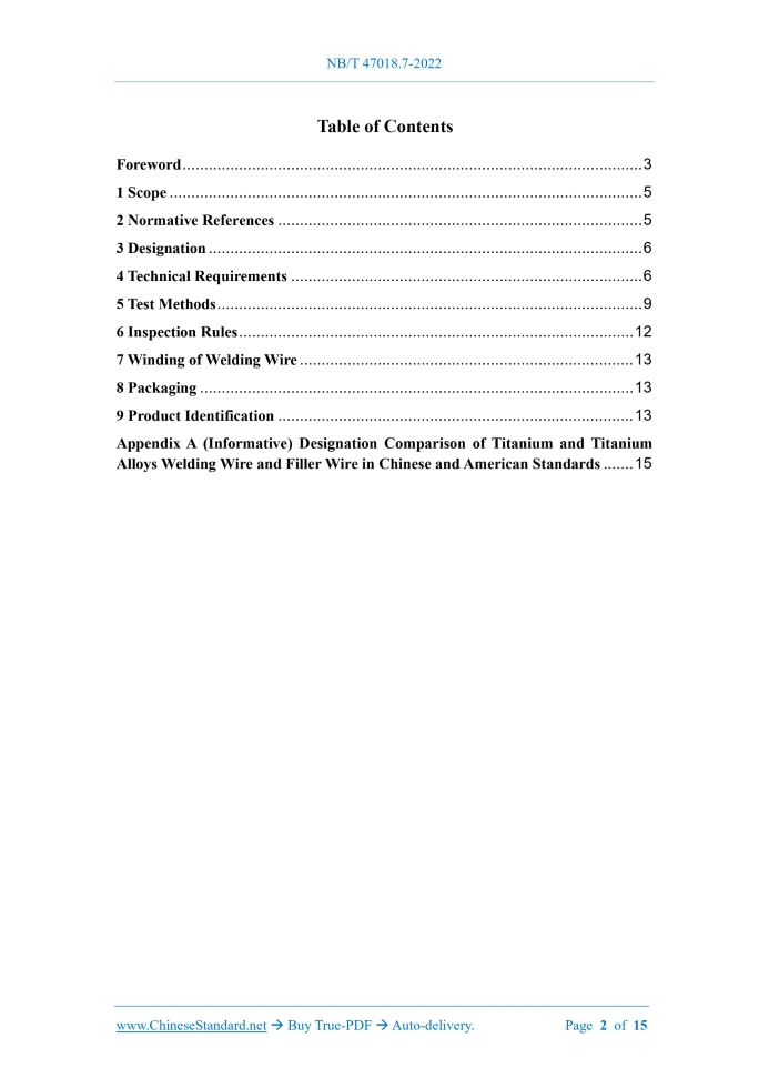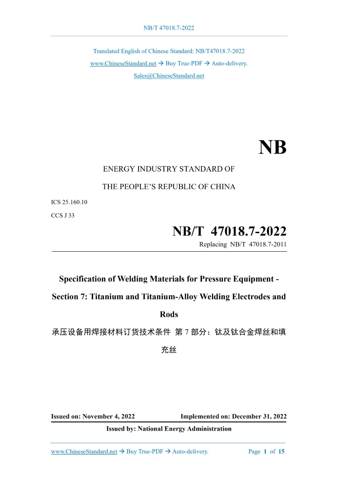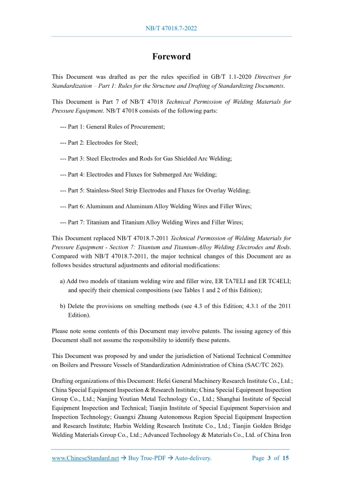 Similar standardsNB/T 47018.7-2022: Technical conditions for ordering welding materials for pressure equipment - Part 7: Titanium and titanium alloy welding wires and filler wires---This is an excerpt. Full copy of true-PDF in English version (including equations, symbols, images, flow-chart, tables, and figures etc.), auto-downloaded/delivered in 9 seconds, can be purchased online: https://www.ChineseStandard.net/PDF.aspx/NBT47018.7-2022 NB ENERGY INDUSTRY STANDARD OF THE PEOPLE’S REPUBLIC OF CHINA ICS 25.160.10 CCS J 33 Replacing NB/T 47018.7-2011 Specification of Welding Materials for Pressure Equipment - Section 7: Titanium and Titanium-Alloy Welding Electrodes and Rods 充丝 ISSUED ON: NOVEMBER 4, 2022 IMPLEMENTED ON: DECEMBER 31, 2022 Issued by: National Energy Administration Table of ContentsForeword ... 3 1 Scope ... 5 2 Normative References ... 5 3 Designation ... 6 4 Technical Requirements ... 6 5 Test Methods ... 9 6 Inspection Rules ... 12 7 Winding of Welding Wire ... 13 8 Packaging ... 13 9 Product Identification ... 13 Appendix A (Informative) Designation Comparison of Titanium and Titanium Alloys Welding Wire and Filler Wire in Chinese and American Standards ... 15ForewordThis Document was drafted as per the rules specified in GB/T 1.1-2020 Directives for Standardization – Part 1: Rules for the Structure and Drafting of Standardizing Documents. This Document is Part 7 of NB/T 47018 Technical Permission of Welding Materials for Pressure Equipment. NB/T 47018 consists of the following parts: --- Part 1: General Rules of Procurement; --- Part 2: Electrodes for Steel; --- Part 3: Steel Electrodes and Rods for Gas Shielded Arc Welding; --- Part 4: Electrodes and Fluxes for Submerged Arc Welding; --- Part 5: Stainless-Steel Strip Electrodes and Fluxes for Overlay Welding; --- Part 6: Aluminum and Aluminum Alloy Welding Wires and Filler Wires; --- Part 7: Titanium and Titanium Alloy Welding Wires and Filler Wires; This Document replaced NB/T 47018.7-2011 Technical Permission of Welding Materials for Pressure Equipment - Section 7: Titanium and Titanium-Alloy Welding Electrodes and Rods. Compared with NB/T 47018.7-2011, the major technical changes of this Document are as follows besides structural adjustments and editorial modifications: a) Add two models of titanium welding wire and filler wire, ER TA7ELI and ER TC4ELI; and specify their chemical compositions (see Tables 1 and 2 of this Edition); b) Delete the provisions on smelting methods (see 4.3 of this Edition; 4.3.1 of the 2011 Edition). Please note some contents of this Document may involve patents. The issuing agency of this Document shall not assume the responsibility to identify these patents. This Document was proposed by and under the jurisdiction of National Technical Committee on Boilers and Pressure Vessels of Standardization Administration of China (SAC/TC 262). Drafting organizations of this Document: Hefei General Machinery Research Institute Co., Ltd.; China Special Equipment Inspection & Research Institute; China Special Equipment Inspection Group Co., Ltd.; Nanjing Youtian Metal Technology Co., Ltd.; Shanghai Institute of Special Equipment Inspection and Technical; Tianjin Institute of Special Equipment Supervision and Inspection Technology; Guangxi Zhuang Autonomous Region Special Equipment Inspection and Research Institute; Harbin Welding Research Institute Co., Ltd.; Tianjin Golden Bridge Welding Materials Group Co., Ltd.; Advanced Technology & Materials Co., Ltd. of China Iron Specification of Welding Materials for Pressure Equipment - Section 7: Titanium and Titanium-Alloy Welding Electrodes and Rods1 ScopeThis Document specifies the designation compilation, technical requirements, test methods, inspection rules and product identification of titanium and titanium alloy welding wires and filler wires. This Document is applicable to titanium and titanium alloy welding wires and filler wires for gas tungsten arc welding, gas metal arc welding and plasma arc welding and other suitable melting welding methods of pressure equipment.2 Normative ReferencesThe provisions in following documents become the essential provisions of this Document through reference in this Document. For the dated documents, only the versions with the dates indicated are applicable to this Document; for the undated documents, only the latest version (including all the amendments) is applicable to this Document. GB/T 2653 Bend test methods on welded joints GB/T 3620.1 Designation and Composition of Titanium and Titanium Alloys GB/T 3623 Titanium and titanium alloy wire GB/T 4698 (all parts) Methods for chemical analysis of titanium sponge, titanium and titanium alloys GB/T 5168 Microstructure and macrostructure examination for titanium and titanium alloys AWS A5.16 Titanium and titanium alloy welding wire and filler wire NB/T 47014 Welding procedure qualification for pressure equipment NB/T 47018.1 Technical permission of welding materials for pressure equipment - Part 1: General rule 4.4 The transverse metallographic inspection (macrostructure) results of titanium and titanium alloy welding wires and filler wires shall be free of cracks, folds, pores, delamination, shrinkage, metal or non-metal inclusions and other defects that affect use. 4.5 The surface of titanium and titanium alloy welding wires and filler wires shall be clean and smooth, free of burrs, depressions, scratches, scales, folds and other defects that affect use; and free of contamination by lubricants and other foreign substances. 4.6 After the weld metal longitudinal bending specimen is bent to the specified angle, there shall be no single opening defect with a length greater than 3 mm in any direction along the inner edge of the weld metal on the tensile surface. The corner opening defects of the specimen weld metal can be ignored; but the length of the corner opening defects caused by un-fusion, slag inclusions or other internal imperfections shall be included.