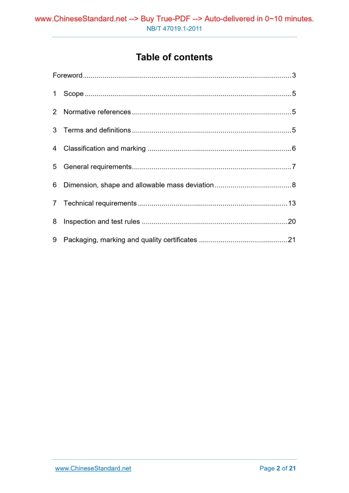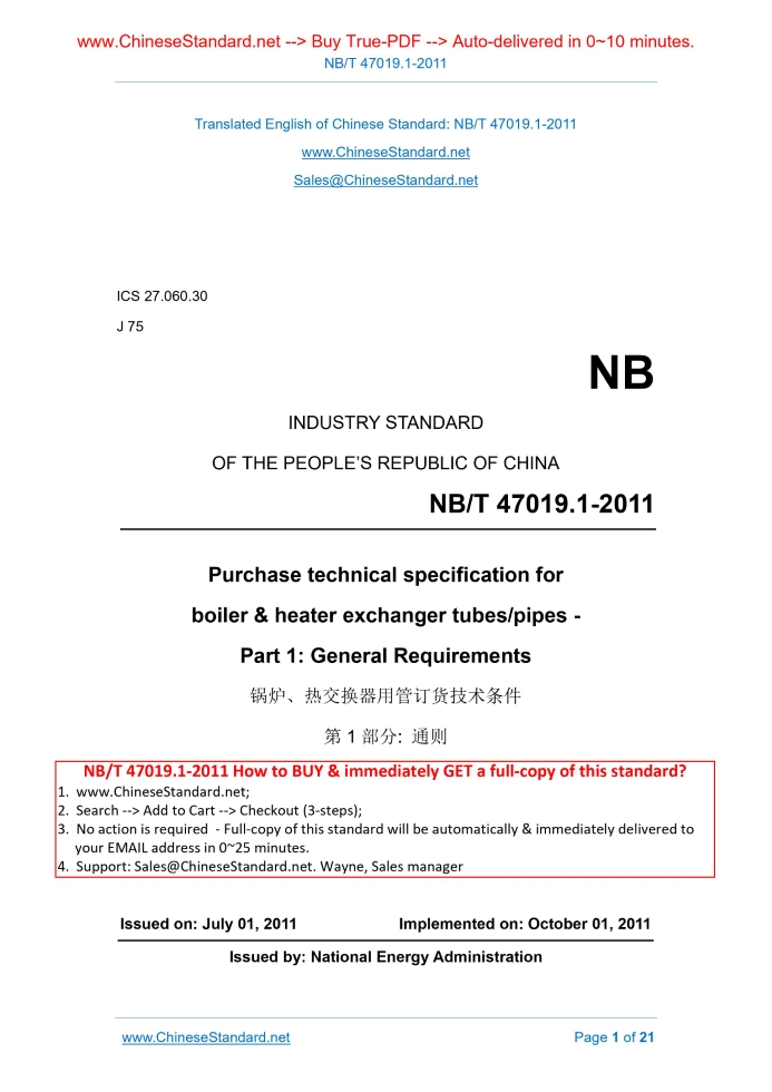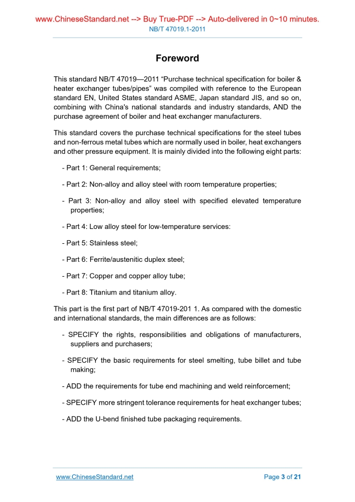 Similar standardsNB/T 47019.1-2011: Purchase technical specification for boiler and heater exchanger tubes/pipes. Part 1: General Requirements---This is an excerpt. Full copy of true-PDF in English version (including equations, symbols, images, flow-chart, tables, and figures etc.), auto-downloaded/delivered in 9 seconds, can be purchased online: https://www.ChineseStandard.net/PDF.aspx/NBT47019.1-2011 ICS 27.060.30 J 75 NB INDUSTRY STANDARD Purchase technical specification for boiler & heater exchanger tubes/pipes - Part 1.General Requirements Issued on: JULY 01, 2011 Implemented on: OCTOBER 01, 2011 Issued by. National Energy Administration Table of ContentsForeword... 3 1 Scope... 5 2 Normative references... 5 3 Terms and definitions... 5 4 Classification and marking... 6 5 General requirements... 7 6 Dimension, shape and allowable mass deviation... 8 7 Technical requirements... 13 8 Inspection and test rules... 20 9 Packaging, marking and quality certificates... 21ForewordThis standard NB/T 47019—2011 “Purchase technical specification for boiler & heater exchanger tubes/pipes” was compiled with reference to the European standard EN, United States standard ASME, Japan standard JIS, and so on, combining with China's national standards and industry standards, AND the purchase agreement of boiler and heat exchanger manufacturers. This standard covers the purchase technical specifications for the steel tubes and non-ferrous metal tubes which are normally used in boiler, heat exchangers and other pressure equipment. It is mainly divided into the following eight parts. - Part 1.General requirements; - Part 2.Non-alloy and alloy steel with room temperature properties; - Part 3.Non-alloy and alloy steel with specified elevated temperature properties; - Part 4.Low alloy steel for low-temperature services. - Part 5.Stainless steel; - Part 6.Ferrite/austenitic duplex steel; - Part 7.Copper and copper alloy tube; - Part 8.Titanium and titanium alloy. This part is the first part of NB/T 47019-201 1.As compared with the domestic and international standards, the main differences are as follows. - SPECIFY the rights, responsibilities and obligations of manufacturers, suppliers and purchasers; - SPECIFY the basic requirements for steel smelting, tube billet and tube making; - ADD the requirements for tube end machining and weld reinforcement; - SPECIFY more stringent tolerance requirements for heat exchanger tubes; - ADD the U-bend finished tube packaging requirements. Purchase technical specification for boiler & heater exchanger tubes/pipes - Part 1.General Requirements1 Scope1.1 This part of NB/T 47019 specifies such purchase technical specifications as the tube size, shape, mass, technical requirements, inspection and test rules, quality certificates, and so on, AND defines the duties, rights and obligations of the relevant parties. 1.2 This part applies to the carbon steel, alloy steel, stainless steel, low temperature steel tube, and non-ferrous metal tube used for boilers, heat exchangers and other equipment. 1.3 Tubes for fluid delivery may refer to the requirements of this standard.2 Normative referencesThe following documents are essential to the application of this document. For the dated documents, only the versions with the dates indicated are applicable to this document; for the undated documents, only the latest version (including all the amendments) are applicable to this standard. GB 150 Pressure vessels GB 151 Tubular heat exchangers GB/T 16507 Water-tube boilers GB/T 16508 Shell boilers3 Terms and definitions3.1 Seller (supplier) It refers to the organization that provides the products and services complying with the requirements of this part, including manufacturers and suppliers. 3.2 Manufacturing company It refers to the factory organization which manufactures the product complying with the requirements of this part, AND provides the products and services to the buyer (purchaser). 3.3 Supplier It refers to the organization which provides the products and services produced by the manufacturing company AND complying with the requirements of this part to the buyer. 3.4 Buyer (purchaser) It refers to the factory organization which purchases the products and services complying with the requirements of this part, AND uses them for the part & component manufacturing for boiler and heat exchanger.4 Classification and marking4.1 It can, based on the manufacturing methods, be divided into the following categories. a) Hot-rolled (extruded) tube; b) Thermal expansion tube; c) Forged boring tube. d) Cold drawn (rolled) tube; e) Welded tube; f) Welded-rolled tube. 4.2 It can, based on the material types, be divided into the following categories. c) Product name; d) Product classification; e) Manufacturing methods and delivery status; f) Material designation; g) Specifications (outer diameter and wall thickness); h) Quantity (mass or length or count); i) Test requirements; j) Optional requirements; k) Any additional requirements.6 Dimension, shape and allowable mass deviation6.1 Allowable deviation of outer diameter When the tube is delivered based on the nominal outer diameter D, the allowable deviation of outer diameter shall comply with the requirements of Table 1.If the allowable deviation level of the outer diameter of the tube is not specified, the allowable deviation of the outer diameter of the tube shall be as specified in the general level. 6.4.2 Along any cross section, the wall thickness unevenness shall be as below. cold drawn tube does not exceed 16%; hot-rolled (extruded) tube does not exceed 18%. 6.5 Allowable length deviation 6.5.1 The supply length L of the tube is normally 3000 mm - 12000 mm. However, if agreed between the seller and buyer, the tube of other lengths or fixed lengths can be supplied. 6.5.2 When the tube is to be supplied in fixed length or multiple length, the allowable length deviation is specified as follows. a) D ≤ 57 mm. L ≤ 6000 mm, the deviatio