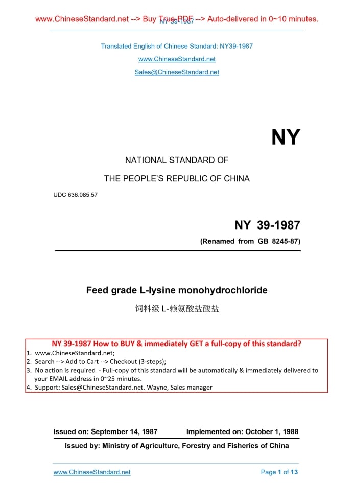 NY 39-1987: Feed grade L-lysine monohydrochloride Delivery: 9 seconds. True-PDF full-copy in English & invoice will be downloaded + auto-delivered via email. See step-by-step procedure