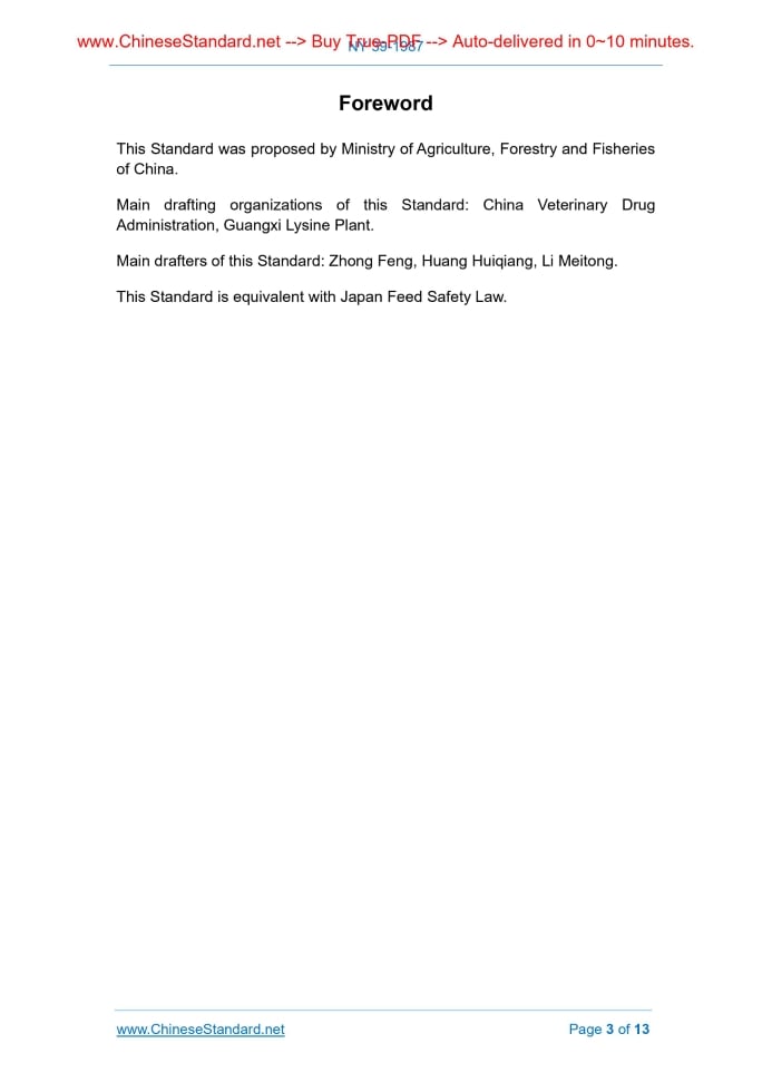 NY 39-1987: Feed grade L-lysine monohydrochloride---This is an excerpt. Full copy of true-PDF in English version (including equations, symbols, images, flow-chart, tables, and figures etc.), auto-downloaded/delivered in 9 seconds, can be purchased online: https://www.ChineseStandard.net/PDF.aspx/NY39-1987NY NATIONAL STANDARD OF THE PEOPLE’S REPUBLIC OF CHINA UDC 636.085.57 (Renamed from GB 8245-87) Feed grade L-lysine monohydrochloride 饲料级 L-赖氨酸盐酸盐 Issued on: SEPTEMBER 14, 1987 Implemented on: OCTOBER 1, 1988 Issued by. Ministry of Agriculture, Forestry and Fisheries of China Table of ContentsForeword... 3 1 Technical requirements... 4 2 Test method... 4 3 Acceptance rules... 11 4 Packaging, marks, storage and transport... 11 Additional information... 12 Corrigendum -- GB 8245-87 Feed grade L-lysine monohydrochloride... 13ForewordThis Standard was proposed by Ministry of Agriculture, Forestry and Fisheries of China. Main drafting organizations of this Standard. China Veterinary Drug Administration, Guangxi Lysine Plant. Main drafters of this Standard. Zhong Feng, Huang Huiqiang, Li Meitong. This Standard is equivalent with Japan Feed Safety Law. analytical reagents and distilled water, or water of corresponding purity. In the absence of other requirements, the standard solution used shall be in accordance with GB 601-77 Standard solution preparation method; the impurity standard solution shall be in accordance with GB 602-77 Impurity standard solution preparation method; Preparation and products shall be prepared according to GB 603-77 Preparation method for preparation and products. 2.1 Identification 2.1.1 Reagents and solutions 2.1.1.1 Ninhydrin (HG 3-984-76). 0.1% (m/V) solution; 2.1.1.2 Silver nitrate (GB 670-77). 0.1 mol/l solution; 2.1.1.3 Nitric acid (GB 626-78). 1+9 solution; 2.1.1.4 Ammonium hydroxide (GB 631-77). 1+2 solution. 2.1.2 Identification method 2.1.2.1 Identification of amino acid Weigh 0.1 g of specimen. Dissolve it in 100 ml of water. Take 5 ml of this solution. Add 1 ml of ninhydrin solution (2.1.1.1). After heating for 3 min, add 20 ml of water. Place it still for 15 min. The solution shall look reddish purple. 2.1.2.2 Identification of chloride Weigh 1 g of specimen. Dissolve it in 10 ml of water. Add silver nitrate solution (2.1.1.2), white precipitate shall be generated. Take this precipitate and add dilute nitric acid (2.1.1.3). The precipitate shall not be solved. Take this precipitate added with excessive ammonium hydroxide solution, it shall dissolve. 2.2 Determination of lysine hydrochloride content 2.2.1 Reagents and solutions 2.2.1.1 Formic acid (HG 3-1296-80); 2.2.1.2 Glacial acetic acid (GB 676-78) 2.2.1.3 Mercuric acetate (HG 3-1096-77). 6% (m/V) glacial acetic acid solution; 2.2.1.4 α- Naphthol phenylmethanol indicator. 0.2% (m/V) glacial acetic acid solution; where, m - specimen mass before drying, g; m1 - specimen mass after drying, g. 2.5 Determination of burning residue 2.5.1 Instruments and equipment 2.5.1.1 High temperature furnace. the controllable temperature is 550±20°C; 2.5.1.2 Porcelain crucible. 30 ml; 2.5.1.3 Dryer. using calcium chloride or silica gel as desiccant. 2.5.2 Determination method In the porcelain crucible which has been burnt to constant weight, weigh 1 g of specimen, to the neatest of 0.0002 g. Carbonize it in the electric furnace carefully till there is no black smoke. Then transfer it to the high temperature furnace for 3 ~ 4 hour burning at 550°C. Take it out. Cool it for a while then put it into the dryer. Cool it to room temperature. Weigh it. Repeat burning for 1h and weigh till constant weight. 2.5.3 Calculation of results The percentage of burning residue of L-lysine monohydrochloride shall be calculated according to equation (4). where, m - specimen mass, g; m1 - mass of empty constant weight crucible, g; m2 - mass of ash and crucible, g. 2.6 Determination of ammonium salt 2.6.1 Reagents and solutions 2.6.1.1 Magnesium oxide (HG 3-1294-80); according to the provisions of GB 602-77 then accurately dilute it to 10 times. 2.7.2 Determination method Weigh 1 g of specimen, to the nearest of 0.01 g. Place it in the porcelain crucible. Carefully carbonize it on the electric furnace. Burn it at 550°C for 3h (or use the residual ash after residue determination of sub-clause 2.5). Add 4 ml of hydrochloric acid (2.7.1.1) into the residue. Heat it on the water bath and evaporate to dry. Add 10 ml of hot water and dip for 2min. Transfer all into the Nessler color tube. Add 2 ml of acetic acid solution (2.7.1.2). Use water to dilute it to 50 ml. Add 2 drops of sodium sulfide solution (2.7.1.3). Place it for 5min. Pipette 3 ml of lead standard solution (2.7.1.4). Take the same color as the sample as a standard. The color of the sample solution must not be deeper than this standard solution. 2.8 Determination of arsenic 2.8.1 Reagents and solutions 2.8.1.1 Hydrochloric acid (GB 622-77). 1+1 solution; 2.8.1.2 Potassium iodide (GB 1272-77). 16.5% (m/V) solution; 2.8.1.3 Stannous chloride (GB 638-78). 40% (m/V) hydrochloric acid solution, effective within one month; 2.8.1.4 Arsenic-free metal zinc (GB 2304-80); 2.8.1.5 Lead acetate skimmed cotton; 2.8.1.6 Mercury bromide test paper; 2.8.1.7 Arsenic standard solution. 0.01 mg of As contained in 1 ml. Prepare it according to the provisions of GB 602-77 then accurately dilute it to 10 times when required. 2.8.2 Determination method Pipette 1 g of specimen, to the nearest of 0.01 g. Place it in a wild-mouth jar. Determine it according to the provisions of “1 Arsenic spot method” in GB 610- 77 Arsenic determination. Its color must not be deeper than the standard one. Pipette 2 ml of arsenic standard solution (2.8.1.7). Process it same with specimen simultaneously as standard. exceed 25 kg. 4.2 The packaging shall have a solid mark, indicating product name, manufacture’s name and address, lot number, approval file number, storage conditions, use method, net 