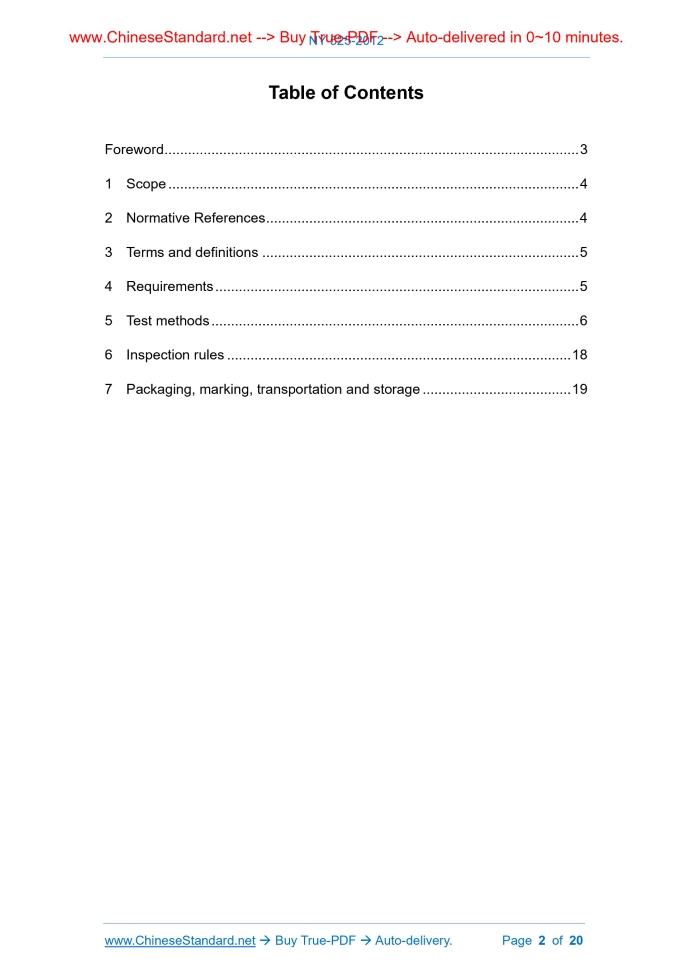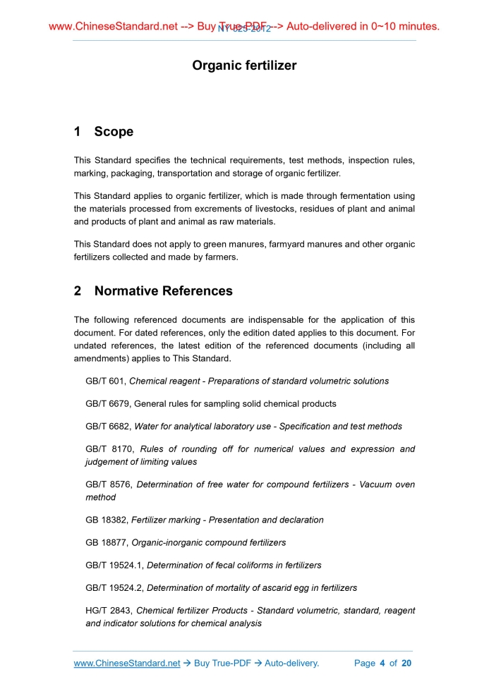 NY 525-2012: Organic fertilizer---This is an excerpt. Full copy of true-PDF in English version (including equations, symbols, images, flow-chart, tables, and figures etc.), auto-downloaded/delivered in 9 seconds, can be purchased online: https://www.ChineseStandard.net/PDF.aspx/NY525-2012NY AGRICULTURAL INDUSTRY STANDARD ICS 65.080 B 10 Replacing NY 525-2011 Organic fertilizer Issued on: MARCH 1, 2012 Implemented on: JUNE 1, 2012 Issued by. Ministry of Agriculture of the People’s Republic of China Table of ContentsForeword. 3 1 Scope.. 4 2 Normative References. 4 3 Terms and definitions.. 5 4 Requirements.. 5 5 Test methods.. 6 6 Inspection rules.. 18 7 Packaging, marking, transportation and storage. 19 Organic fertilizer 1 Scope This Standard specifies the technical requirements, test methods, inspection rules, marking, packaging, transportation and storage of organic fertilizer. This Standard applies to organic fertilizer, which is made through fermentation using the materials processed from excrements of livestocks, residues of plant and animal and products of plant and animal as raw materials. This Standard does not apply to green manures, farmyard manures and other organic fertilizers collected and made by farmers. 2 Normative References The following referenced documents are indispensable for the application of this document. For dated references, only the edition dated applies to this document. For undated references, the latest edition of the referenced documents (including all amendments) applies to This Standard. GB/T 601, Chemical reagent - Preparations of standard volumetric solutions GB/T 6679, General rules for sampling solid chemical products GB/T 6682, Water for analytical laboratory use - Specification and test methods GB/T 8170, Rules of rounding off for numerical values and expression and judgement of limiting values GB/T 8576, Determination of free water for compound fertilizers - Vacuum oven method GB 18382, Fertilizer marking - Presentation and declaration GB 18877, Organic-inorganic compound fertilizers GB/T 19524.1, Determination of fecal coliforms in fertilizers GB/T 19524.2, Determination of mortality of ascarid egg in fertilizers HG/T 2843, Chemical fertilizer Products - Standard volumetric, standard, reagent and indicator solutions for chemical analysis Weigh 39.23 g of potassium dichromate (analytically pure); use a small amount of water to dissolve; transfer to a 1 L volumetric flask; dilute to scale; and shake up as standby. 5.2.3.5 Ferrous sulfate (FeSO4) standard solution. c(FeSO4) = 0.2 mol/L. Weigh 55.6 g of (FeSO4·7H2O) (analytically pure); dissolve in 900 mL of water; add 20 mL of sulfuric acid (5.2.3.2) to dissolve; dilute to 1 L; and shake up as standby (filter if necessary). The accurate concentration of the solution is calibrated using 0.1 mol/L potassium dichromate standard solution (5.2.3.3); and carry out calibration immediately prior to use. The calibration of c(FeSO4) = 0.2 mol/L standard solution. absorb 20.00 mL of potassium dichromate standard solution (5.2.3.3) to add to a 150 mL triangular flask; add 3 mL ~ 5 mL of sulfuric acid (5.2.3.2) and 2 drops ~ 3 drops of phenanthroline indicator (5.2.3.6); and use ferrous sulfate standard solution (5.2.3.5) for titration. Based on the consumption of ferrous sulfate standard solution at the time of titration, calculate its accurate concentration c in accordance with Equation (1). where, c1 -- concentration of potassium dichromate standard solution, in mol/L; V1 -- volume of potassium dichromate standard solution absorbed, in mL; V2 -- volume of ferrous sulfate standard solution at the time of titration, in mL. 5.2.3.6 Phenanthroline indicator Weigh 0.695 g of ferrous sulfate (analytically pure) and 1.485 g of phenanthroline (analytically pure) to dissolve in 100 mL of water; and shake up as standby. The indicator is perishable, so it shall be sealed and stored in a brown bottle. 5.2.4 Determination procedures Weigh 0.2 g ~ 0.5 g (accurate to 0.000 1 g) of air-dried sample that has been screened through Mesh Φ 1 mm; place in a 500 mL triangular flask; accurately add 50.0 mL of 0.8 mol/L potassium dichromate solution (5.2.3.4); then add 50.0 mL of concentrated sulfuric acid (5.2.3.2); add a bent neck small funnel; place in boiling water; and maintain for 30 min after water is boiling. Take out and cool to room temperature; use water to rinse the small funnel; and contain the washings into the triangular flask. Take down the triangular flask; transfer the reactant nondestructively into a 250 mL volumetric flask; cool to room temperature; add dropwise to scale; absorb 50.0 mL of the solution to pour into a 250 mL triangular flask; add water approximately to 100 mL; add 2 drops ~ 3 drops of phenanthroline indicator (5.2.3.6); use 0.2 mol/L ferrous sulfate standard solution (5.2.3.5) to titrate to the end when the solution turns from certain acidity, the phosphate anions in the solution to be tested reacts with metavanadic acid and molybdic acid to generate yellow ternary heteropoly acid. Within a certain concentration range [1 mg/L ~ 20 mg/L], the absorbance and the phosphorus content of the yellow solution are in a direct proportion relationship; and then use the spectrophotometric method to quantify phosphorus. 5.4.2 Reagents 5.4.2.1 Sulfuric acid (ρ1.84). 5.4.2.2 Nitric acid. 5.4.2.3 30% hydrogen peroxide. 5.4.2.4 Vanadium ammonium molybdate reagent. Solution A. weigh 25.0 g of ammonium molybdate to dissolve in 400 mL of water. Solution B. weigh 1.25 g of ammonium metavanadate to dissolve in 300 mL of boiling water; add 250 mL of nitric acid (5.4.2.2) after cooling; and cool. Inject solution A slowly into solution B while stirring; use water to dilute to 1 L; mix up; and store in a brown bottle. 5.4.2.5 Sodium hydroxide solution. a solution of mass concentration 10%. 5.4.2.6 Sulfuric acid (5.4.2.1). a solution of volume fraction 5%. 5.4.2.7 Phosphoric acid solution. 50 μg/mL. Weigh 0.219 5 g 