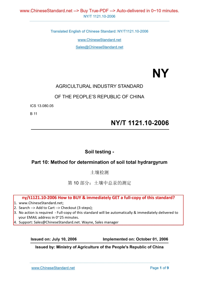 NY/T 1121.10-2006: Soil Testing. Part 10: Method for determination of soil total hydrargyrum Delivery: 9 seconds. True-PDF full-copy in English & invoice will be downloaded + auto-delivered via email. See step-by-step procedure