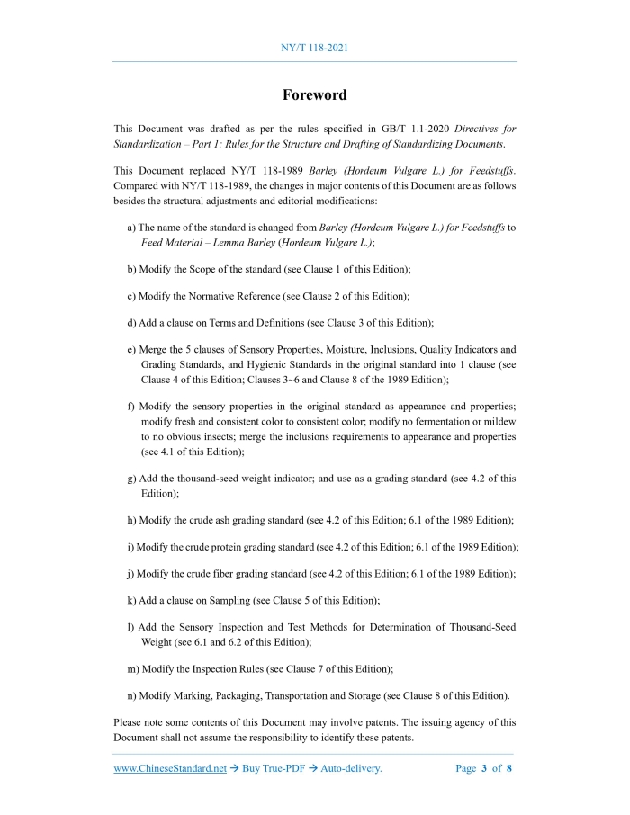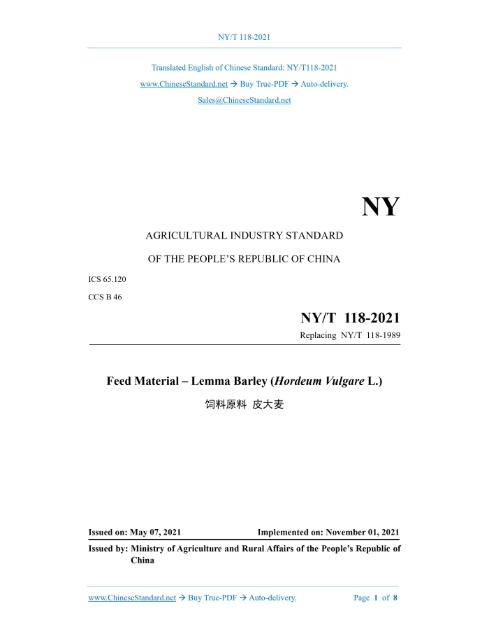 NY/T 118-2021: Feed material - Lemma Barley (Hordeum vulgare L. )---This is an excerpt. Full copy of true-PDF in English version (including equations, symbols, images, flow-chart, tables, and figures etc.), auto-downloaded/delivered in 9 seconds, can be purchased online: https://www.ChineseStandard.net/PDF.aspx/NYT118-2021NY AGRICULTURAL INDUSTRY STANDARD OF THE PEOPLE’S REPUBLIC OF CHINA ICS 65.120 CCS B 46 Replacing NY/T 118-1989 Feed Material – Lemma Barley (Hordeum Vulgare L.) ISSUED ON: MAY 07, 2021 IMPLEMENTED ON: NOVEMBER 01, 2021 Issued by: Ministry of Agriculture and Rural Affairs of the People’s Republic of China Table of ContentsForeword ... 3 1 Scope ... 5 2 Normative References ... 5 3 Terms and Definitions ... 5 4 Requirements ... 6 5 Sampling ... 6 6 Test Methods ... 6 7 Inspection Rules ... 7 8 Labeling, Packaging, Transportation and Storage ... 7ForewordThis Document was drafted as per the rules specified in GB/T 1.1-2020 Directives for Standardization – Part 1: Rules for the Structure and Drafting of Standardizing Documents. This Document replaced NY/T 118-1989 Barley (Hordeum Vulgare L.) for Feedstuffs. Compared with NY/T 118-1989, the changes in major contents of this Document are as follows besides the structural adjustments and editorial modifications: a) The name of the standard is changed from Barley (Hordeum Vulgare L.) for Feedstuffs to Feed Material – Lemma Barley (Hordeum Vulgare L.); b) Modify the Scope of the standard (see Clause 1 of this Edition); c) Modify the Normative Reference (see Clause 2 of this Edition); d) Add a clause on Terms and Definitions (see Clause 3 of this Edition); e) Merge the 5 clauses of Sensory Properties, Moisture, Inclusions, Quality Indicators and Grading Standards, and Hygienic Standards in the original standard into 1 clause (see Clause 4 of this Edition; Clauses 3~6 and Clause 8 of the 1989 Edition); f) Modify the sensory properties in the original standard as appearance and properties; modify fresh and consistent color to consistent color; modify no fermentation or mildew to no obvious insects; merge the inclusions requirements to appearance and properties (see 4.1 of this Edition); g) Add the thousand-seed weight indicator; and use as a grading standard (see 4.2 of this Edition); h) Modify the crude ash grading standard (see 4.2 of this Edition; 6.1 of the 1989 Edition); i) Modify the crude protein grading standard (see 4.2 of this Edition; 6.1 of the 1989 Edition); j) Modify the crude fiber grading standard (see 4.2 of this Edition; 6.1 of the 1989 Edition); k) Add a clause on Sampling (see Clause 5 of this Edition); l) Add the Sensory Inspection and Test Methods for Determination of Thousand-Seed Weight (see 6.1 and 6.2 of this Edition); m) Modify the Inspection Rules (see Clause 7 of this Edition); n) Modify Marking, Packaging, Transportation and Storage (see Clause 8 of this Edition). Please note some contents of this Document may involve patents. The issuing agency of this Document shall not assume the responsibility to identify these patents. Feed Material – Lemma Barley (Hordeum Vulgare L.)1 ScopeThis Document specifies the requirements, sampling, test methods, inspection rules, labeling, packaging, transportation and storage of lemma barley as feed material. This Document applies to lemma barley as feed material, i.e., hulled barley kernels.2 Normative ReferencesThe provisions in following documents become the essential provisions of this Document through reference in this Document. For the dated documents, only the versions with the dates indicated are applicable to this Document; for the undated documents, only the latest version (including all the amendments) is applicable to this Document. GB 5009.3 National Food Safety Standard - Determination of Moisture Content in Foods GB/T 5519-2018 Cereals and pulses – determination of mass of 1000 grains GB/T 6432 Determination of crude protein in feeds - Kjeldahl method GB/T 6434 Feeding stuffs - Determination of crude fiber content - Method with intermediate GB/T 6438 Animal feeding stuffs—Determination of crude ash GB/T 8170 Rules of rounding off for numerical values & expression and judgement of limiting values GB 13078 Hygienical standards for feeds GB/T 14699.1 Feeding stuffs – Sampling GB/T 18823 Permitted tolerant for judgement of testing results in feeds3 Terms and DefinitionsFor the purposes of this Document, no terms or definitions apply. 6.3 Crude ash It shall be implemented according to the provisions of GB/T 6438. 6.4 Crude protein It shall be implemented according to the provisions of GB/T 6432. 6.5 Crude fiber It shall be implemented according to the provisions of GB/T 6434. 6.6 Moisture It shall be implemented according to the provisions of GB 5009.3.7 Inspection Rules7.1 Batching The lemma barley of the same type, origin, year of harvest, storage unit or transportation unit shall be one batch; but each batch shall not exceed 100 t. 7.2 Judgment rules 7.2.1 All the inspected items meet the requirements of Clause 4. If there are grading indicator requirements, they must all meet the requirements of the corresponding grade; and then the product of this grade is judged to be qualified. 7.2.2 If any indicator in the inspection results does not meet the requirements of this Document, re-inspection can be carried out by double sampling from the same batch of products. If the re- inspection results still do not meet the requirements of this Document, it is determined that this batch of products is unqualified. Microbiological indicators shall not be re-inspected. 7.2.3 The allowable error for the test results of the determination of physical and chemical indicator shall be in accordance with the provisions of GB/T 18823. 7.2.4 The determination of the limit value of each item indicator shall be carried out according to the full value comparison method in GB/T 8170.8 Labeling, Packaging, Transportation and Storage8.1 Labeling The name, type, grade