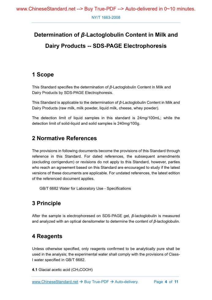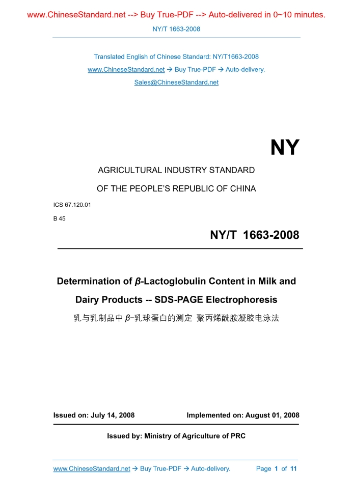 NY/T 1663-2008: Determination of ��-lactoglobulin content in milk and dairy products SDS-PAGE electrophoresi Delivery: 9 seconds. True-PDF full-copy in English & invoice will be downloaded + auto-delivered via email. See step-by-step procedure Status: Valid
