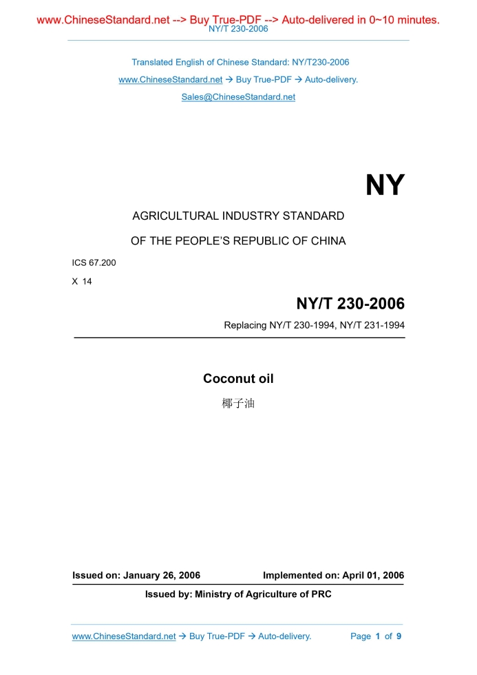 NY/T 230-2006: Coconut oil Delivery: 9 seconds. True-PDF full-copy in English & invoice will be downloaded + auto-delivered via email. See step-by-step procedure Status: Valid NY/T 230: Historical versions
