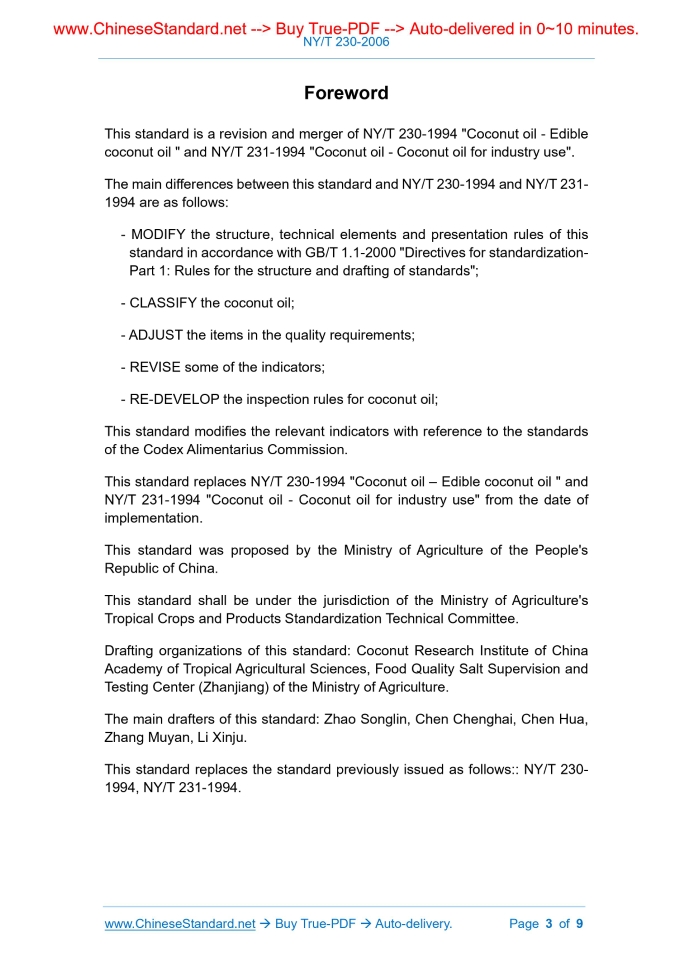 NY/T 230-2006: Coconut oil---This is an excerpt. Full copy of true-PDF in English version (including equations, symbols, images, flow-chart, tables, and figures etc.), auto-downloaded/delivered in 9 seconds, can be purchased online: https://www.ChineseStandard.net/PDF.aspx/NYT230-2006AGRICULTURAL INDUSTRY STANDARD ICS 67.200 X 14 Replacing NY/T 230-1994, NY/T 231-1994 Coconut oil Issued on. JANUARY 26, 2006 Implemented on. APRIL 01, 2006 Issued by. Ministry of Agriculture of PRC Table of ContentsForeword... 3 1 Scope... 4 2 Normative references... 4 3 Terms and definitions... 5 4 Classification... 5 5 Technical quality requirements... 5 6 Inspection methods... 7 7 Inspection rules... 8 8 Labels... 9 9 Packaging, storage and transportation... 9ForewordThis standard is a revision and merger of NY/T 230-1994 "Coconut oil - Edible coconut oil " and NY/T 231-1994 "Coconut oil - Coconut oil for industry use". The main differences between this standard and NY/T 230-1994 and NY/T 231- 1994 are as follows. - MODIFY the structure, technical elements and presentation rules of this standard in accordance with GB/T 1.1-2000 "Directives for standardization- Part 1.Rules for the structure and drafting of standards"; - CLASSIFY the coconut oil; - ADJUST the items in the quality requirements; - REVISE some of the indicators; - RE-DEVELOP the inspection rules for coconut oil; This standard modifies the relevant indicators with reference to the standards of the Codex Alimentarius Commission. This standard replaces NY/T 230-1994 "Coconut oil – Edible coconut oil " and NY/T 231-1994 "Coconut oil - Coconut oil for industry use" from the date of implementation. This standard was proposed by the Ministry of Agriculture of the People's Republic of China. This standard shall be under the jurisdiction of the Ministry of Agriculture's Tropical Crops and Products Standardization Technical Committee. Drafting organizations of this standard. Coconut Research Institute of China Academy of Tropical Agricultural Sciences, Food Quality Salt Supervision and Testing Center (Zhanjiang) of the Ministry of Agriculture. The main drafters of this standard. Zhao Songlin, Chen Chenghai, Chen Hua, Zhang Muyan, Li Xinju. This standard replaces the standard previously issued as follows.. NY/T 230- 1994, NY/T 231-1994. Coconut oil1 ScopeThis standard specifies the definition, classification, quality requirements, test methods, inspection rules and labeling, packaging, storage and transportation of coconut oil. This standard applies to coconut oil which is produced by the coconut meat as raw materials. It is not applicable to the coconut oil produced from other raw materials.2 Normative referencesThe provisions in following documents become the provisions of this Standard through reference in this Standard. For the dated references, the subsequent amendments (excluding corrections) or revisions do not apply to this Standard; however, parties who reach an agreement based on this Standard are encouraged to study if the latest versions of these documents are applicable. For undated references, the latest edition of the referenced document applies. GB 2716 Hygienic standard for edible vegetable oil GB 2760 Hygienic standards for uses of food additives GB/T 5009.37 Method for analysis of hygienic standard of edible oils GB/T 5524 Animal and vegetable fats and oils - Sampling GB/T 5525 Inspection of vegetable oils - Methods for identification of transparency, color, odor and taste GB/T 5526 Inspection of vegetable oils - Methods for determination of specific gravity GB/T 5527 Inspection of vegetable oils - Methods for determination of refractive index GB/T 5528 Method for determination of moisture and volatile matter in vegetable oil and fat GB/T 5529 Inspection of vegetable oils - Methods for determination of foreign matter3 Terms and definitionsThe following terms and definitions apply to the standard. 3.1 Crude coconut oil An oil obtained by the process of pressing or solvent extraction which uses coconut meat as a raw material.4 ClassificationCoconut oil is divided into crude coconut oil and refined coconut oil.5 Technical quality requirements5.1 Characteristic indicators 5.4 Others Coconut oil shall not be mixed with other animal and vegetable oils. Refined coconut oil shall, when observed at 40 °C, be free of sediment and suspended matter.6 Inspection methods6.1 Inspection of smell, taste, color It is performed in accordance with GB/T 5525-1985. 6.2 Inspection of specific gravity It is performed in accordance with GB/T 5526. 6.6 Inspection of acid value It is performed in accordance with GB/T 5530. 6.7 Inspection of iodine value It is performed in accordance with GB/T 5532. 6.8 Inspection of saponification value. It is performed in accordance with GB/T 5534. 6.9 Inspection of unsaponifiable matter. It is performed in accordance with GB/T 5535. 6.10 Inspection of peroxide value. It is performed in accordance with GB/T 5538.7 Inspection rules7.1 Sampling The sampling method of coconut oil is in accordance with the requirements of GB/T 5524. 7.2 Exit-factory inspection 7.2.1 It shall be inspected batch by batch and issue the inspection report. 7.2.2 It is performed in accordance with the items as specified in clause 5.2. 7.3 Type inspection 7.4 Decision rules 7.4.1 When the product is not labeled with coconut oil, it is judged as unqualified. 7.4.2 If one of the test results does not meet the requirements of Chapter 5, it is determined that the product is unqualified.8 LabelsThe coconut oil to be labeled shall meet the requirements of GB 7718.9 Packaging, storage and transportation9.1 Packaging The type, size and appearance requirements of coconut oil’s packaging containers shall be agreed between the supplier and the purchaser. 9.2 Storage Coconut oil shall be stored in a cool, dry and dark place. It shall not be stored together with harmful or toxic substances. NY/T 230-2006 AGRICULTURAL INDUSTRY STANDARD ICS 67.200 X 14 Replacing 