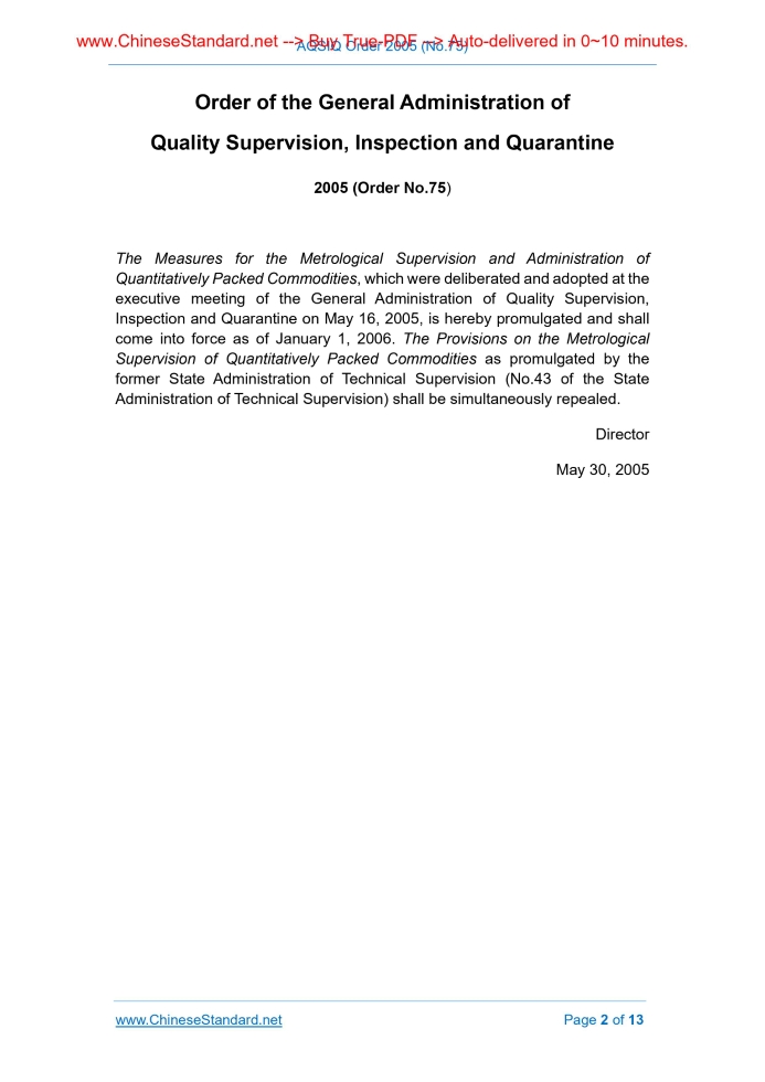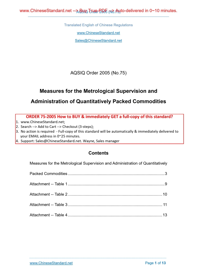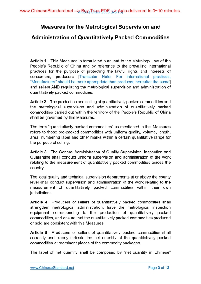 ORDER75-2005 PDF EnglishOrder75-2005: Measures for the Supervision and Management of Quantitative Packaging Commodities---This is an excerpt. Full copy of true-PDF in English version (including equations, symbols, images, flow-chart, tables, and figures etc.), auto-downloaded/delivered in 9 seconds, can be purchased online: https://www.ChineseStandard.net/PDF.aspx/Order75-2005 Measures for the Metrological Supervision and Administration of Quantitatively Packed Commodities Table of ContentsMeasures for the Metrological Supervision and Administration of Quantitatively Packed Commodities ... 3 Attachment -- Table 1 ... 9 Attachment -- Table 2 ... 10 Attachment -- Table 3 ... 11 Attachment -- Table 4 ... 13 Order of the General Administration of Quality Supervision, Inspection and Quarantine 2005 (Order No.75) The Measures for the Metrological Supervision and Administration of Quantitatively Packed Commodities, which were deliberated and adopted at the executive meeting of the General Administration of Quality Supervision, Inspection and Quarantine on May 16, 2005, is hereby promulgated and shall come into force as of January 1, 2006. The Provisions on the Metrological Supervision of Quantitatively Packed Commodities as promulgated by the former State Administration of Technical Supervision (No.43 of the State Administration of Technical Supervision) shall be simultaneously repealed. Director May 30, 2005 Measures for the Metrological Supervision and Administration of Quantitatively Packed Commodities Article 1 This Measures is formulated pursuant to the Metrology Law of the People's Republic of China and by reference to the prevailing international practices for the purpose of protecting the lawful rights and interests of consumers, producers [Translator Note. For international practices, “Manufacturer” should be more appropriate than producer, hereafter the same] and sellers AND regulating the metrological supervision and administration of quantitatively packed commodities. Article 2 The production and selling of quantitatively packed commodities and the metrological supervision and administration of quantitatively packed commodities carried out within the territory of the People's Republic of China shall be governed by this Measures. The term “quantitatively packed commodities” as mentioned in this Measures refers to those pre-packed commodities with uniform quality, volume, length, area, numbering label and other marks within a certain quantitative range for the purpose of selling. Article 3 The General Administration of Quality Supervision, Inspection and Quarantine shall conduct uniform supervision and administration of the work relating to the measurement of quantitatively packed commodities across the country. The local quality and technical supervision departments at or above the county level shall conduct supervision and administration of the work relating to the measurement of quantitatively packed commodities within their own jurisdictions. Article 4 Producers or sellers of quantitatively packed commodities shall strengthen metrological administration, have the metrological inspection equipment corresponding to the production of quantitatively packed commodities, and ensure that the quantitatively packed commodities produced or sold are consistent with this Measures. Article 5 Producers or sellers of quantitatively packed commodities shall correctly and clearly indicate the net quantity of the quantitatively packed commodities at prominent places of the commodity packages. The label of net quantity shall be composed by “net quantity in Chinese” change on net quantity is caused by water change, then the producer shall take measures to ensure the accuracy of net quantity under specified conditions. Article 12 The local quality and technical supervision departments at or above the county level shall conduct metrological supervision and administration to the quantitatively packed commodities produced and to sell. When the quality and technology supervision department conducts the metrological supervision and administration, it shall take full account of the effect on net quantity of quantitatively packed commodities caused by environmental and water changes. Article 13 The inspection on the metrological supervision and administration of quantitatively packed commodities shall be carried out by the authorized metrological certification authority in accordance with Metrological Inspection Rules for Net Quantity of Quantitatively Packed Commodities. The inspection on quantitatively packed commodities shall take account of the reasonable changes of net quantity which may be caused by environmental conditions such as storage and transport. Article 14 When the producer, seller of quantitatively packed commodities use the packaging of commodities, they shall save resources, reduce pollution, and correctly guide consumption. The size of the packaging shall be comparable to the volume of the net quantity of the commodity. It must not use false packaging or deliberately exaggerate the packaging size of quantitatively packed commodities which shall make consumers have misunderstanding on the amount of commodities within the package. Article 15 The state encourages the producers of quantitatively packed commodities to voluntarily participate in the evaluation of metrology assurance ability so as to ensure the integrity of metrology. The provincial quality and technology supervision department, in accordance with the requirements of Evaluation Specification on Metrology Assurance Ability of Manufacturers of Quantitatively Packed Commodities, verifies the producers. The qualified producers shall be filed, issued with the national unified Certificate of Metrology Assurance Ability of Manufacturers of Quantitatively Packed Commodities and shall be permitted to use the national unified qualified sign for metrology assurance ability on their quantitatively packed commodities. Article 16 W