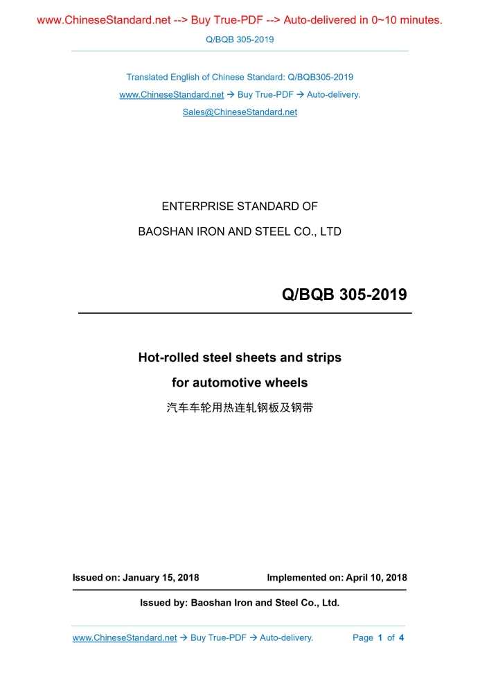 Similar standardsQ/BQB 305-2019: Hot-rolled steel sheets and strips for automotive wheels---This is an excerpt. Full copy of true-PDF in English version (including equations, symbols, images, flow-chart, tables, and figures etc.), auto-downloaded/delivered in 9 seconds, can be purchased online: https://www.ChineseStandard.net/PDF.aspx/QBQB305-2019ENTERPRISE STANDARD OF BAOSHAN IRON AND STEEL CO., LTD Hot-rolled steel sheets and strips for automotive wheels Issued on: JANUARY 15, 2018 Implemented on: APRIL 10, 2018 Issued by. Baoshan Iron and Steel Co., Ltd. Table of Contents1 Chemical composition... 3 2 Mechanical and Process Properties... 3 3 Inspection and Test... 4 ......Source: Above contents are excerpted from the full-copy PDF -- translated/reviewed by: www.ChineseStandard.net / Wayne Zheng et al. |