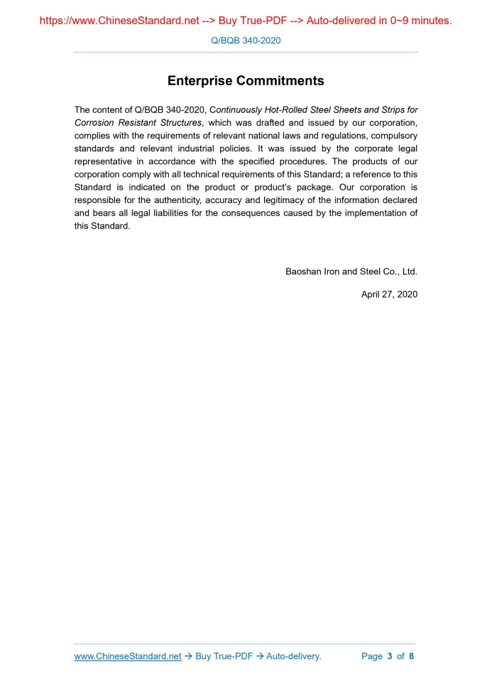 Similar standardsQ/BQB 340-2020: Continuously-hot-rolled steel sheets and strips for corrosion resistant structures---This is an excerpt. Full copy of true-PDF in English version (including equations, symbols, images, flow-chart, tables, and figures etc.), auto-downloaded/delivered in 9 seconds, can be purchased online: https://www.ChineseStandard.net/PDF.aspx/QBQB340-2020 BQB ENTERPRISE STANDARD OF BAOSHAN IRON AND STEEL CO., LTD Continuously Hot-Rolled Steel Sheets and Strips for Corrosion Resistant Structures Issued on. April 27, 2020 Issued by. Baoshan Iron and Steel Co., Ltd. Table of ContentsEnterprise Commitments... 3 Technical Indexes 1... 4 1 Chemical Compositions... 5 2 Mechanical and Process Properties... 6 3 Inspection and Test... 7 Enterprise Commitments The content of Q/BQB 340-2020, Continuously Hot-Rolled Steel Sheets and Strips for Corrosion Resistant Structures, which was drafted and issued by our corporation, complies with the requirements of relevant national laws and regulations, compulsory standards and relevant industrial policies. It was issued by the corporate legal representative in accordance with the specified procedures. The products of our corporation comply with all technical requirements of this Standard; a reference to this Standard is indicated on the product or product’s package. Our corporation is responsible for the authenticity, accuracy and legitimacy of the information declared and bears all legal liabilities for the consequences caused by the implementation of this Standard. Baoshan Iron and Steel Co., Ltd. April 27, 2020 ......Source: Above contents are excerpted from the full-copy PDF -- translated/reviewed by: www.ChineseStandard.net / Wayne Zheng et al. |