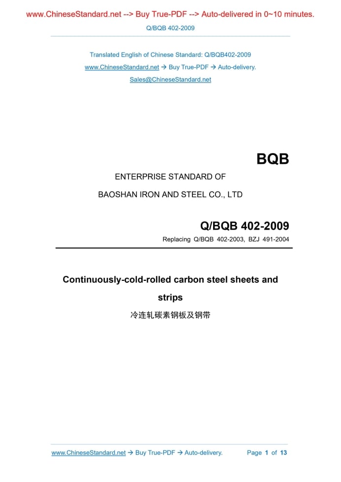 Q/BQB 402-2009: Cold-rolled carbon steel and steel strip Delivery: 9 seconds. True-PDF full-copy in English & invoice will be downloaded + auto-delivered via email. See step-by-step procedure Status: Obsolete