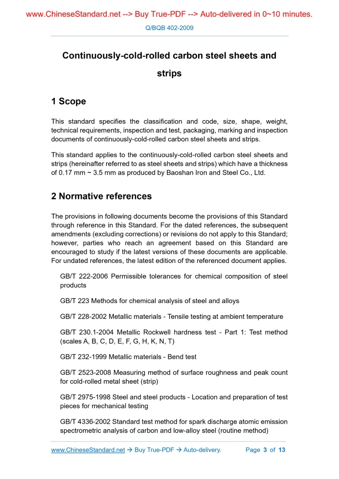Similar standardsQ/BQB 402-2009: Cold-rolled carbon steel and steel strip---This is an excerpt. Full copy of true-PDF in English version (including equations, symbols, images, flow-chart, tables, and figures etc.), auto-downloaded/delivered in 9 seconds, can be purchased online: https://www.ChineseStandard.net/PDF.aspx/QBQB402-2009BQB ENTERPRISE STANDARD OF BAOSHAN IRON AND STEEL CO., LTD Replacing Q/BQB 402-2003, BZJ 491-2004 Continuously-cold-rolled carbon steel sheets and strips Table of Contents1 Scope... 3 2 Normative references... 3 3 Classification and code... 4 4 Information required for ordering... 5 5 Dimension, shape, weight and allowable deviation... 6 6 Technical requirements... 6 7 Inspection and test... 10 8 Packaging, marking and inspection documents... 11 9 Numerical rounding rules... 11 10 Approximate comparison of designation... 11 Appendix A (Informative) Approximate comparison between the designations of this standard and domestic and foreign standard... 12 Additional information... 12 Continuously-cold-rolled carbon steel sheets and strips1 ScopeThis standard specifies the classification and code, size, shape, weight, technical requirements, inspection and test, packaging, marking and inspection documents of continuously-cold-rolled carbon steel sheets and strips. This standard applies to the continuously-cold-rolled carbon steel sheets and strips (hereinafter referred to as steel sheets and strips) which have a thickness of 0.17 mm ~ 3.5 mm as produced by Baoshan Iron and Steel Co., Ltd.2 Normative referencesThe provisions in following documents become the provisions of this Standard through reference in this Standard. For the dated references, the subsequent amendments (excluding corrections) or revisions do not apply to this Standard; however, parties who reach an agreement based on this Standard are encouraged to study if the latest versions of these documents are applicable. For undated references, the latest edition of the referenced document applies. GB/T 222-2006 Permissible tolerances for chemical composition of steel products GB/T 223 Methods for chemical analysis of steel and alloys GB/T 228-2002 Metallic materials - Tensile testing at ambient temperature GB/T 230.1-2004 Metallic Rockwell hardness test - Part 1.Test method (scales A, B, C, D, E, F, G, H, K, N, T) GB/T 232-1999 Metallic materials - Bend test GB/T 2523-2008 Measuring method of surface roughness and peak count for cold-rolled metal sheet (strip) GB/T 2975-1998 Steel and steel products - Location and preparation of test pieces for mechanical testing GB/T 4336-2002 Standard test method for spark discharge atomic emission spectrometric analysis of carbon and low-alloy steel (routine method) GB/T 4340.1-1999 Metallic materials - Vickers hardness test - Part 1.Test method3 Classification and code3.1 The classification of steel sheets and strips according to use shall comply with the requirements in Table 1. 3.3 The classification of steel sheets and strips according to the surface structure shall meet the requirements in Table 3. 3.4 The classification of steel sheets and strips according to the type of heat treatment shall meet the requirements in Table 4.4 Information required for ordering4.1 The user shall provide the following information when ordering. 4.2 If the dimension and unevenness accuracy, heat treatment type, surface structure, surface quality level, edge status and packaging method are not specified in the order contract, the product under this standard is supplied based on the common dimension and unevenness accuracy,5 Dimension, shape, weight and allowable deviationThe size, shape, weight and allowable deviation of steel sheets and steel strips shall comply with the requirements of Q/BQB 401.6 Technical requirements6.1 Chemical composition 6.1.1 The chemical composition (smelting analysis) of steel shall meet the requirements of Table 5. Table 5 6.3 Delivery status 6.3.1 Steel sheets and steel strips are supplied by heat treatment after continuously-cold-rolling. The type of heat treatment shall meet the requirements in Table 4. 6.4 Mechanical properties 6.4.1 The mechanical properties of annealed and flattened steel sheets and strips shall meet the requirements of Table 6. 6.4.3 Hardness For 1/8 hard, 1/4 hard and hard steel sheets and strips, the hardness (HRB or HV) shall meet the requirements of Table 7. 6.7 Surface quality 6.7.1 The surface of steel sheets and strips shall not have scars, cracks, inclusions, etc. which are harmful to use; the steel sheets and strips shall not be delaminated. 6.7.2 The characteristics of each surface quality level of steel sheets and strips shall comply with the requirements in Table 10. 6.8 Surface structure When the surface structure is pitted (D), the average roughness Ra is controlled by 0.6 µm < Ra ≤ 1.9 µm; when the surface structure is bright surface (B), the average roughness Ra is controlled by Ra ≤ 0.9 µm.7 Inspection and test7.1 The appearance of steel sheets and strips shall be visually inspected. 7.2 The dimensions and shapes of steel sheets and strips shall be measured by suitable measuring tools. 7.3 The r value is calculated at 15% strain. When the uniform elongation is less than 15%, it is calculated based on the strain value at the end of the uniform elongation. 7.6 For the tensile, plastic strain ratio (r value), hardness, bend tests, if any test results do not meet the standard requirements, it shall double the number of samples from the same batch and re-test the unqualified item.8 Packaging, marking and inspection documentsThe packaging, marking and inspection documents of steel sheets and strips shall comply with Q/BQB 400.If the purchaser has special requirements for the weight of the package, it shall be specified in the contract.9 Numerical rounding rulesNumerical rounding rules shall comply with the provisions of GB/T 8170.10 Approximate comparison of designationThe approximate comparison between the designat