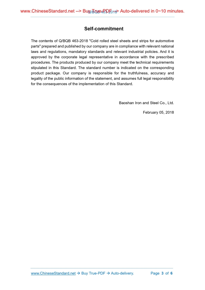 Similar standardsQ/BQB 463-2018: Cold rolled steel sheets and strips for automotive parts---This is an excerpt. Full copy of true-PDF in English version (including equations, symbols, images, flow-chart, tables, and figures etc.), auto-downloaded/delivered in 9 seconds, can be purchased online: https://www.ChineseStandard.net/PDF.aspx/QBQB463-2018BQB ENTERPRISE STANDARD OF BAOSTEEL Cold rolled steel sheets and strips for automotive parts Issued on. February 05, 2018 Issued by. Baoshan Iron and Steel Co., Ltd. Table of ContentsSelf-commitment... 3 Technical indicator 1... 4 1 Original steel type and chemical composition... 5 2 Mechanical properties... 5 3 Inspection and test... 5 Self-commitment The contents of Q/BQB 463-2018 "Cold rolled steel sheets and strips for automotive parts" prepared and published by our company are in compliance with relevant national laws and regulations, mandatory standards and relevant industrial policies. And it is approved by the corporate legal representative in accordance with the prescribed procedures. The products produced by our company meet the technical requirements stipulated in this Standard. The standard number is indicated on the corresponding product package. Our company is responsible for the truthfulness, accuracy and legality of the public information of the statement, and assumes full legal responsibility for the consequences of the implementation of this Standard. Baoshan Iron and Steel Co., Ltd. February 05, 2018 Technical indicator 1 Indicator name. Main indicators such as chemical composition and mechanical properties Indicator requirements. See the attachment for main indicators and test methods such as chemical composition and mechanical properties (See Page 4) ......Source: Above contents are excerpted from the full-copy PDF -- translated/reviewed by: www.ChineseStandard.net / Wayne Zheng et al. |