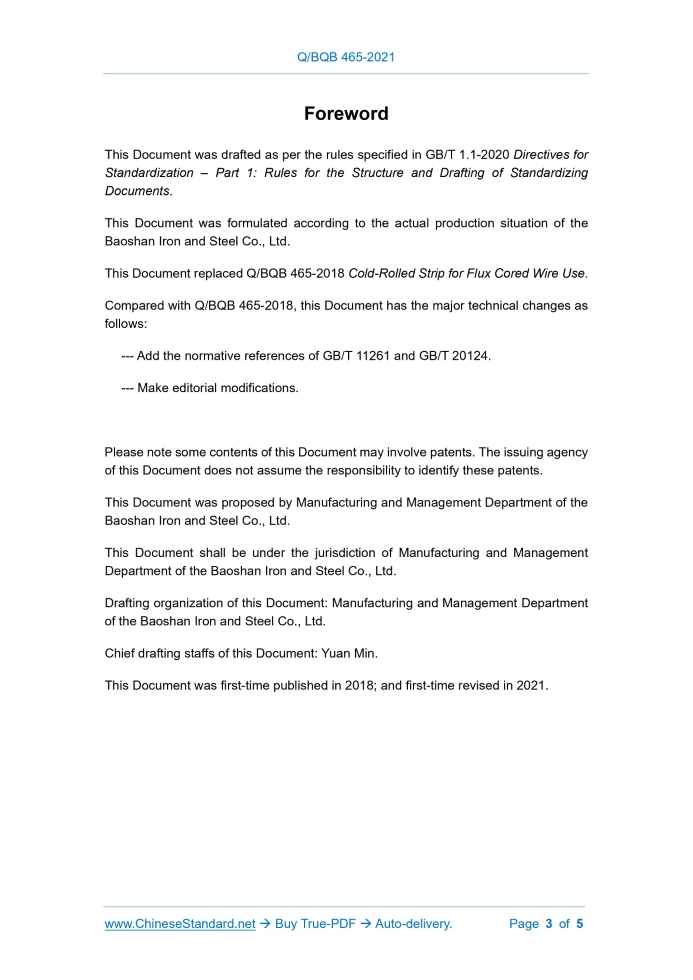 Similar standardsQ/BQB 465-2021: Cold-rolled strip for flux cored wire use---This is an excerpt. Full copy of true-PDF in English version (including equations, symbols, images, flow-chart, tables, and figures etc.), auto-downloaded/delivered in 9 seconds, can be purchased online: https://www.ChineseStandard.net/PDF.aspx/QBQB465-2021BQB ENTERPRISE STANDARD OF BAOSHAN IRON AND STEEL CO., LTD Replacing Q/BQB 465-2018 Cold-Rolled Strip for Flux Cored Wire Use Issued on: JUNE 04, 2021 Implemented on: AUGUST 10, 2021 Issued by. Baoshan Iron and Steel Co., Ltd. Table of ContentsForeword... 3 1 Chemical composition... 4 2 Mechanical properties... 4 3 Inspection and test... 5ForewordThis Document was drafted as per the rules specified in GB/T 1.1-2020 Directives for Standardization – Part 1.Rules for the Structure and Drafting of Standardizing Documents. This Document was formulated according to the actual production situation of the Baoshan Iron and Steel Co., Ltd. This Document replaced Q/BQB 465-2018 Cold-Rolled Strip for Flux Cored Wire Use. Compared with Q/BQB 465-2018, this Document has the major technical changes as follows. --- Add the normative references of GB/T 11261 and GB/T 20124. --- Make editorial modifications. Please note some contents of this Document may involve patents. The issuing agency of this Document does not assume the responsibility to identify these patents. This Document was proposed by Manufacturing and Management Department of the Baoshan Iron and Steel Co., Ltd. This Document shall be under the jurisdiction of Manufacturing and Management Department of the Baoshan Iron and Steel Co., Ltd. Drafting organization of this Document. Manufacturing and Management Department of the Baoshan Iron and Steel Co., Ltd. Chief drafting staffs of this Document. Yuan Min. This Document was first-time published in 2018; and first-time revised in 2021. ......Source: Above contents are excerpted from the full-copy PDF -- translated/reviewed by: www.ChineseStandard.net / Wayne Zheng et al. |