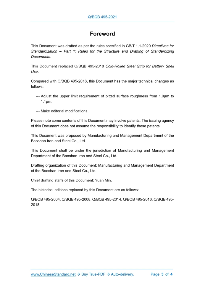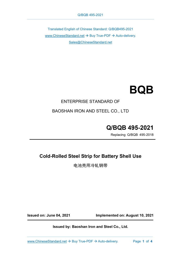 Similar standardsQ/BQB 495-2021: Cold-rolled steel strip for welded pipe use---This is an excerpt. Full copy of true-PDF in English version (including equations, symbols, images, flow-chart, tables, and figures etc.), auto-downloaded/delivered in 9 seconds, can be purchased online: https://www.ChineseStandard.net/PDF.aspx/QBQB495-2021BQB ENTERPRISE STANDARD OF BAOSHAN IRON AND STEEL CO., LTD Replacing Q/BQB 495-2018 Cold-Rolled Steel Strip for Battery Shell Use Issued on: JUNE 04, 2021 Implemented on: AUGUST 10, 2021 Issued by. Baoshan Iron and Steel Co., Ltd. Table of ContentsForeword... 3 1 Chemical composition... 4 2 Mechanical properties... 4 3 Inspection and test... 4ForewordThis Document was drafted as per the rules specified in GB/T 1.1-2020 Directives for Standardization – Part 1.Rules for the Structure and Drafting of Standardizing Documents. This Document replaced Q/BQB 495-2018 Cold-Rolled Steel Strip for Battery Shell Use. Compared with Q/BQB 495-2018, this Document has the major technical changes as follows. --- Adjust the upper limit requirement of pitted surface roughness from 1.0μm to 1.1μm; --- Make editorial modifications. Please note some contents of this Document may involve patents. The issuing agency of this Document does not assume the responsibility to identify these patents. This Document was proposed by Manufacturing and Management Department of the Baoshan Iron and Steel Co., Ltd. This Document shall be under the jurisdiction of Manufacturing and Management Department of the Baoshan Iron and Steel Co., Ltd. Drafting organization of this Document. Manufacturing and Management Department of the Baoshan Iron and Steel Co., Ltd. Chief drafting staffs of this Document. Yuan Min. The historical editions replaced by this Document are as follows. Q/BQB 495-2004, Q/BQB 495-2008, Q/BQB 495-2014, Q/BQB 495-2016, Q/BQB 495- 2018. ......Source: Above contents are excerpted from the full-copy PDF -- translated/reviewed by: www.ChineseStandard.net / Wayne Zheng et al. |